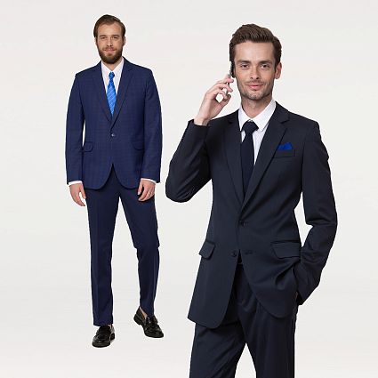Классические модели шьют из шерсти, однако для пошива современных деловых костюмов чаще используются ткани с добавлением синтетики, например, габардин. Добавка полиэстера повышает формоустойчивость, на смесовой ткани меньше образуются катышки. А добавление эластана делает одежду комфортной в носке. Для пошива моделей стиля casual допустимы плотный трикотаж и поливискоза — ткань, содержащая вискозу, полиэстер и эластан.