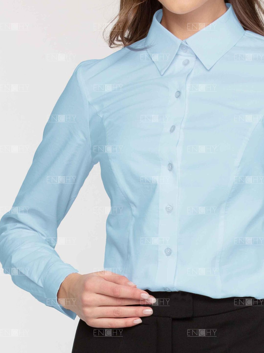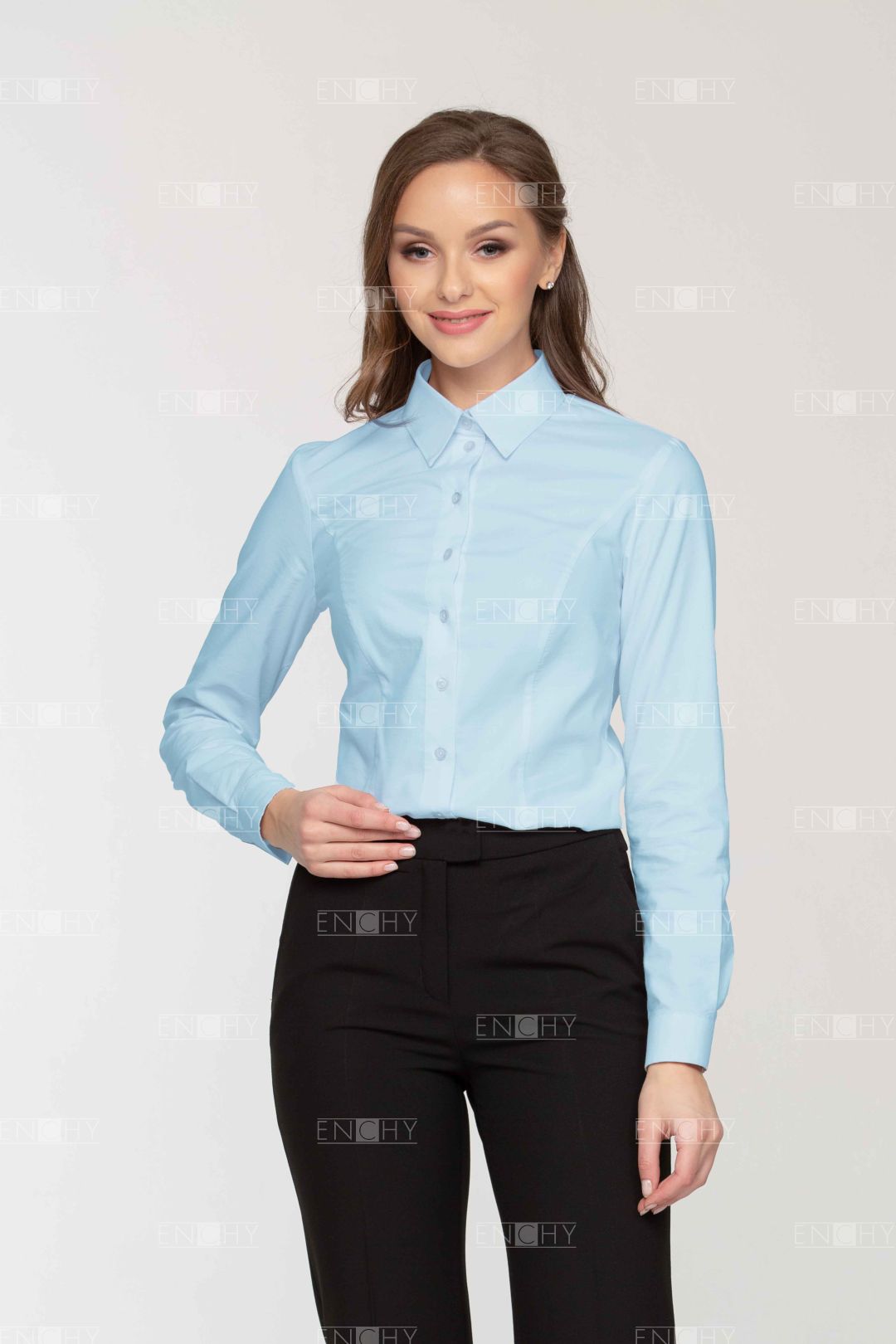 Блуза женская с длинным рукавом. Классический силуэт умеренного объема. Форма образована рельефами на переде и спинке. Блуза со стояче - отложным воротником. Отлет воротника с острым углом. Блуза застегивается на цельнокроенную планку. Низ блузы слегка округлый. Рукав длинный с притачной манжетой. Манжеты застегиваются на 1 петлю-пуговицу. В верхней части рукава спроектированы 2 небольшие складки, направленные в сторону разреза.
