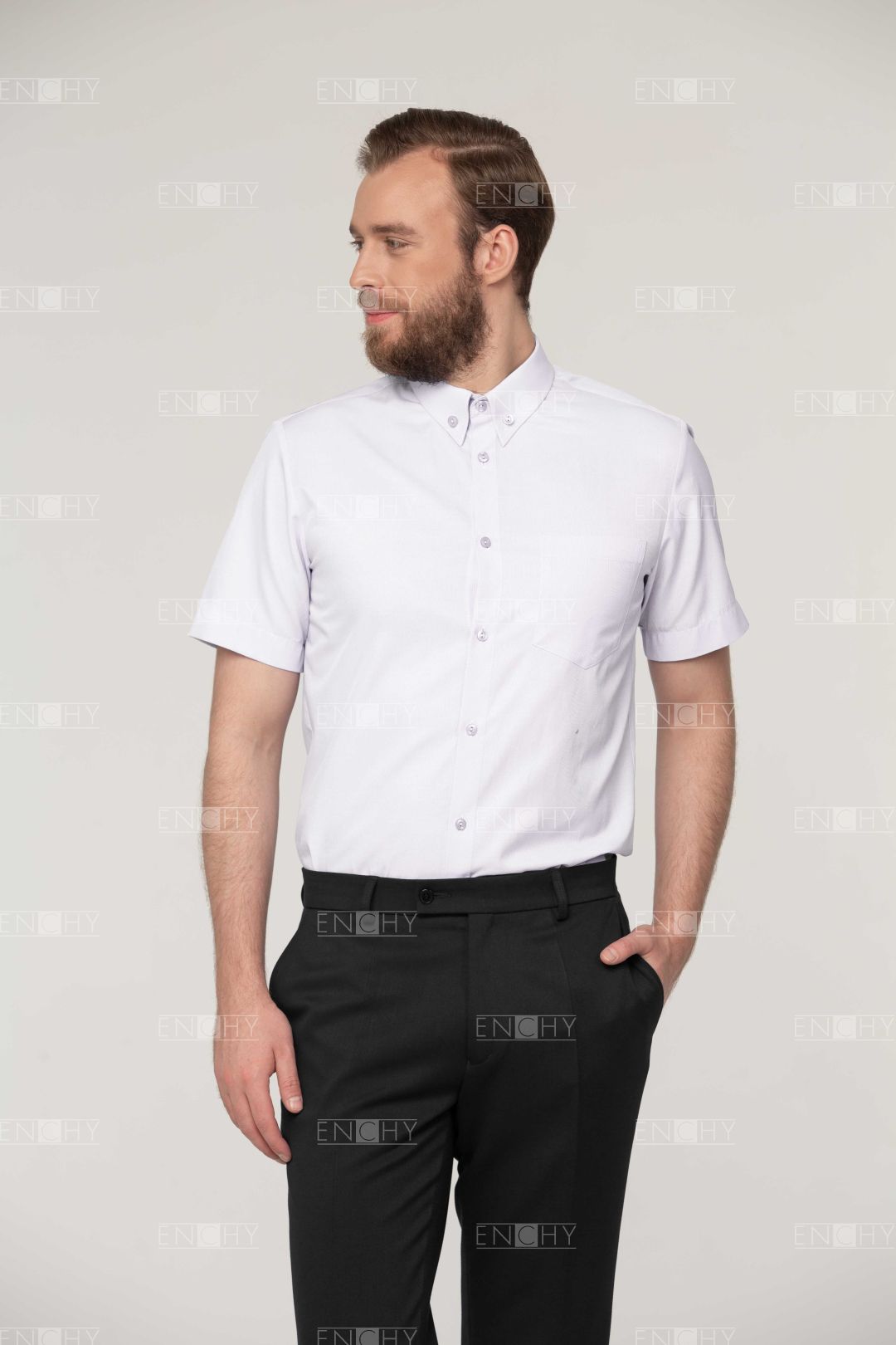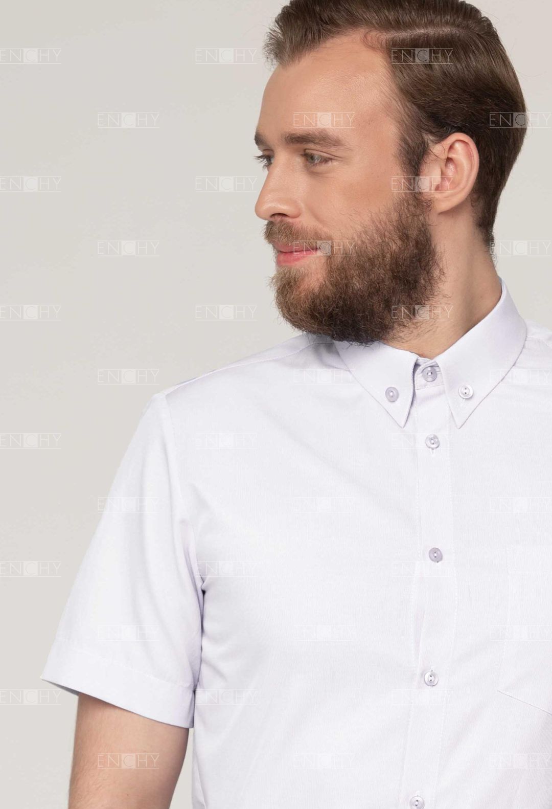 Сорочку классического прямого кроя отличает фигурный воротник на стойке, уголки которого пристегиваются на пуговички. Сорочка прямого силуэта, свободная, удобная, рукав со спущенной линией плеча. Сзади кокетка и 2 защипа для свободы движения. Спереди накладной карман.