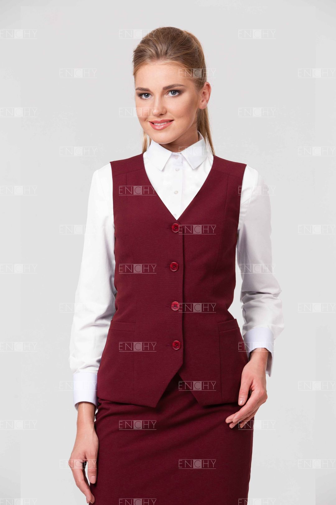Удлиненный жилет отлично сидит на фигуре, благодаря рельефам. Жилет имеет V-образный вырез, прорезные боковые карманы с листочкой. Хлястик с пряжкой сзади позволяет регулировать степень прилегания. Интересная особенность данной модели - кокетка, которую можно изготовить в фирменном цвете компании или вставить кант. Представленная модель жилета - станет стильным, формирующим фигуру, дополнением корпоративного комплекта.