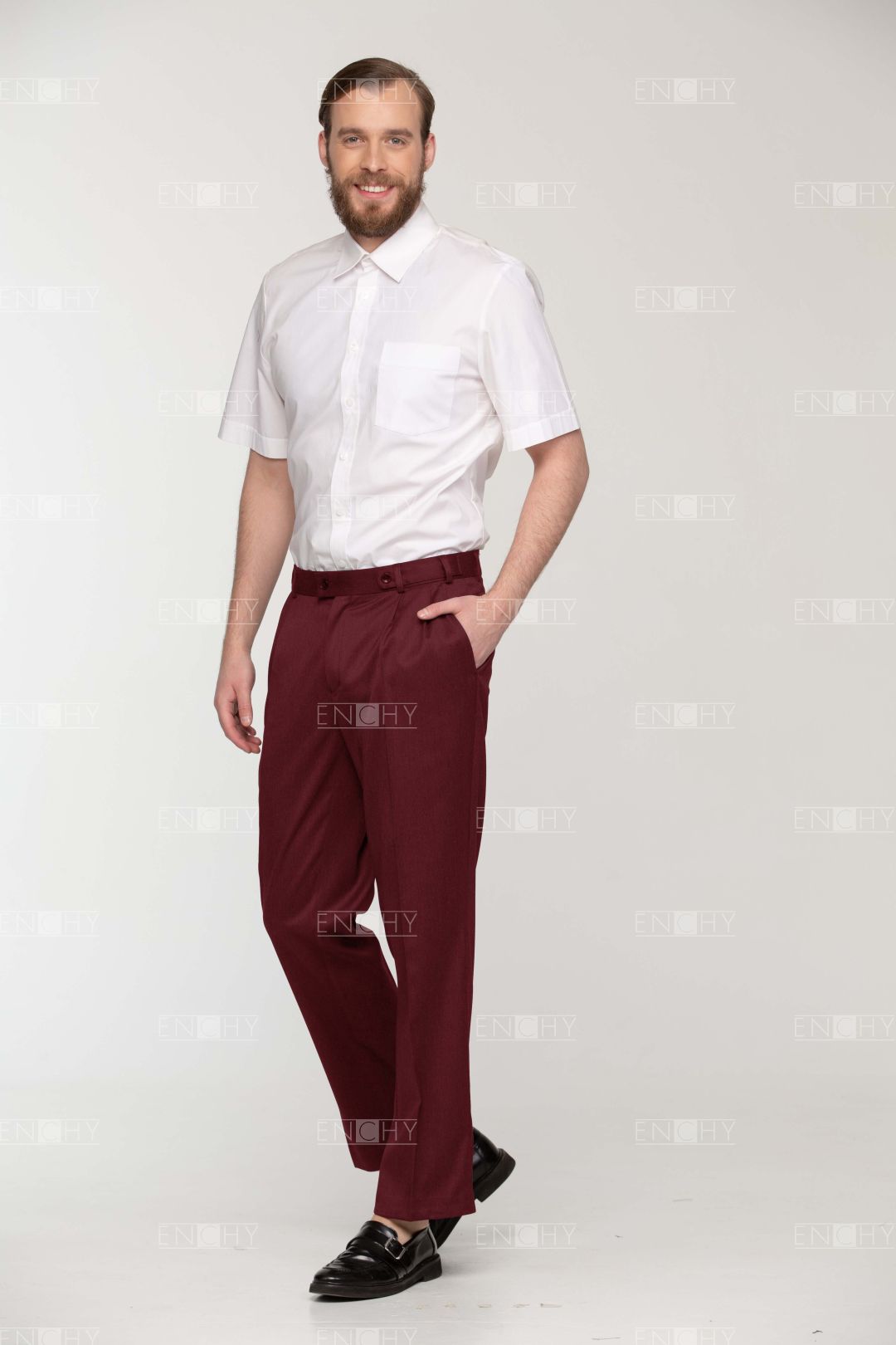 Мужские брюки актуальной модной формы по достоинству оценят сотрудники молодого коллектива. Брюки со складками возле пояса, слегка укорочены. Боковые карманы спереди, сзади один прорезной карман в рамку и застежкой на пуговицу. Пояс декорирован хлястиком с левой стороны.
