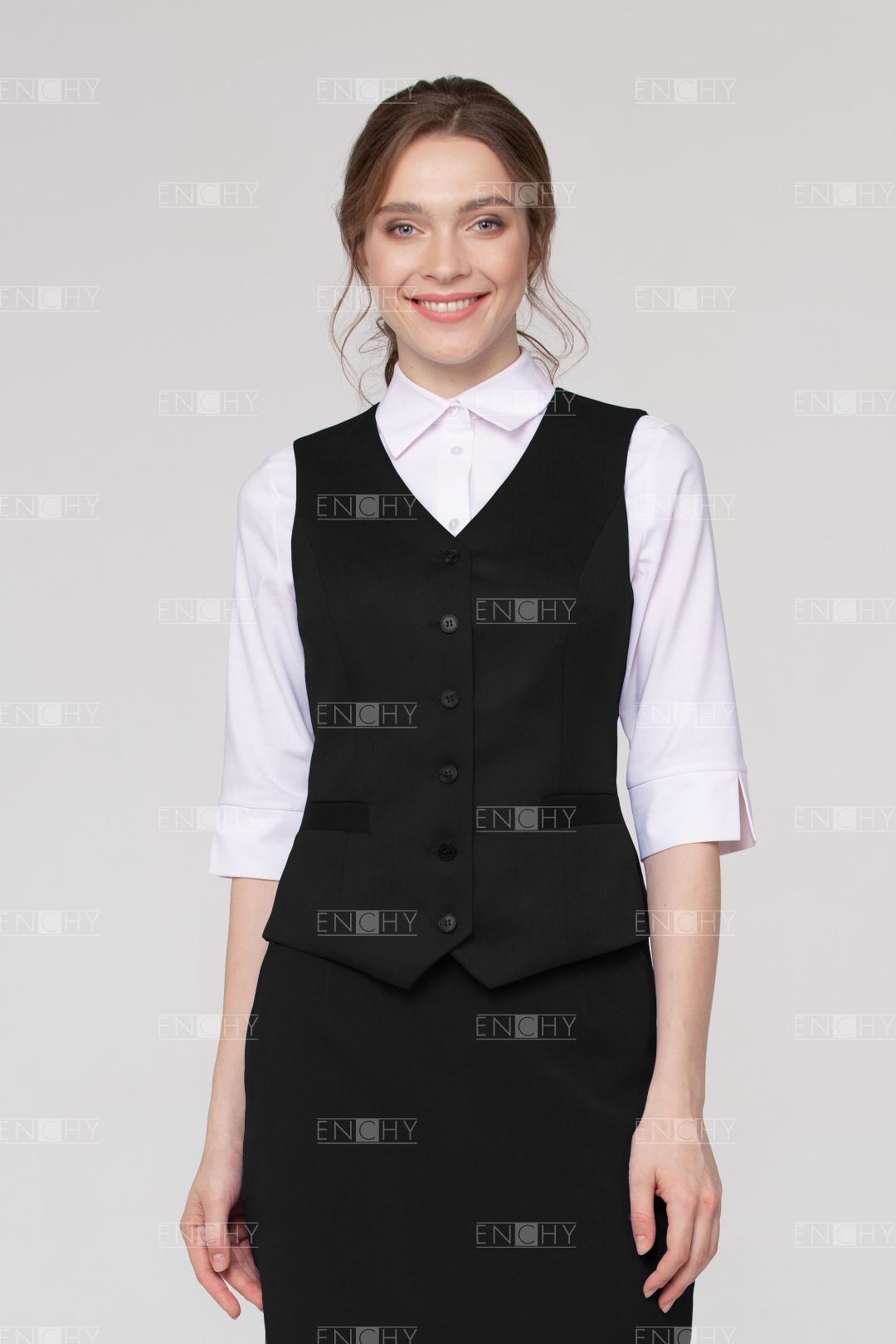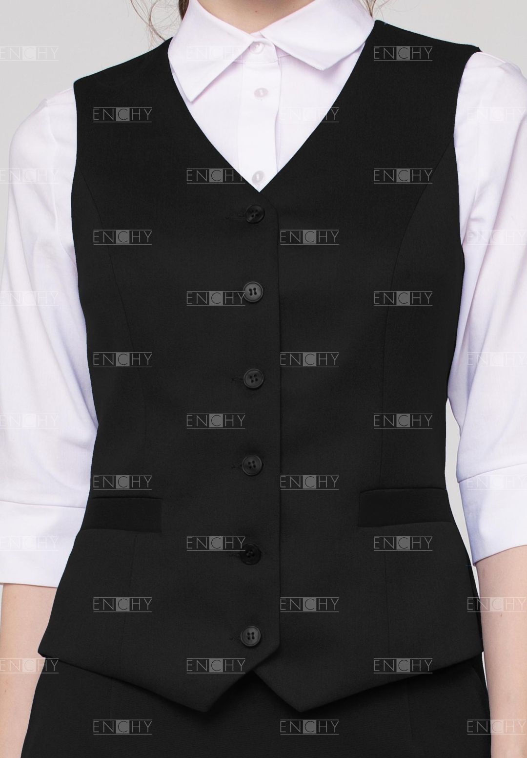 Бессмертная классика— слегка укороченный женский жилет полуприлегающего силуэта с рельефами переда и спинки и бортовой застежкой на 6 пуговицах. Вырез горловины неглубокий. Идеально подойдет на любой размер! Дизайн дополняют прорезные карманы с широкой листочкой и разрезы по бокам.