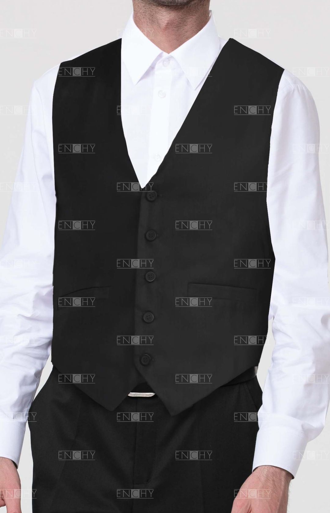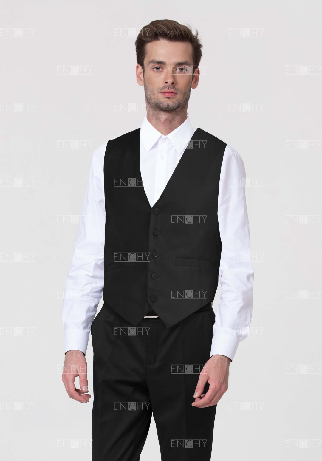 Жилет на подкладке стильной формы с модной линией плеча подойдет как для барменов, так и для офисных сотрудников. Застежка на 5 пуговиц, спереди карманы с листочкой. Сзади вытачки и хлястик для регулировки ширины с полукольцами. Линия борта оформлена острыми уголками.