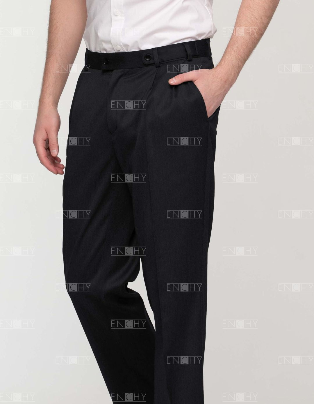 Мужские брюки актуальной модной формы по достоинству оценят сотрудники молодого коллектива. Брюки со складками возле пояса, слегка укорочены. Боковые карманы спереди, сзади один прорезной карман в рамку и застежкой на пуговицу. Пояс декорирован хлястиком с левой стороны.