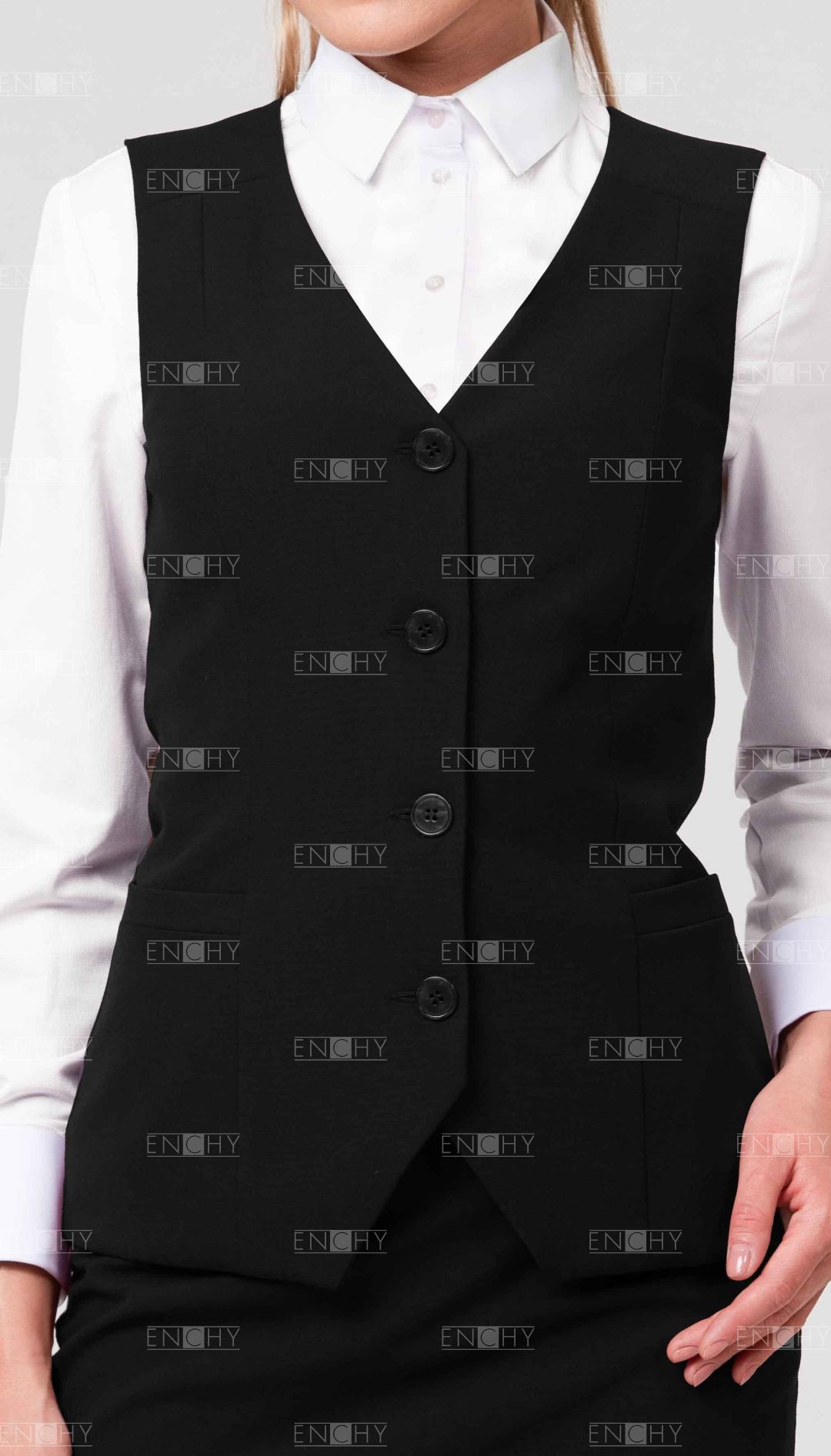 Удлиненный жилет отлично сидит на фигуре, благодаря рельефам. Жилет имеет V-образный вырез, прорезные боковые карманы с листочкой. Хлястик с пряжкой сзади позволяет регулировать степень прилегания. Интересная особенность данной модели - кокетка, которую можно изготовить в фирменном цвете компании или вставить кант. Представленная модель жилета - станет стильным, формирующим фигуру, дополнением корпоративного комплекта.
