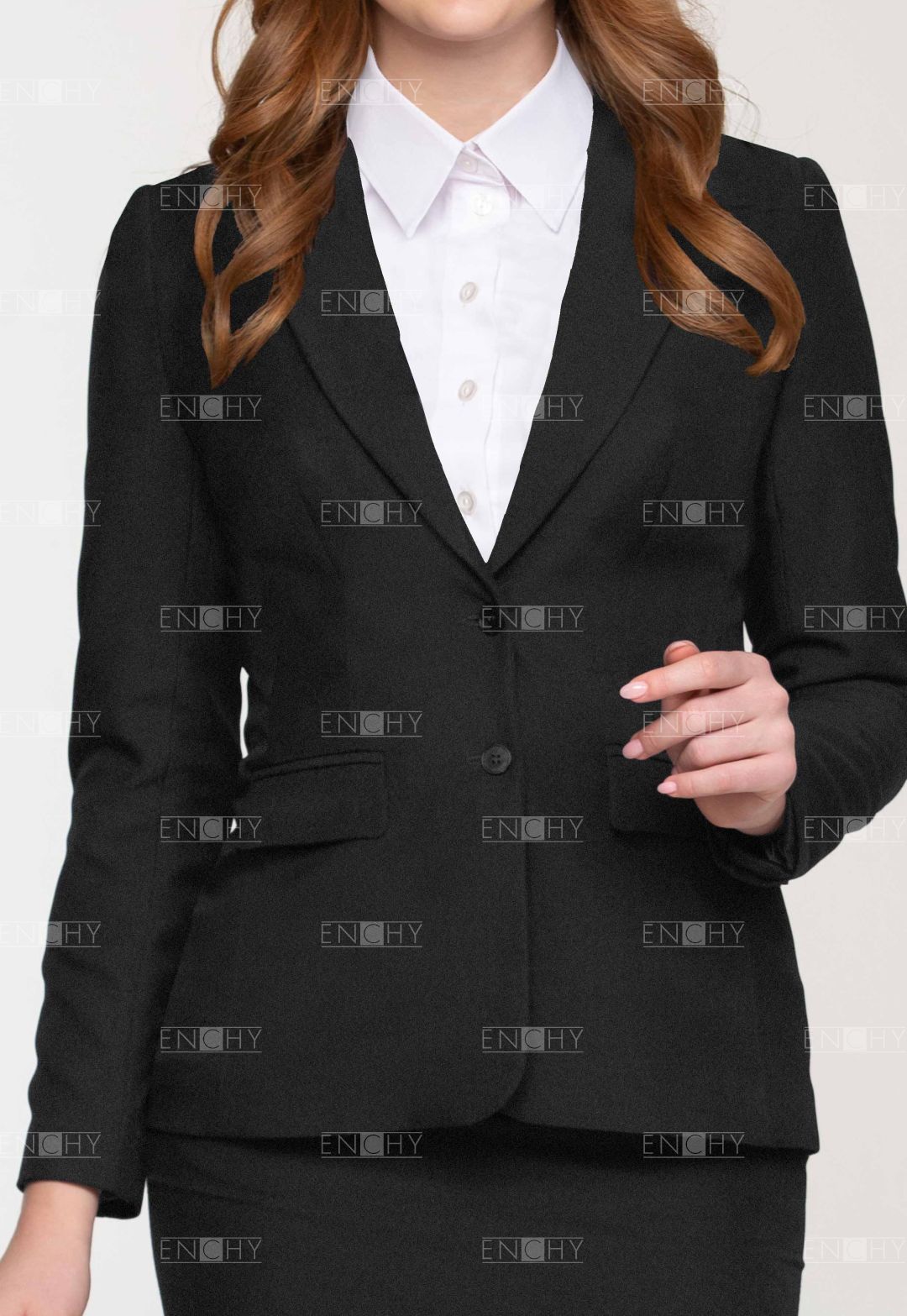Универсальная модель с английским воротником и застежкой на 2 пуговицы. Силуэтная форма образована за счет рельефов,талиевых и плечевых вытачек и шлицы. На переде два прорезных кармана с клапанами в рамку и верхней нагрудной листочкой. Такой жакет отлично впишется как в строгий дресс-код, так и в более повседневный, если сочетать с кедами!