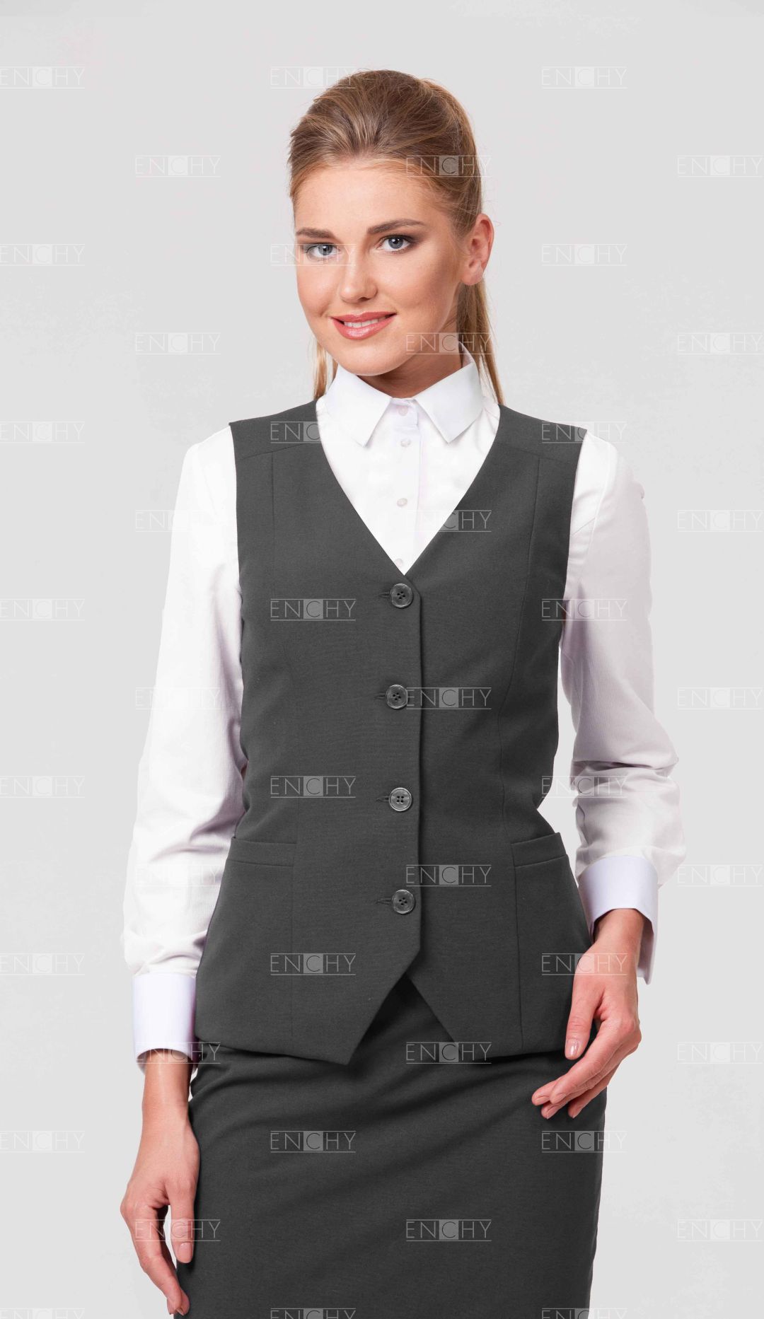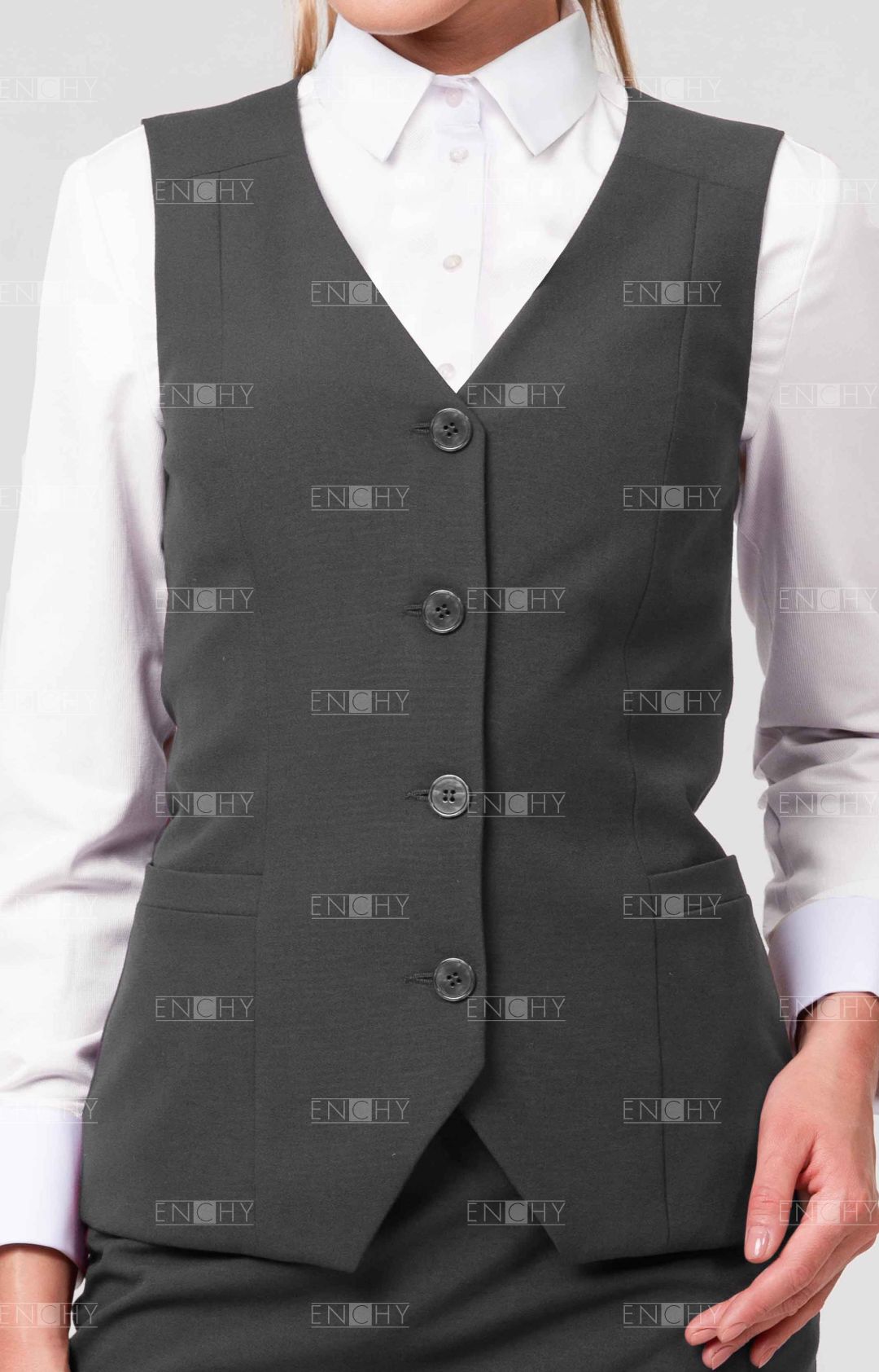 Удлиненный жилет отлично сидит на фигуре, благодаря рельефам. Жилет имеет V-образный вырез, прорезные боковые карманы с листочкой. Хлястик с пряжкой сзади позволяет регулировать степень прилегания. Интересная особенность данной модели - кокетка, которую можно изготовить в фирменном цвете компании или вставить кант. Представленная модель жилета - станет стильным, формирующим фигуру, дополнением корпоративного комплекта.