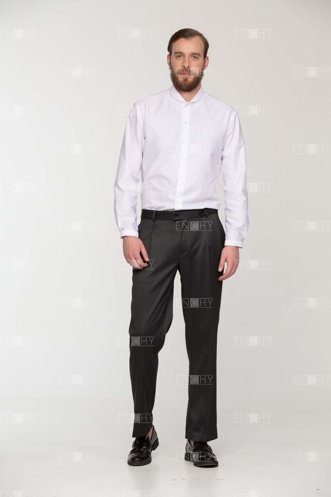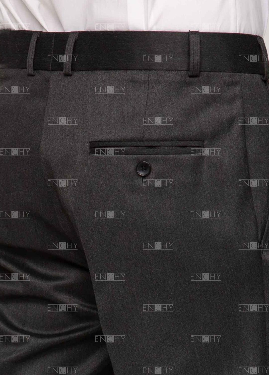 Мужские брюки актуальной модной формы по достоинству оценят сотрудники молодого коллектива. Брюки со складками возле пояса, слегка укорочены. Боковые карманы спереди, сзади один прорезной карман в рамку и застежкой на пуговицу. Пояс декорирован хлястиком с левой стороны.