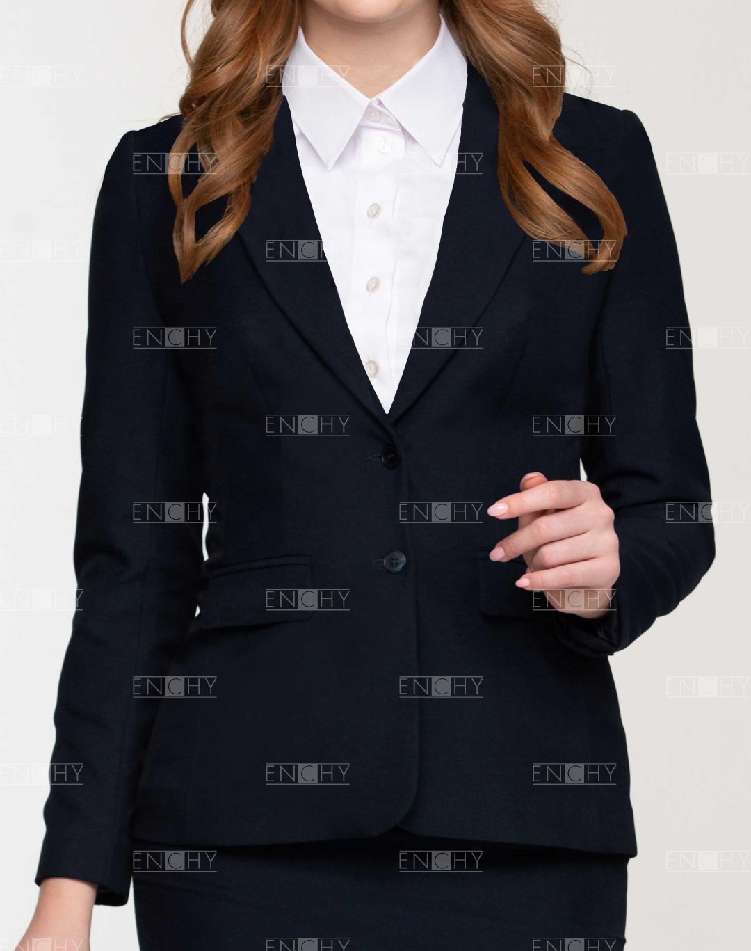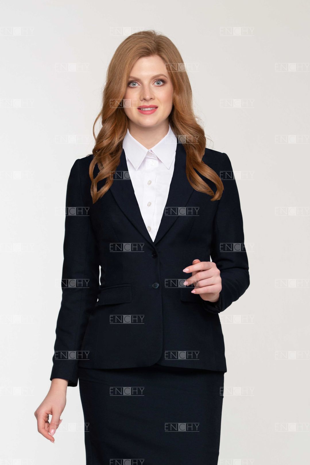 Универсальная модель с английским воротником и застежкой на 2 пуговицы. Силуэтная форма образована за счет рельефов,талиевых и плечевых вытачек и шлицы. На переде два прорезных кармана с клапанами в рамку и верхней нагрудной листочкой. Такой жакет отлично впишется как в строгий дресс-код, так и в более повседневный, если сочетать с кедами!