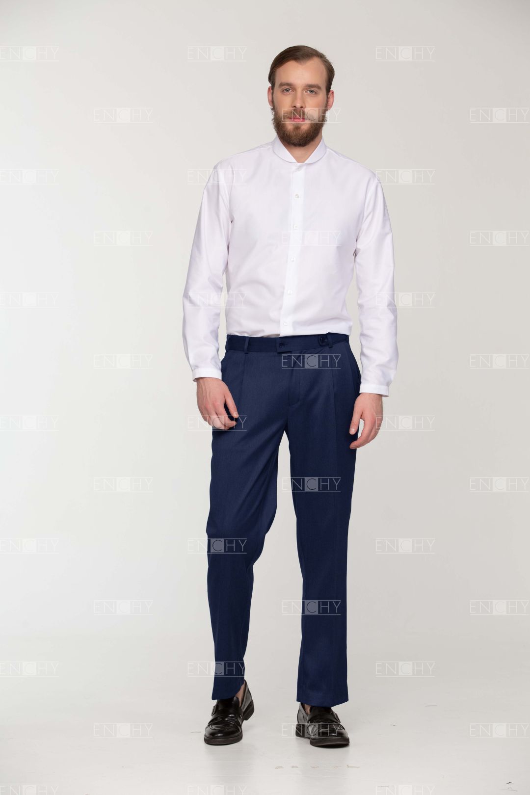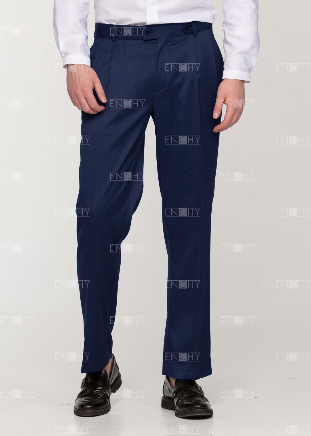 Мужские брюки актуальной модной формы по достоинству оценят сотрудники молодого коллектива. Брюки со складками возле пояса, слегка укорочены. Боковые карманы спереди, сзади один прорезной карман в рамку и застежкой на пуговицу. Пояс декорирован хлястиком с левой стороны.