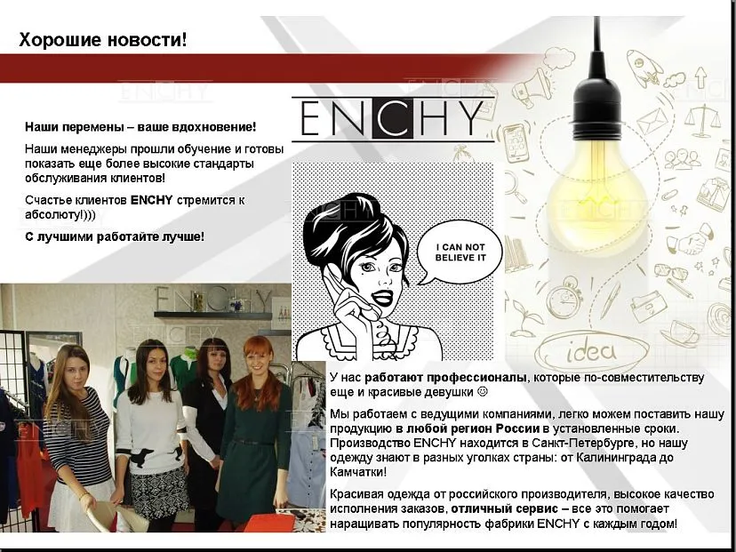 Красивая одежда от российского производителя, высокое качество исполнения заказов, отличный сервис – все это помогает наращивать популярность фабрики ENCHY с каждым годом!