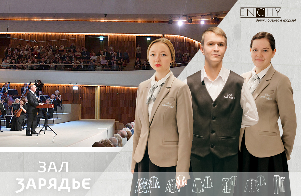 Компания ENCHY разработала и отшила униформу для сотрудников концертного зала к открытию. Униформа для администраторов, билетёров, монтировщиков, оркестра.