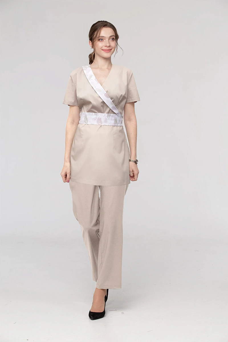 Для спа центра мы разработали стильную удобную униформу с отделкой индивидуальным принтом.