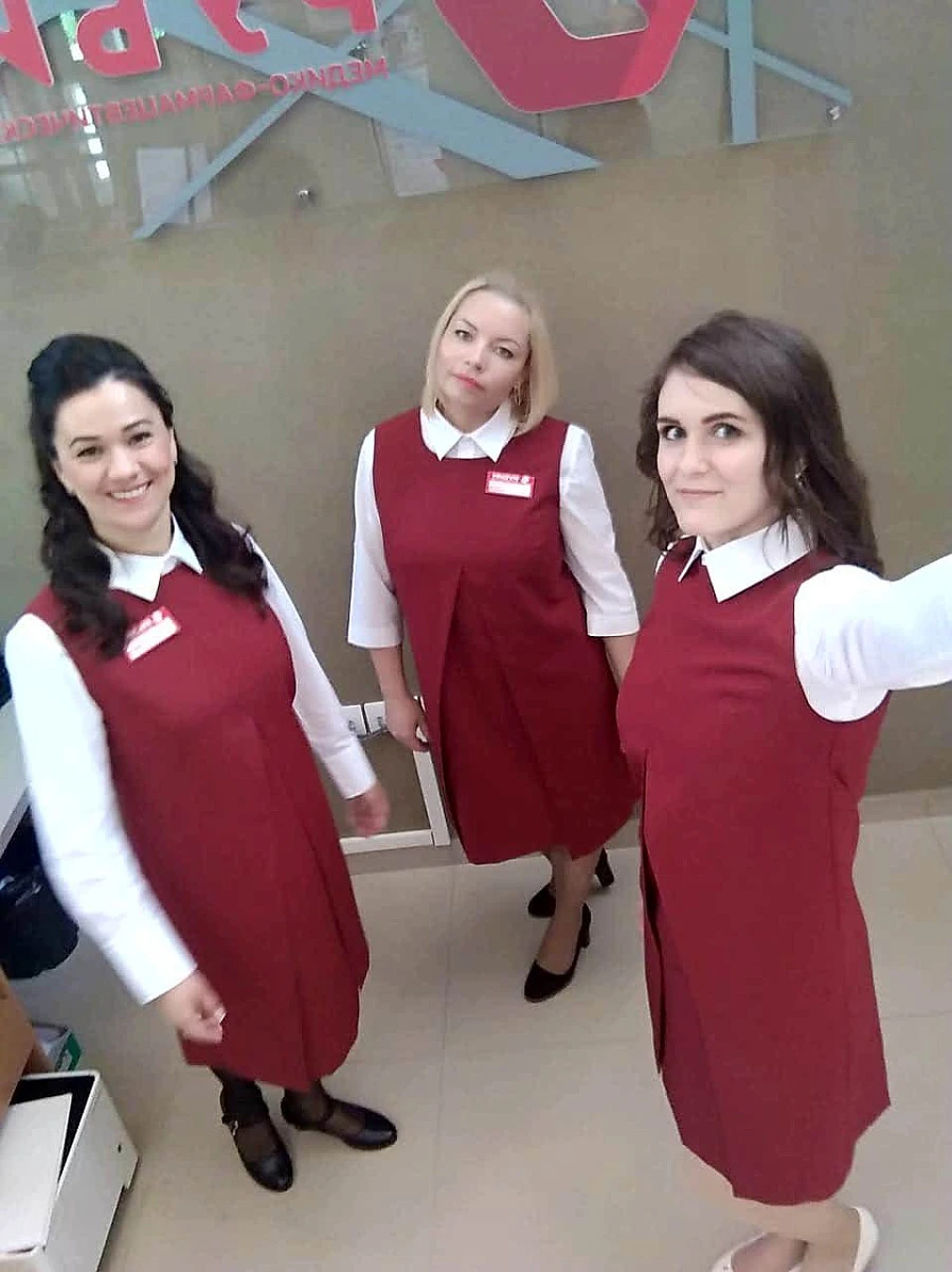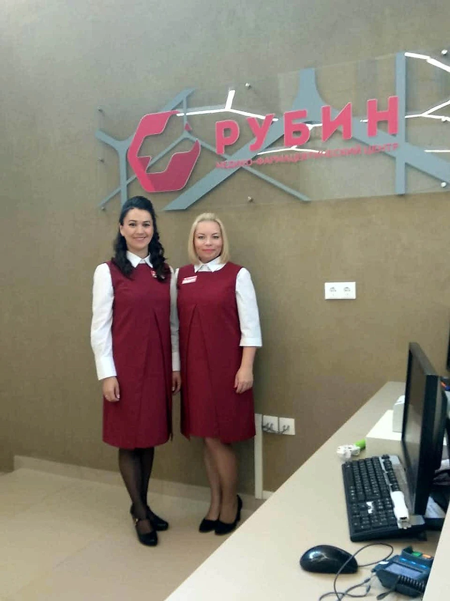 Медицинский Центр "Рубин" является одним из лучших в городе Каменск-Уральск. С помощью униформы мы постарались подчеркнуть экспертность и профессионализм команды. Белоснежные рубашки придали образу свежесть и благородство, а сарафан в фирменном оттенке благодаря отточенному фасону превосходно сел на разные фигуры сотрудниц.