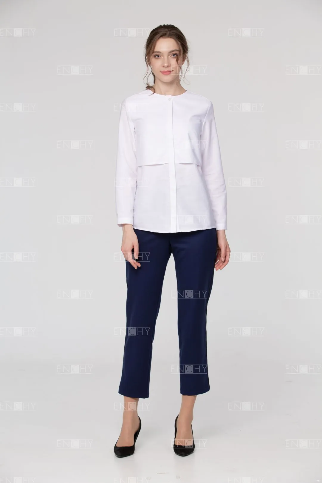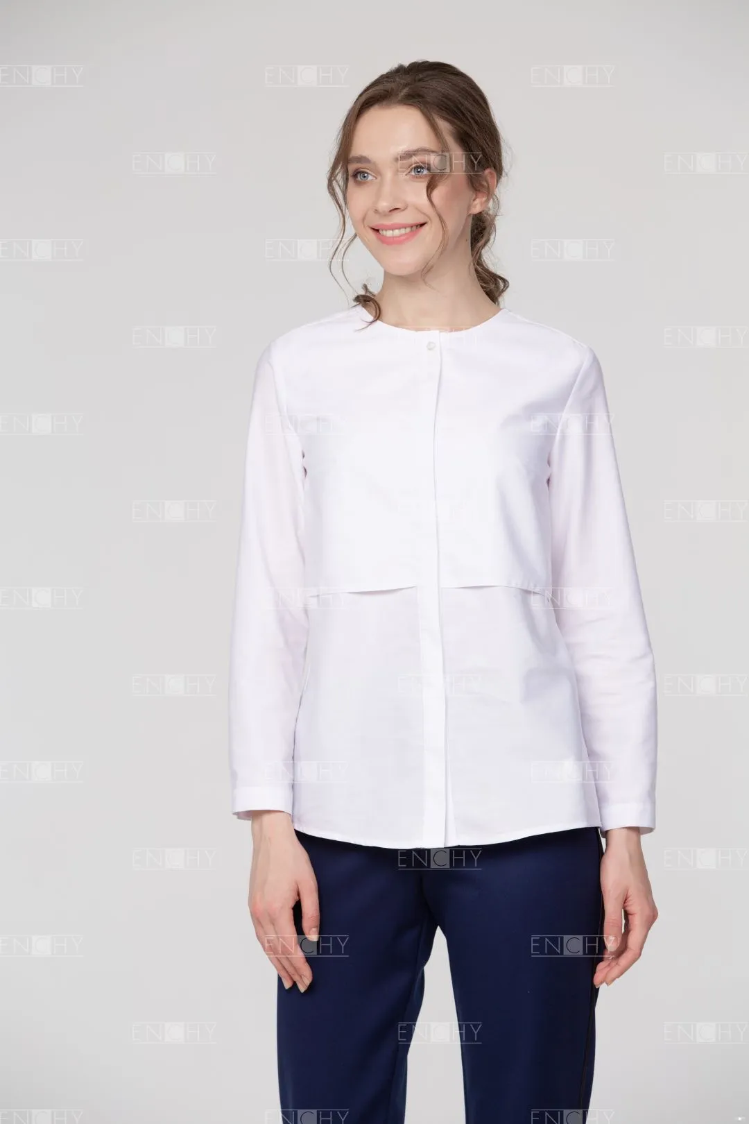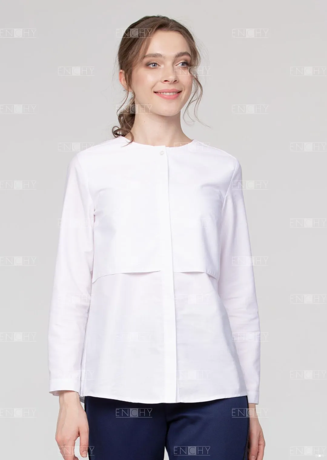 Стильная и необычная блуза - новая классика в офисной среде. Блуза женская свободной формы с длинным рукавом без воротника. По переду длинная кокетка, дублирующая детали переда - необычный элемент. Блуза слегка удлинена и имеет округлую форму линии низа. Нестандартный выбор для самых стильных!