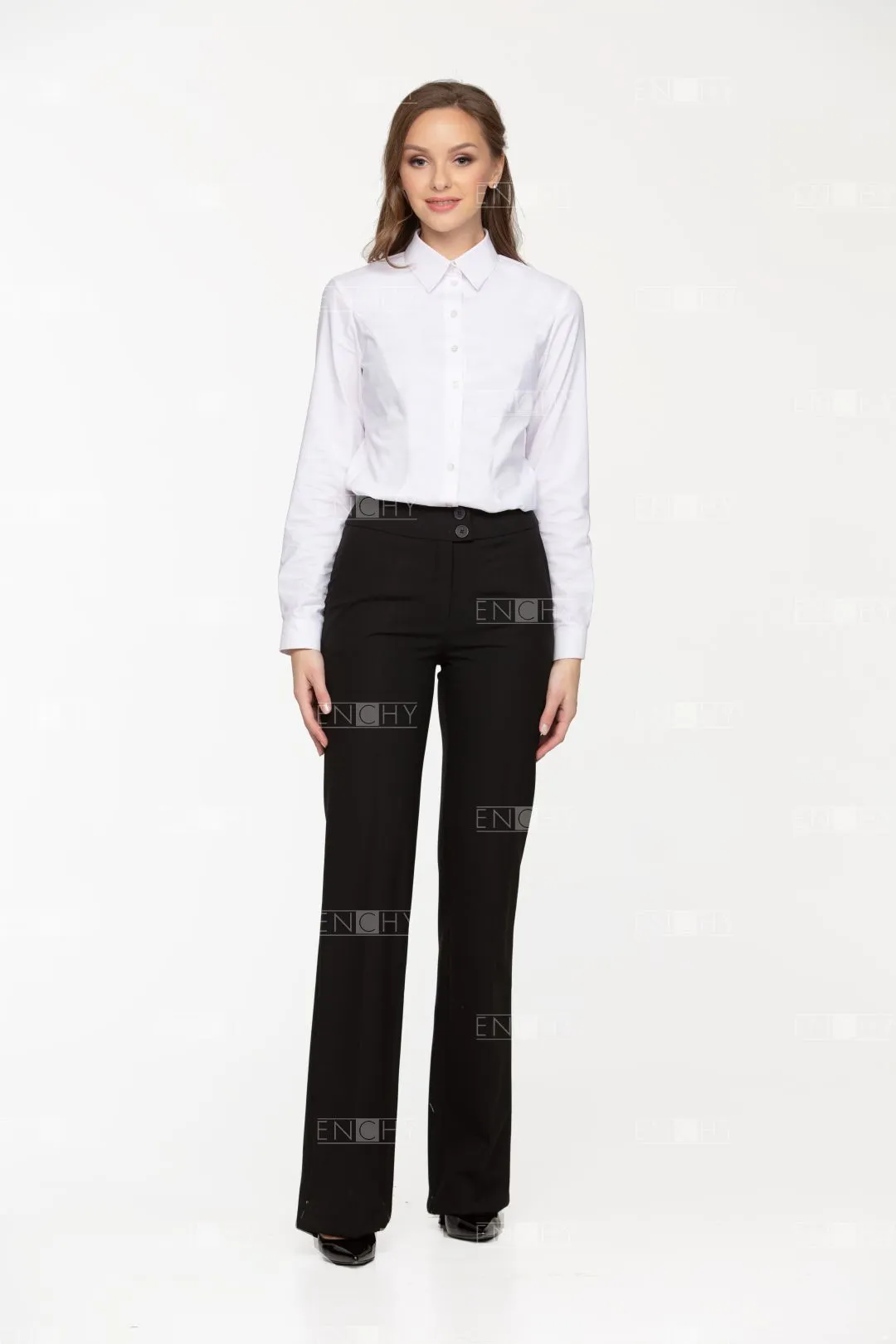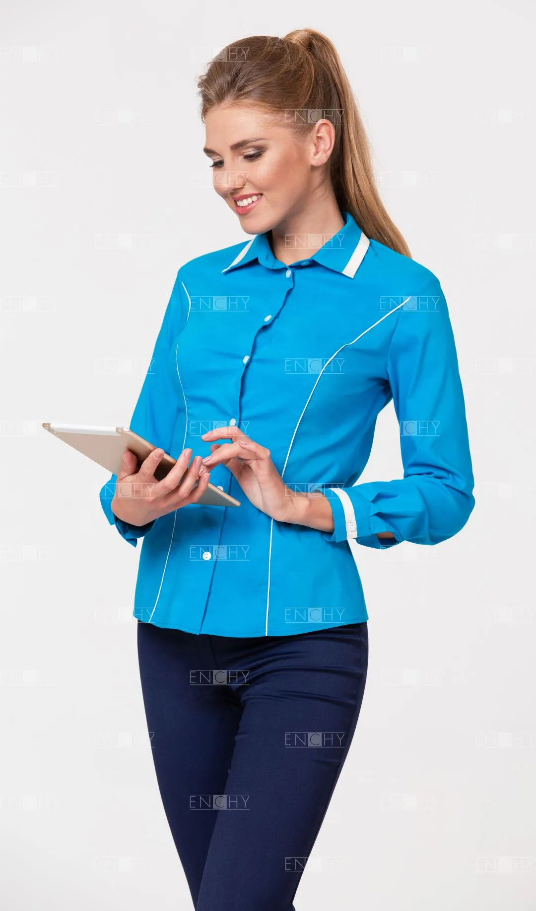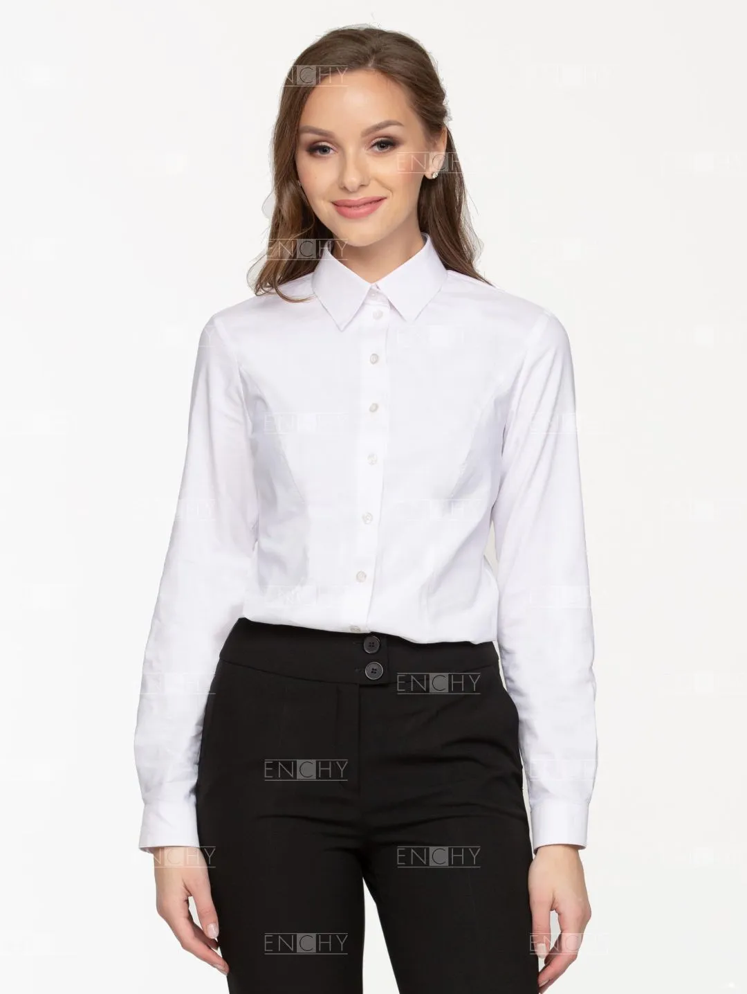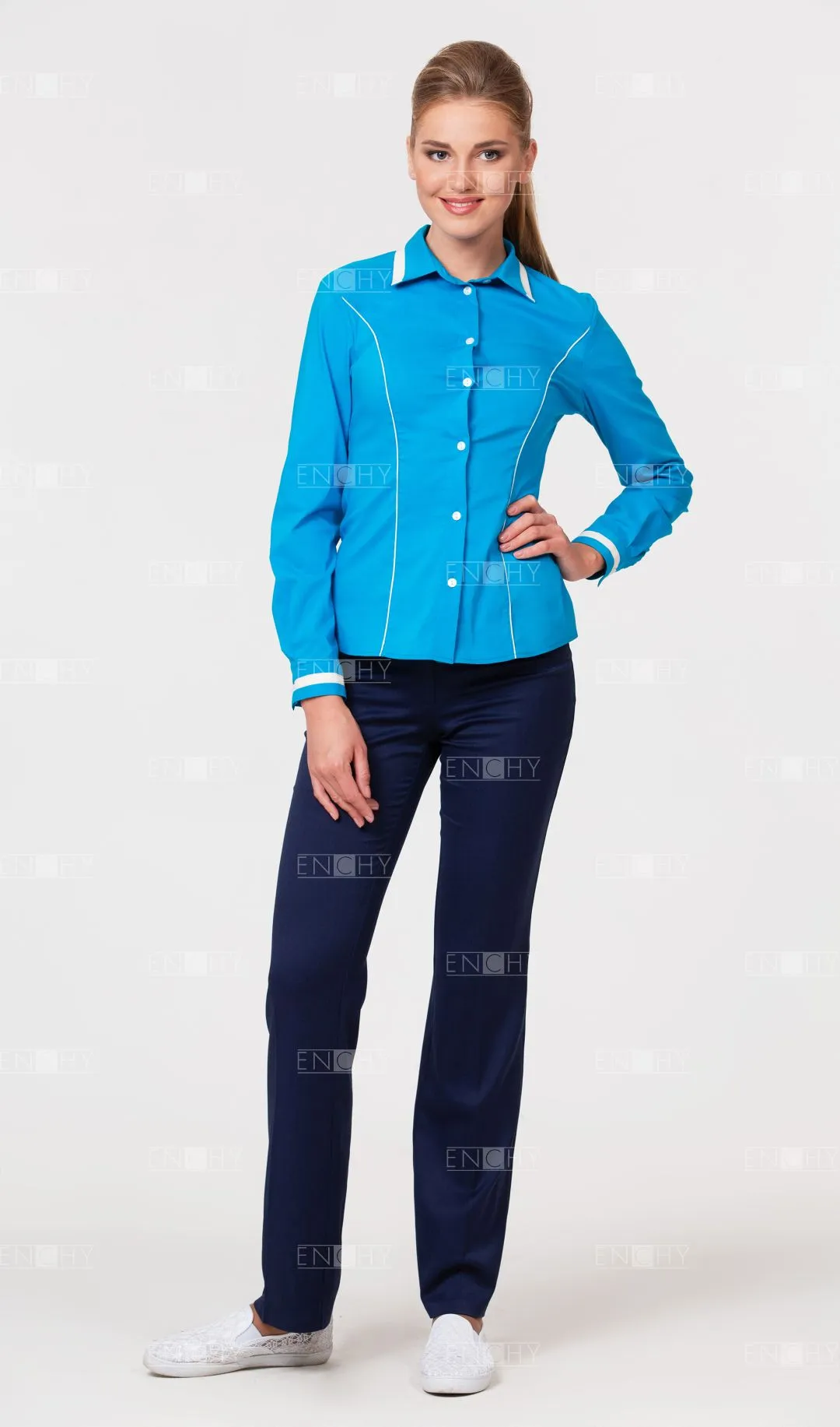 Блуза женская с длинным рукавом. Классический силуэт умеренного объема. Форма образована рельефами на переде и спинке. Блуза со стояче - отложным воротником. Отлет воротника с острым углом. Блуза застегивается на цельнокроенную планку. Низ блузы слегка округлый. Рукав длинный с притачной манжетой. Манжеты застегиваются на 1 петлю-пуговицу. В верхней части рукава спроектированы 2 небольшие складки, направленные в сторону разреза.