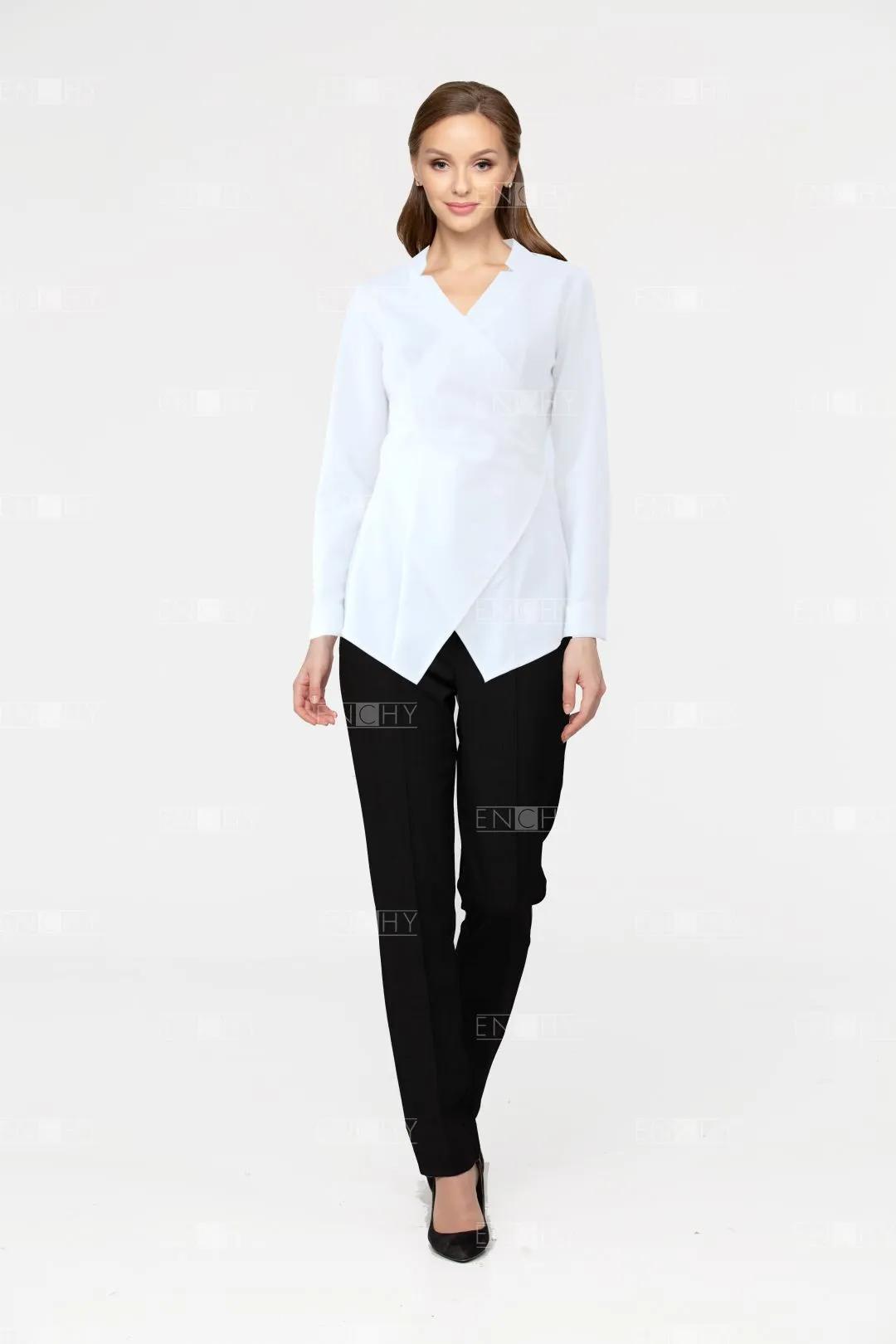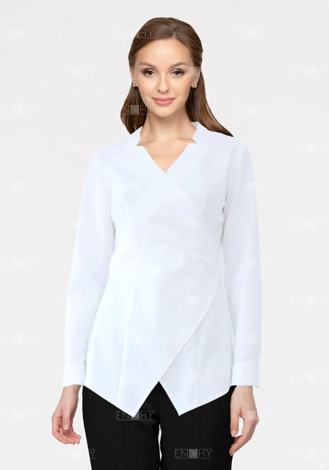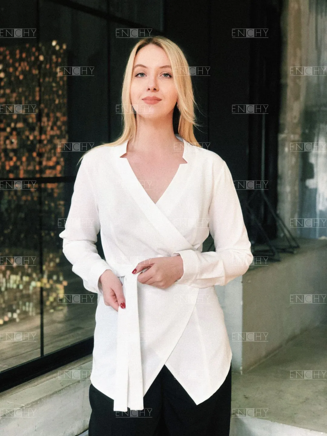 Стильная блуза прилегающего силуэта на запах с завязками на спинке! Фигурные треугольные борта и необычный вырез без воротника с широкой бейкой имитирующей воротник - сморится современно и необычно.