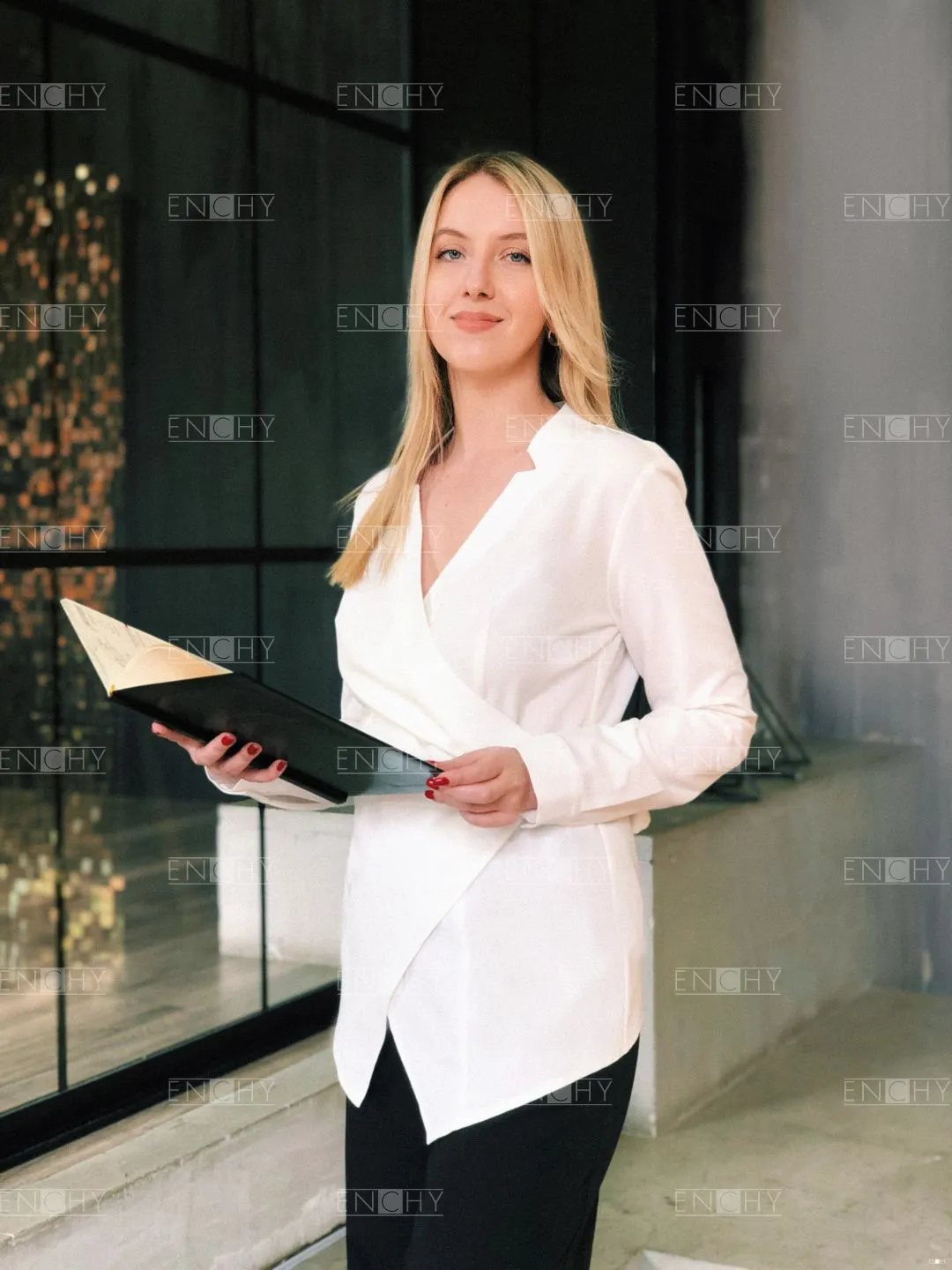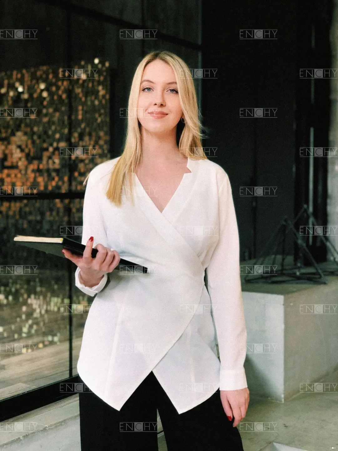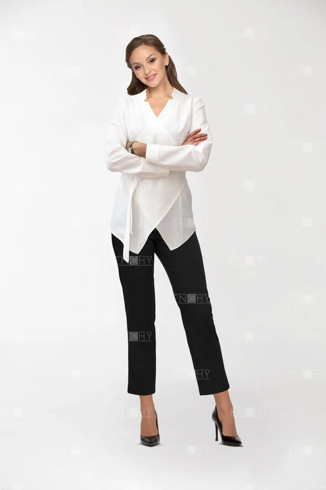 Стильная блуза прилегающего силуэта на запах с завязками на спинке! Фигурные треугольные борта и необычный вырез без воротника с широкой бейкой имитирующей воротник - сморится современно и необычно.