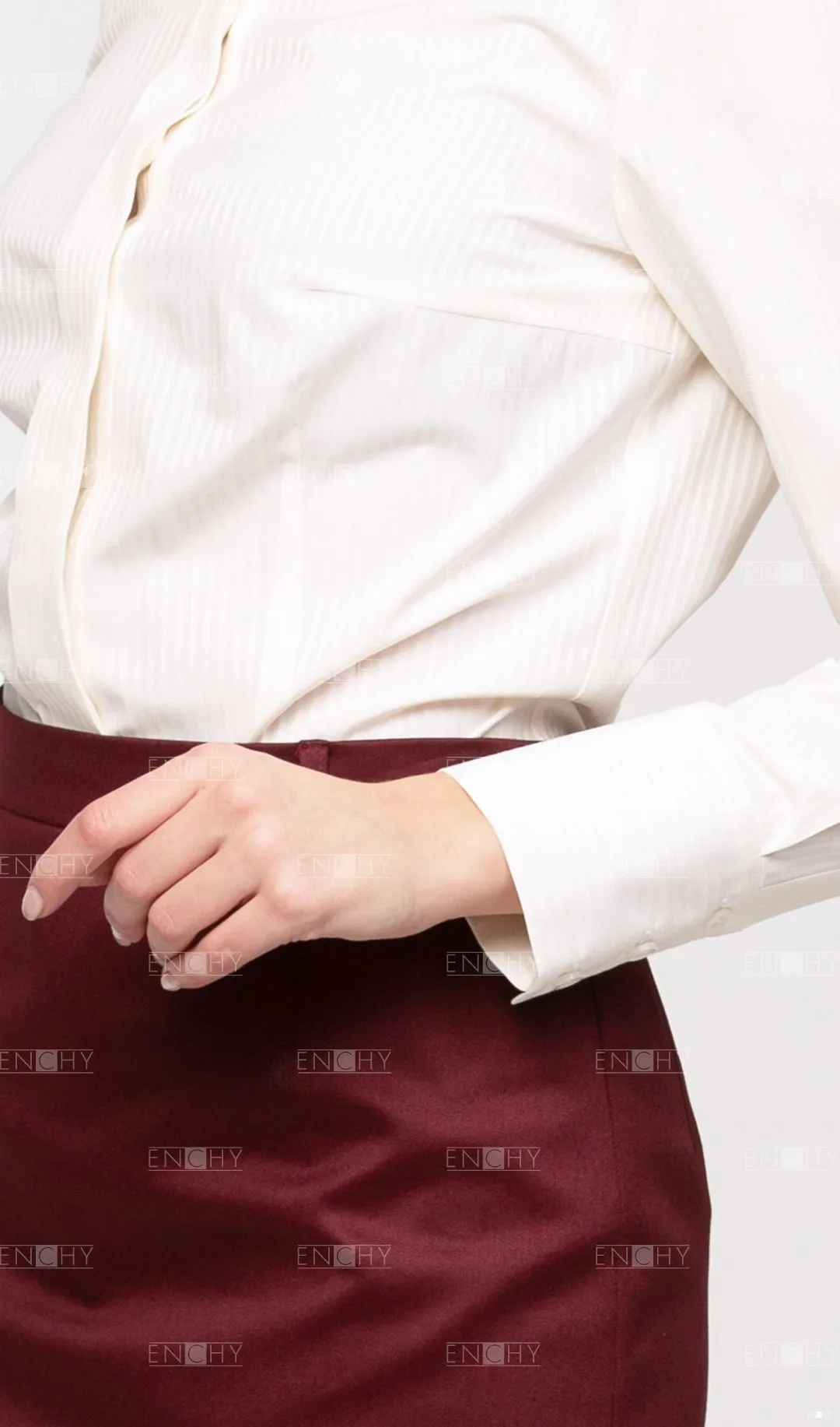 Классическая блуза с супатной застежкой, простая и стильная. Особенностью блузы являются широкие манжеты на 3 пуговицах с планкой. Дизайн дополнен небольшим стояче-отложным воротником. Спинка с кокеткой и рельефами, перед с вытачками, комфортная посадка по фигуре.
