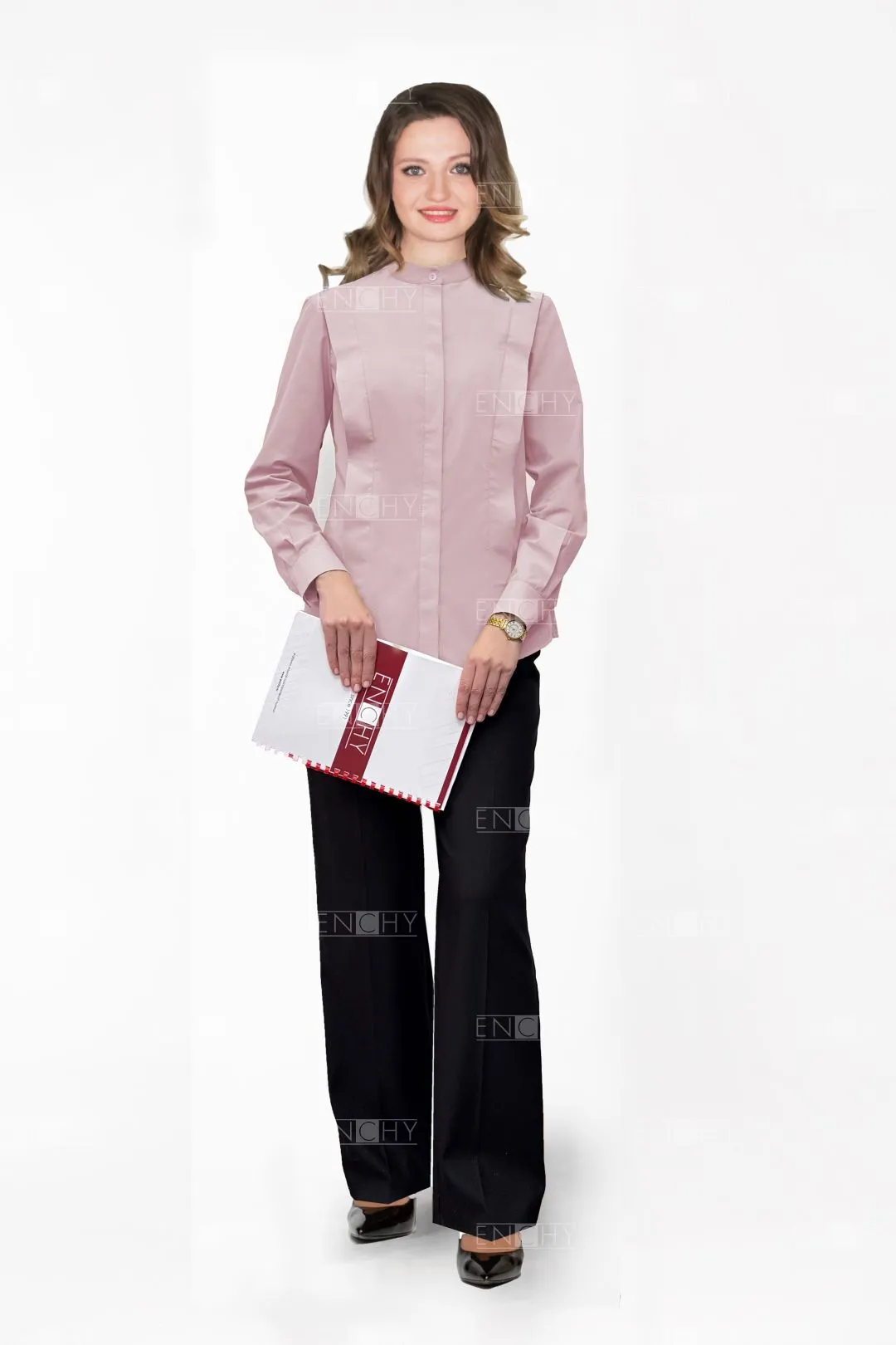 Трендовая блуза со вставками в рельефных швах. Блуза спрямленного силуэта, с воротником стойкой и супатной застежкой. Длинный рукав с манжетами, застегивающимися на пуговицы. Спинка с двойной притачной кокеткой.