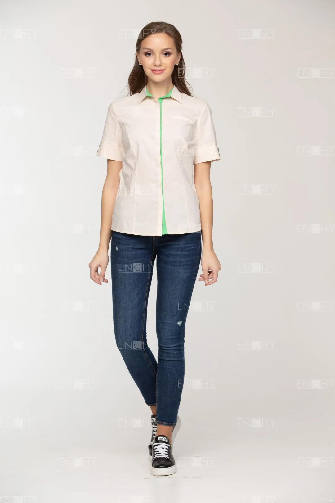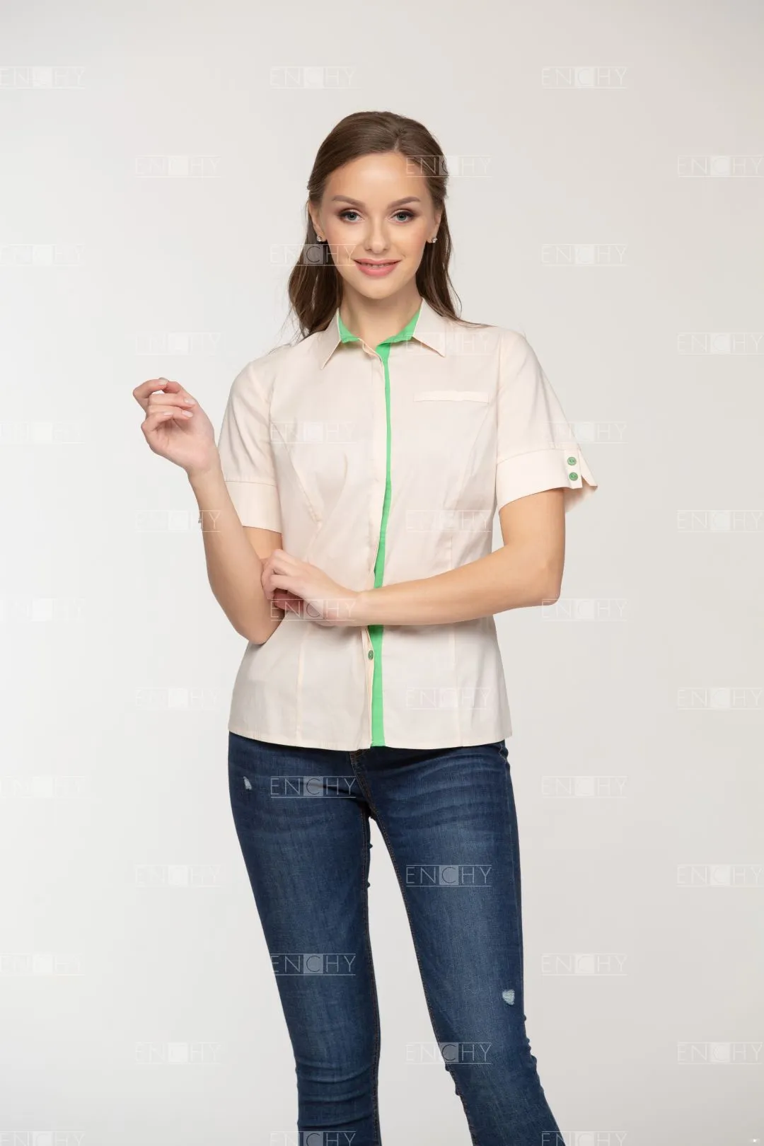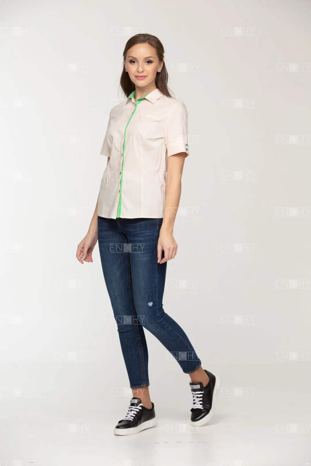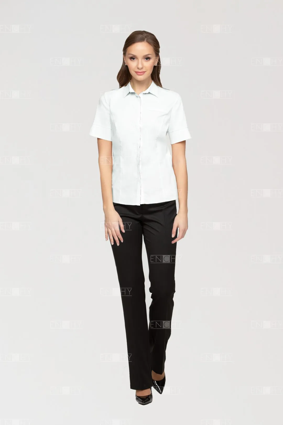 Истинная офисная элегантность делает ход и…. выигрывает! Строгий крой с рельефами с отстрочкой, супатная застежка с небольшим воротничком на высокой стойке, элегантный фигурный манжет с декоративными пуговицами - все это создает строгий истинный шик модели, а имитация кармана слева завершает стильный образ, делая удобным ношения бейджа. Блузку можно декорировать контрастными деталями, усиливая влияние корпоративного шика.