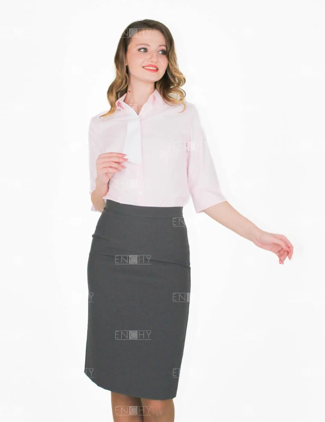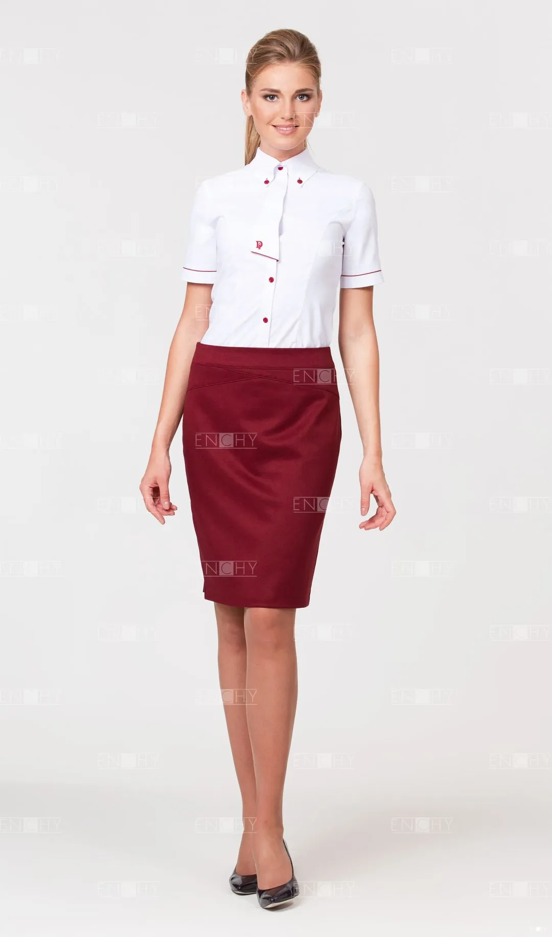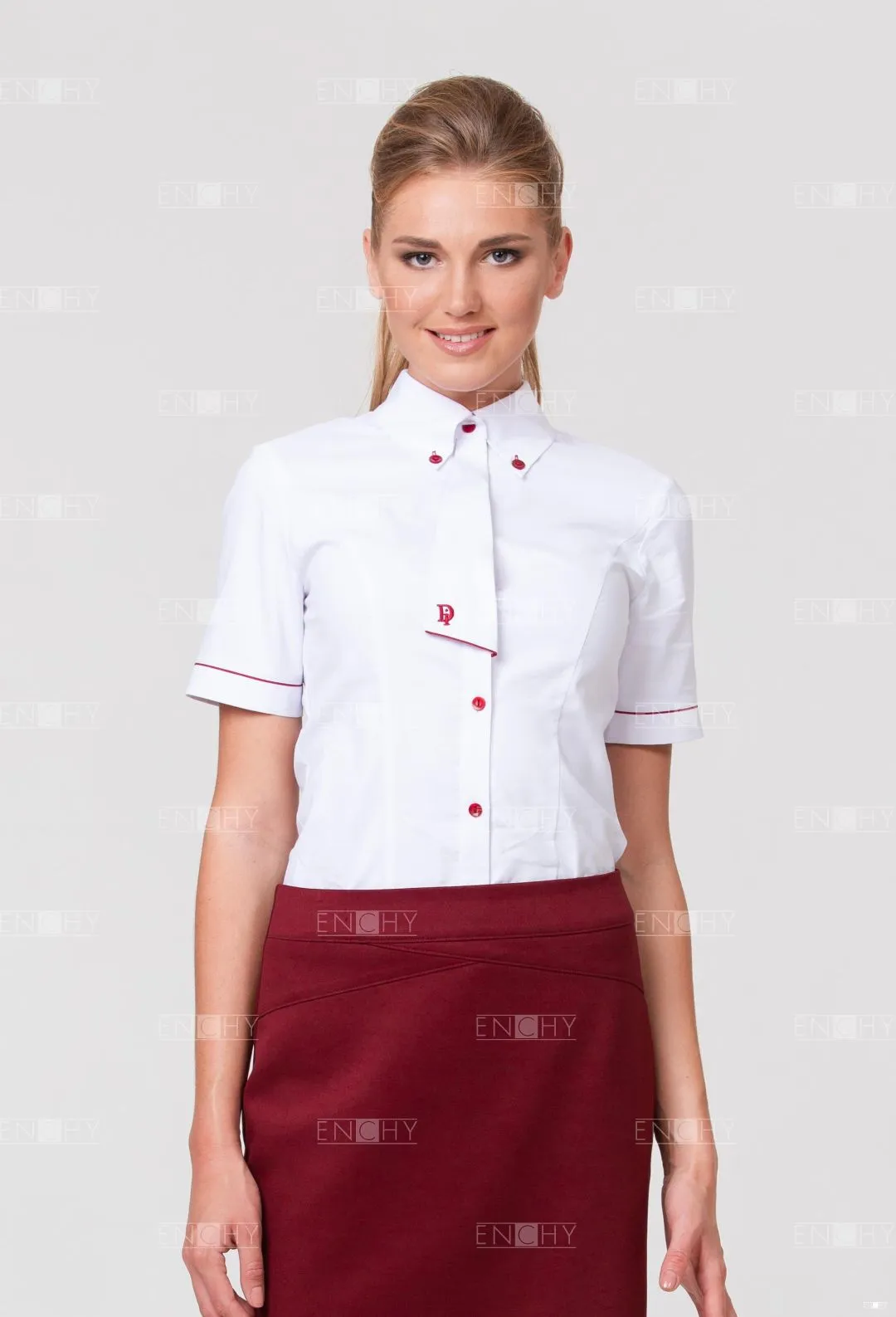 Блуза прилегающего силуэта, с коротким рукавом и имитацией галстука. Застежка на петли и пуговицы на притачной планке. На переде и спинке спроектированы рельефы, выходящие из пройм, для лучшей посадки. Концы стояче-отложного воротника фиксируются на петли и пуговицы. Для создания выразительного корпоративного стиля можно сделать галстук и кант по краю рукава из отделочной ткани!