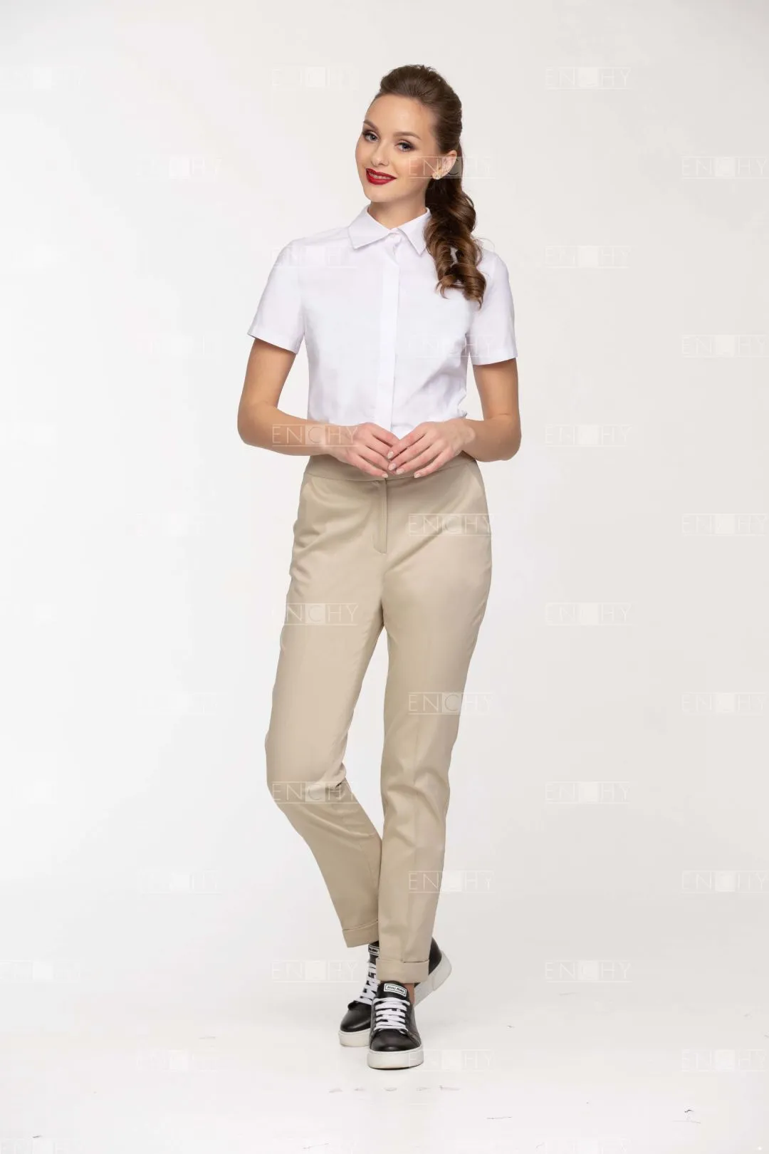 Блуза с коротким рукавом небольшого силуэта. Супатная застежка, нагрудные и талиевые вытачки, стояче-отложной воротник — простое лаконичное решение. Эту блузу будет удобно носить с юбками благодаря длине.