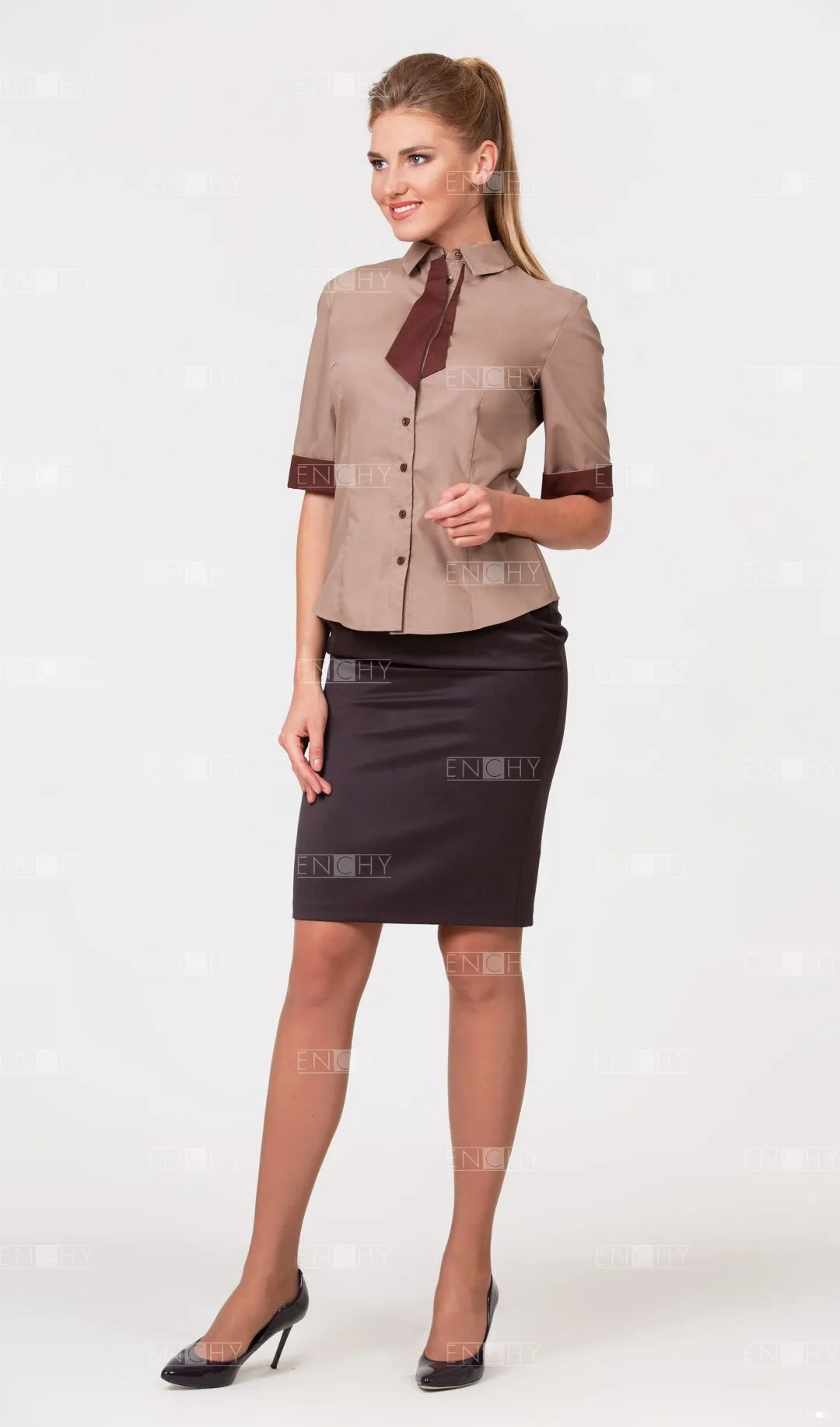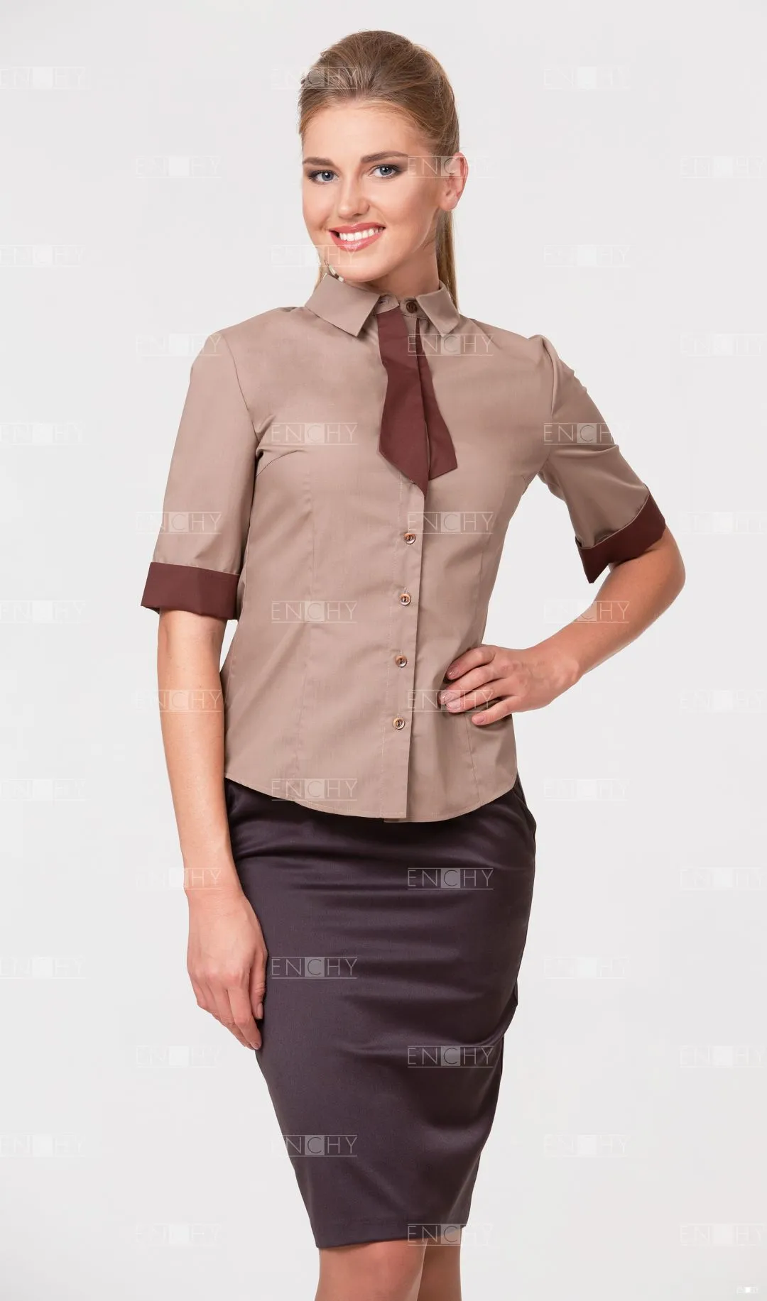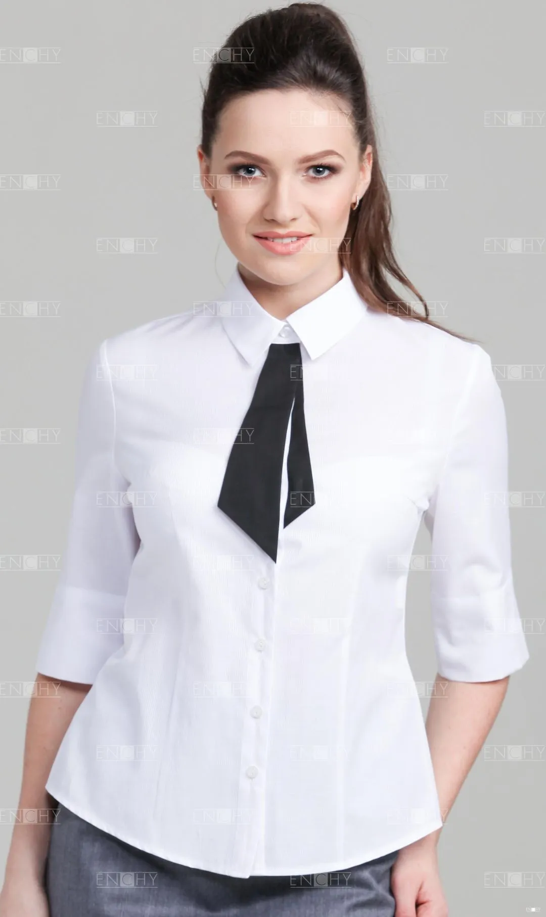 Оригинальный дизайн этой блузки обязан стильному асимметричному галстуку, который пришит вдоль застежки. Галстук можно выполнить в контрастной ткани или в одном цвете с блузкой. Удобный крой с нагрудными и талевыми вытачками, небольшой воротник на стойке. Рукав удобной длины до локтя можно подвернуть. Низ блузки оформлен полукругом, поэтому на выпуск блузка будет смотреться очень эффектно как с юбкой, так и с брюками.