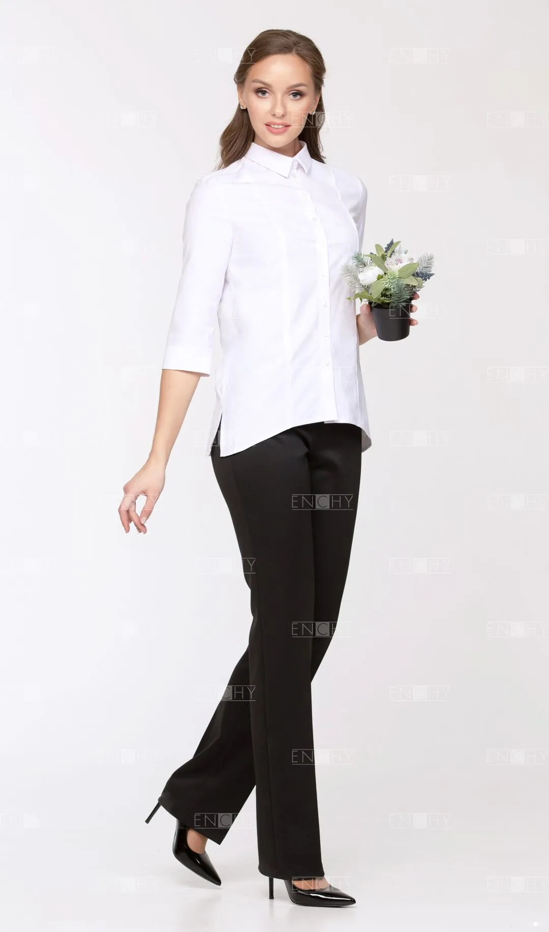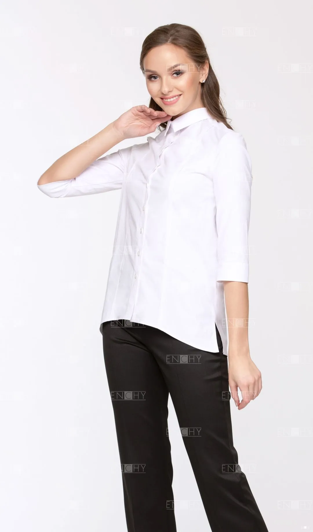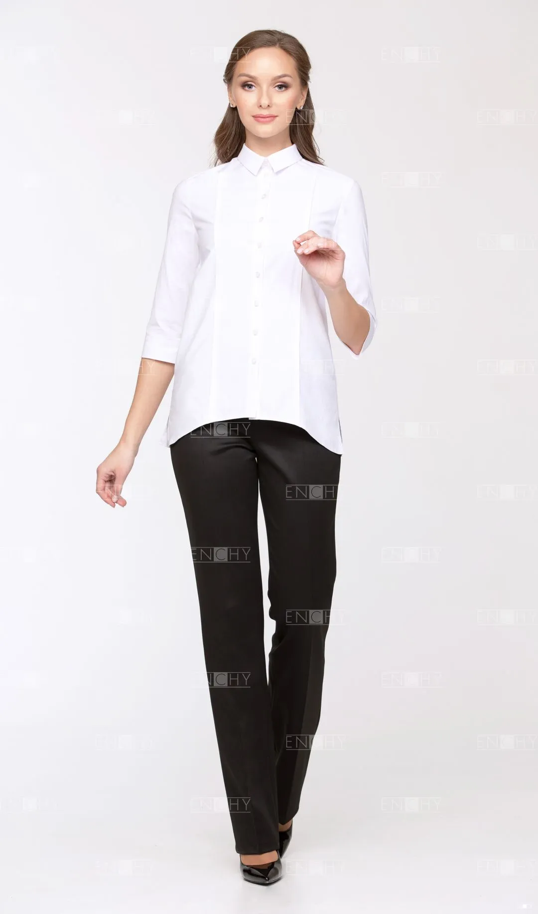 Элегантная блузка свободного кроя с рукавом 3/4 и фигурной линией низа. Вертикальные рельефы переда будут стройнить любую фигуру. Кокетка на спинке, стояче-отложной воротник, застежка на петли и пуговицы на планке. Разрезы в боковых швах сделают ваши движения более комфортными.