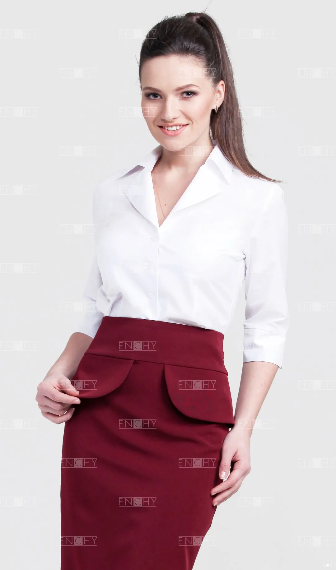 Блузка с отложными лацканами и воротником на стойке, дополненная ярким шейным платочком вызывает ностальгические чувства по истинной элегантности, которая великолепно вписывается в корпоративные будни, привнося в современную жизнь вечные форменные идеи. Блузка с нагрудными и талевыми вытачками идеально подойдет для любой фигуры, а рукав длиной 3/4, имеющий манжету с разрезами создаст истинную офисную элегантность.