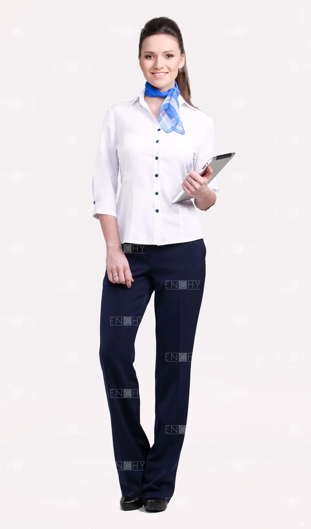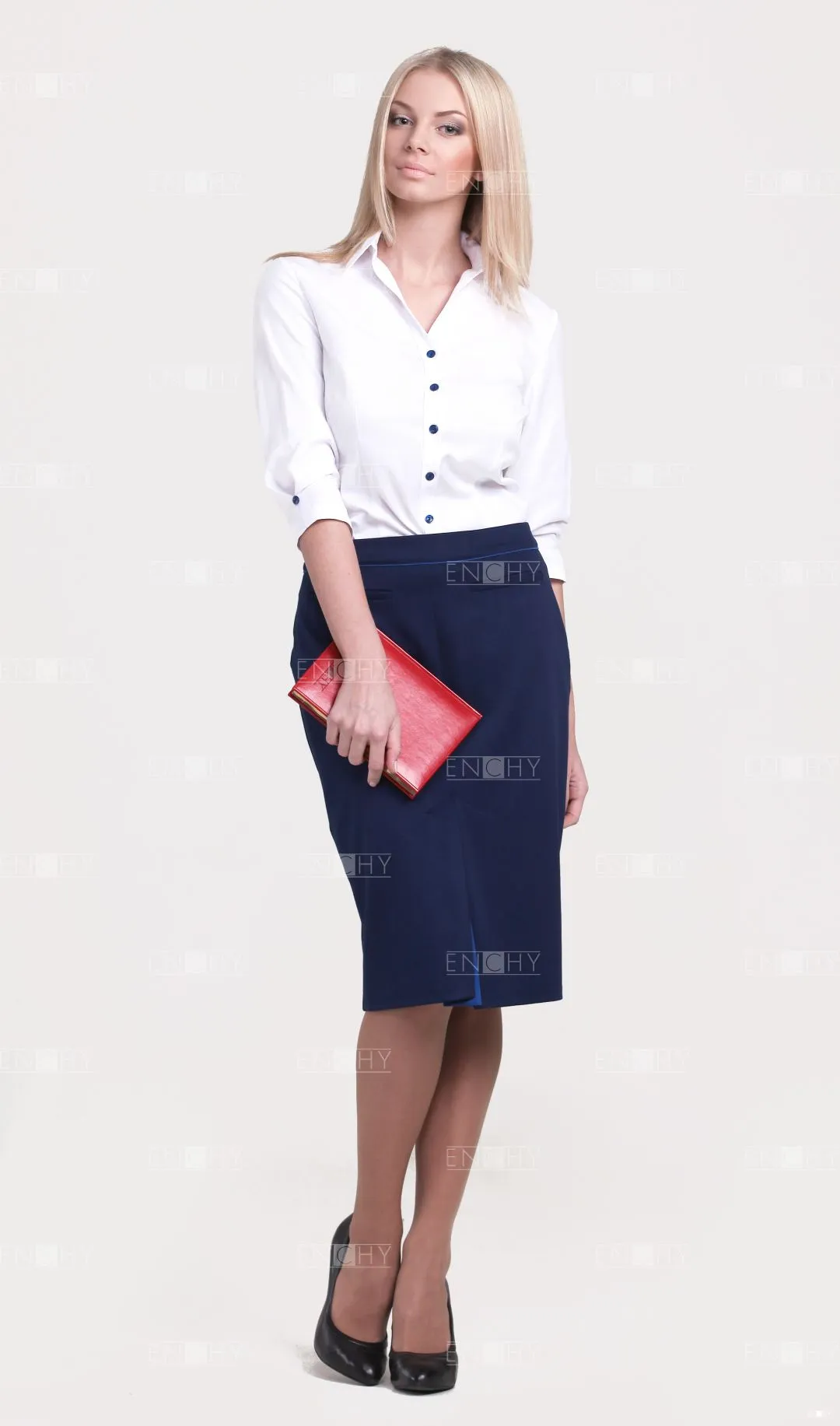 Элегантный вариант для создания мягкого делового образа. Блузка с нагрудными и талевыми вытачками, открытой застежкой и воротником на стойке имеет необычный рукав длиной 3/4. Внизу рукав заложен модной встречной складкой и декорирован пуговицей. Удобство рукава такого кроя оценят не только офисные сотрудницы, но и девушки из сервисных служб. Блузку можно выполнить как с пуговицами в тон основной ткани, так и яркого контрастного цвета, тем самым сделав акцент на фирменном цвете.