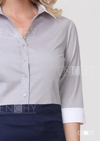 Стильная блуза полуприлегающего силуэта с талиевыми вытачками на переде и спинке, и интересным подрезом под грудью. Открытая застежка на петли и пуговицы, стояче-отложной воротник. Рукав 3/4 с притачной манжетой и разрезом.