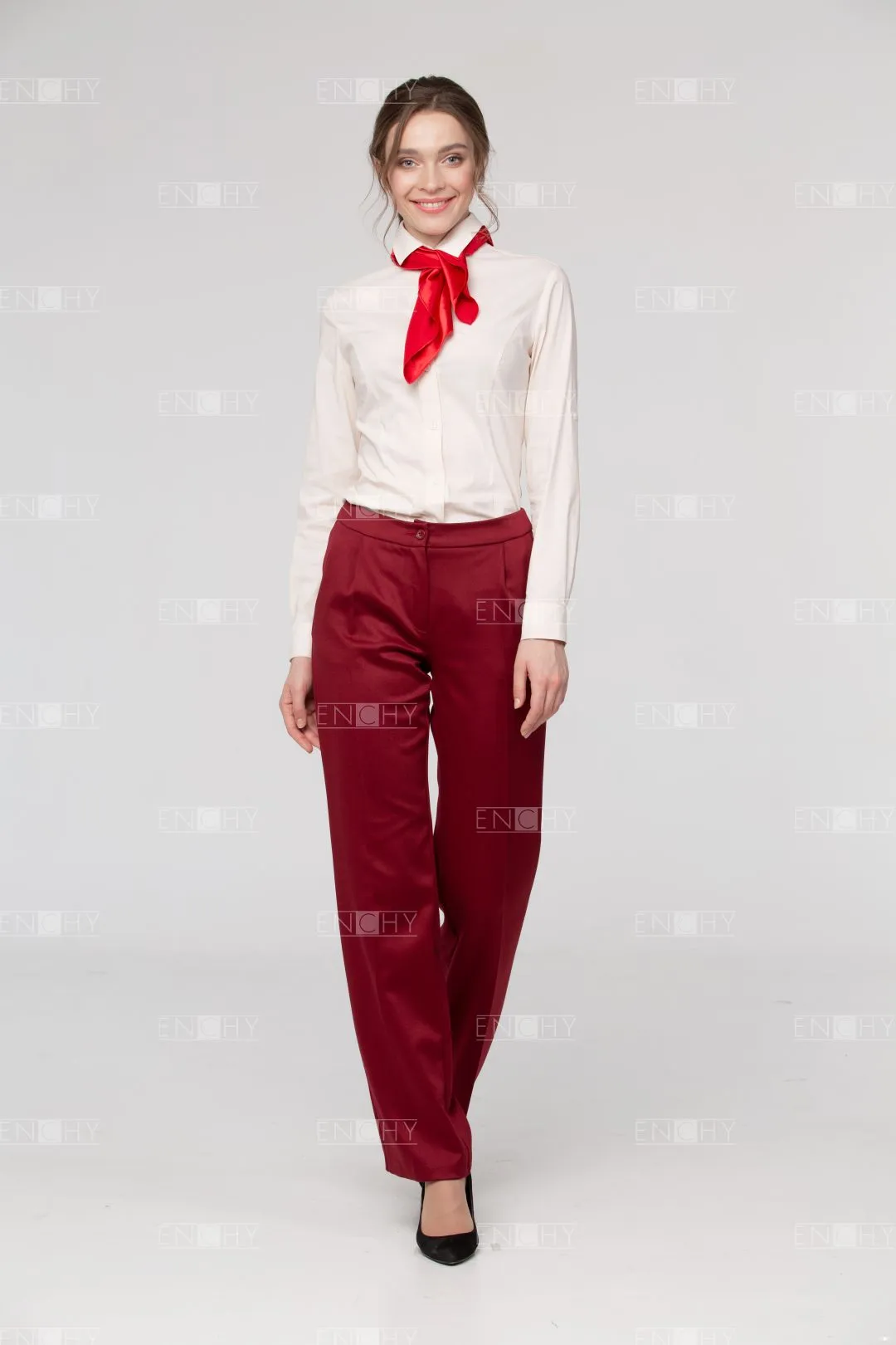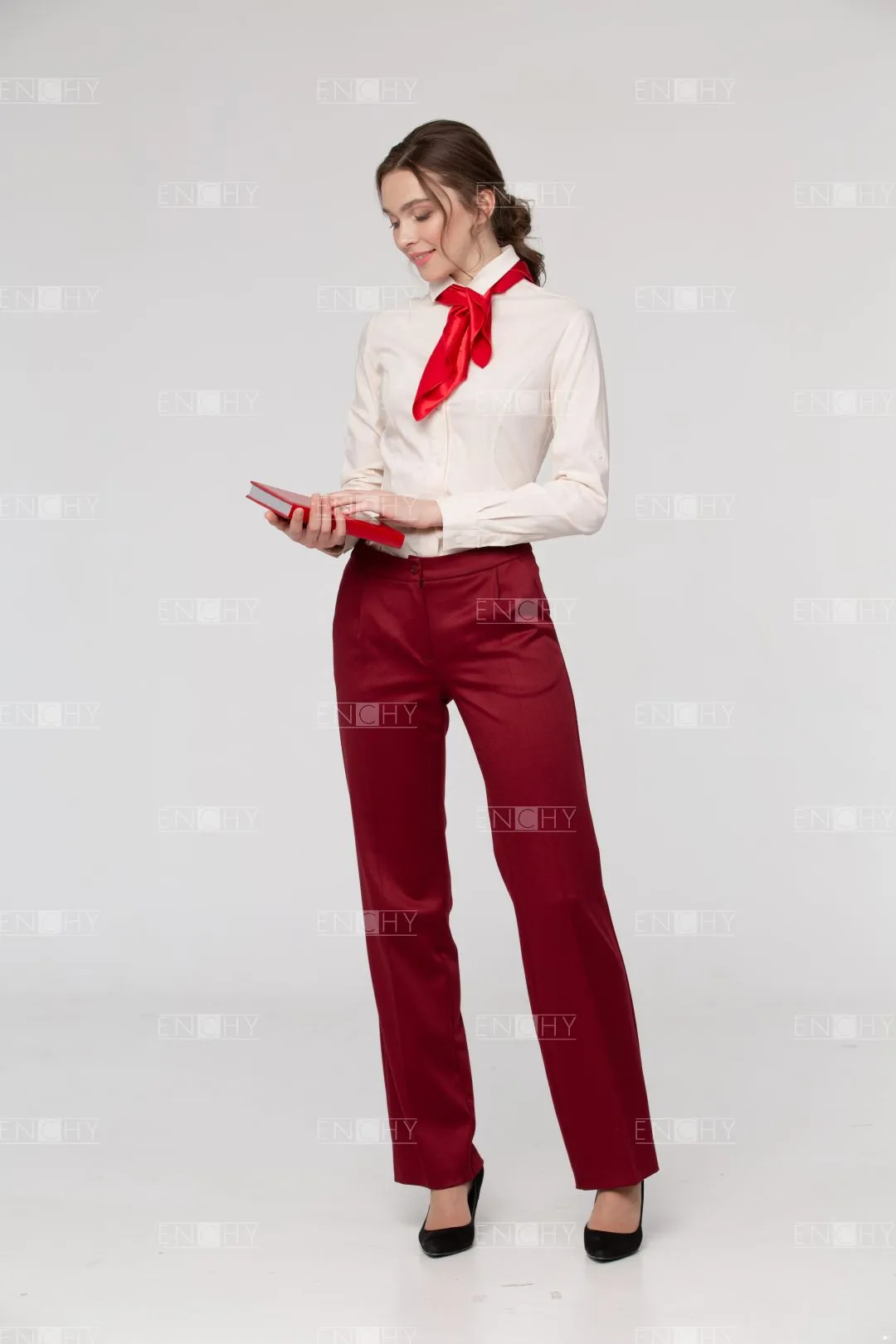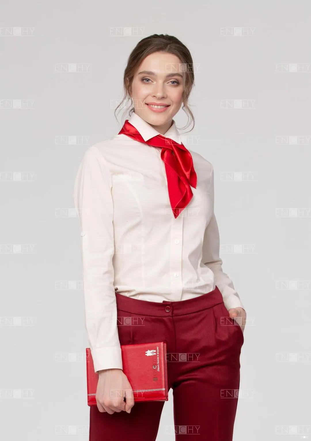 Блуза женская с длинным рукавом полуприлегающего силуэта со стояче- отложнным вортником. Конец стойки округлый, застегивается на 2 петли - пуговицы. Отлет вортника с прямыми углами. Форма образована по переду рельефами из проймы, по спинке - двойная кокетка и рельефы от кокетки до низа. Рукав блузы втачной одношовный длинный с притачной манжетой. На манжете обработана 1 петля 1 пуговица. Разрез рукава обработан планкой с острым углом. Так же рукав имеет пату на уровне чуть выше логтя. Блуза имеет ценральную застежку с отрезной внутренней и внешней планкой. Блуза застегивается на 6 обметанных петель и 6 пуговиц. Низ изделия слегка округлой формы.