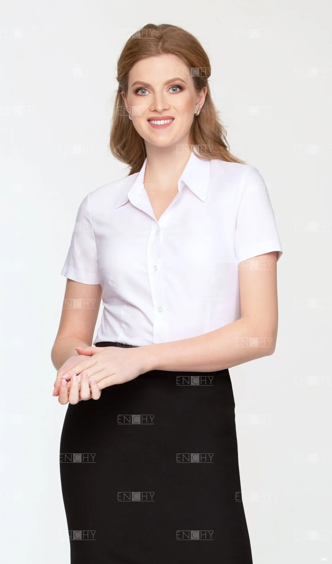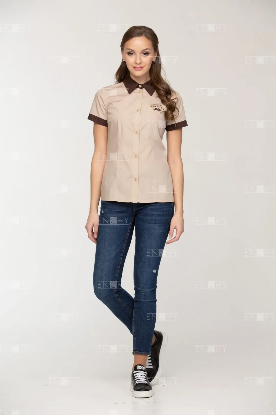 Минималистичная блуза с нагрудными и талевыми вытачками. Короткий рукав, застежка на пуговицы на планке, стояче- отложной воротник с отрезной стойкой, которую можно выполнить в контрастном цвете.