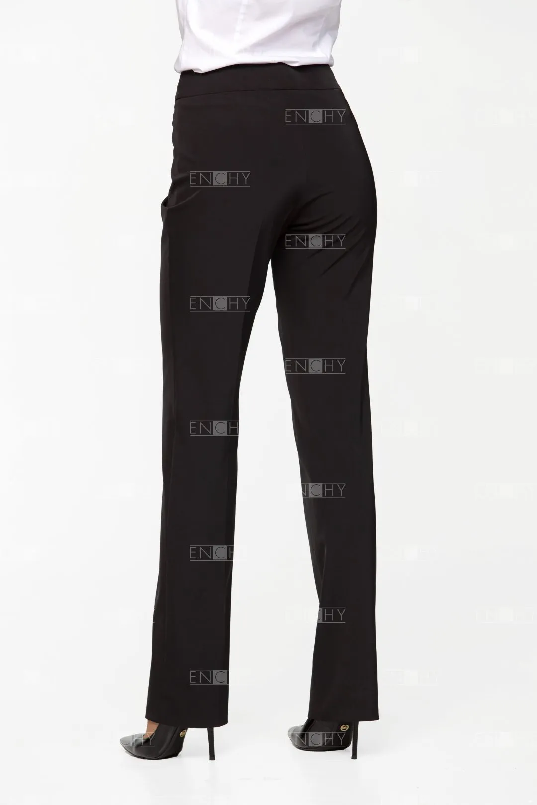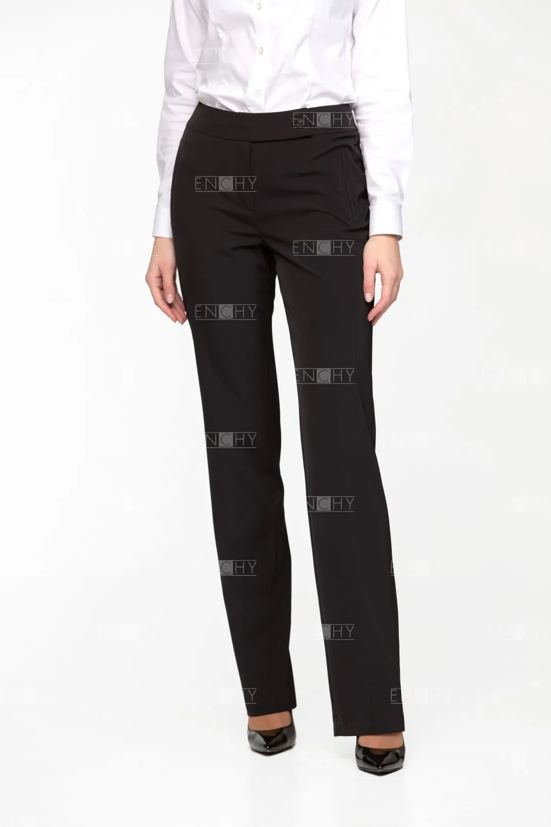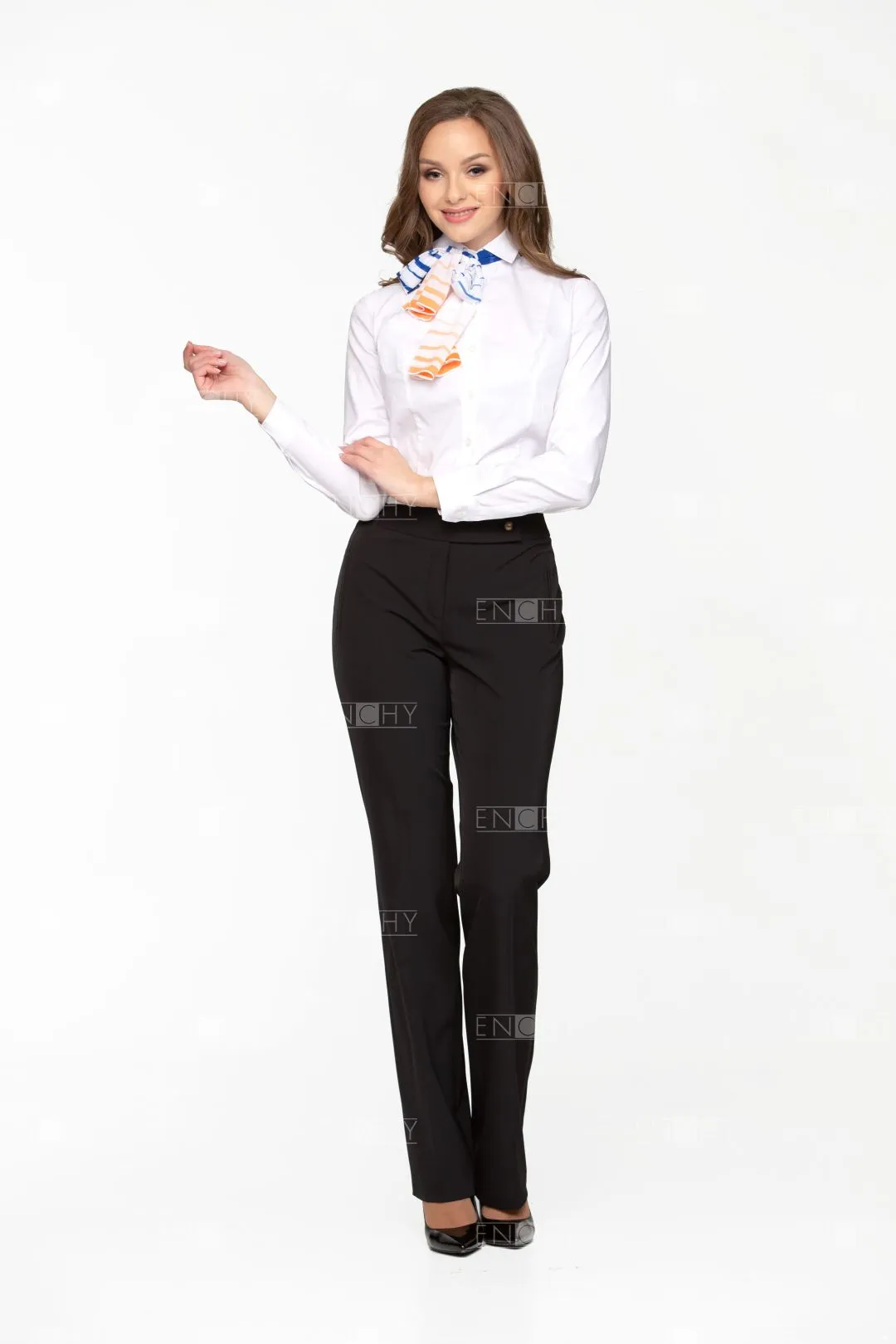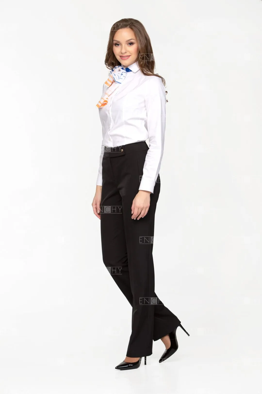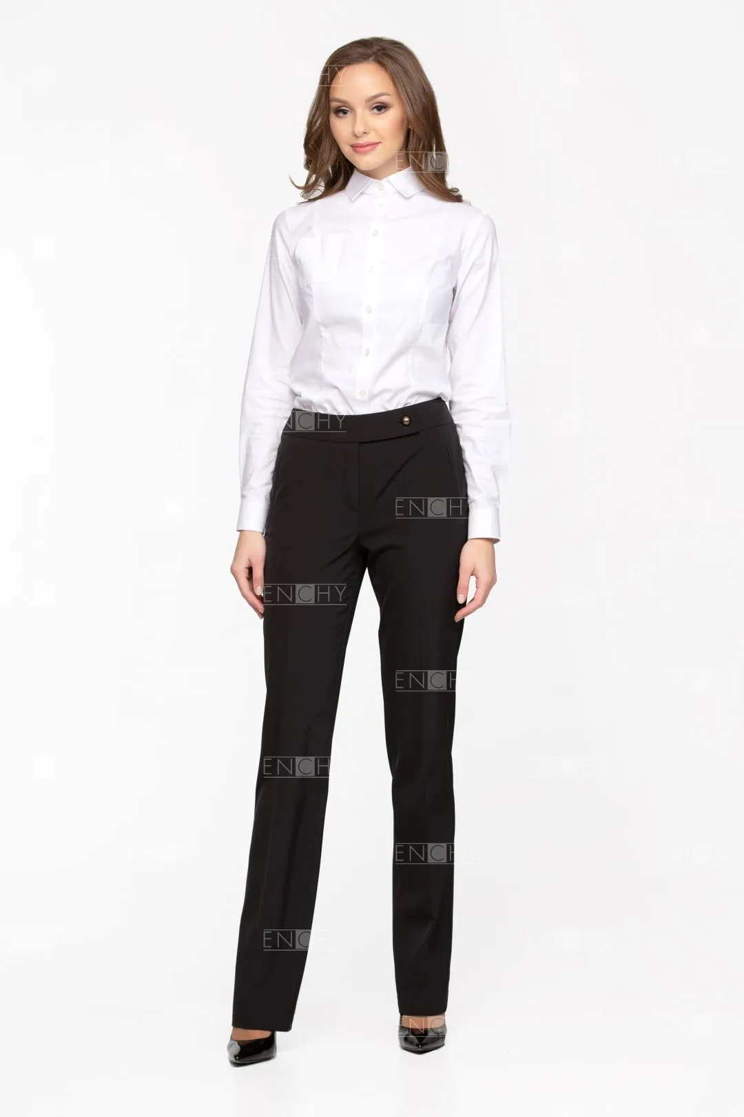 Стильные прямые брюки небольшой ширины на кокетке - отличный офисный вариант. Брюки со стрелкой. По бокам имитация прорезных карманов "в рамку", расположенных вертикально. Застежка спереди гульфик на молнию и смещенную пуговицу на широкой кокетке .