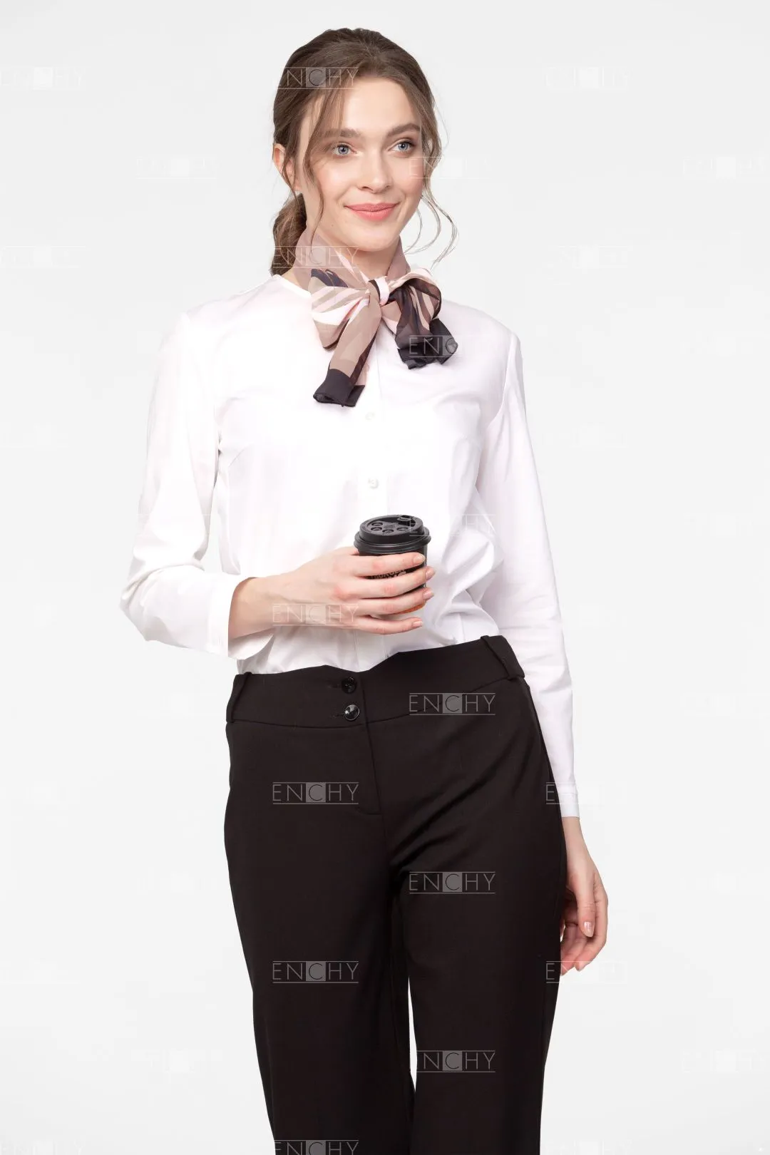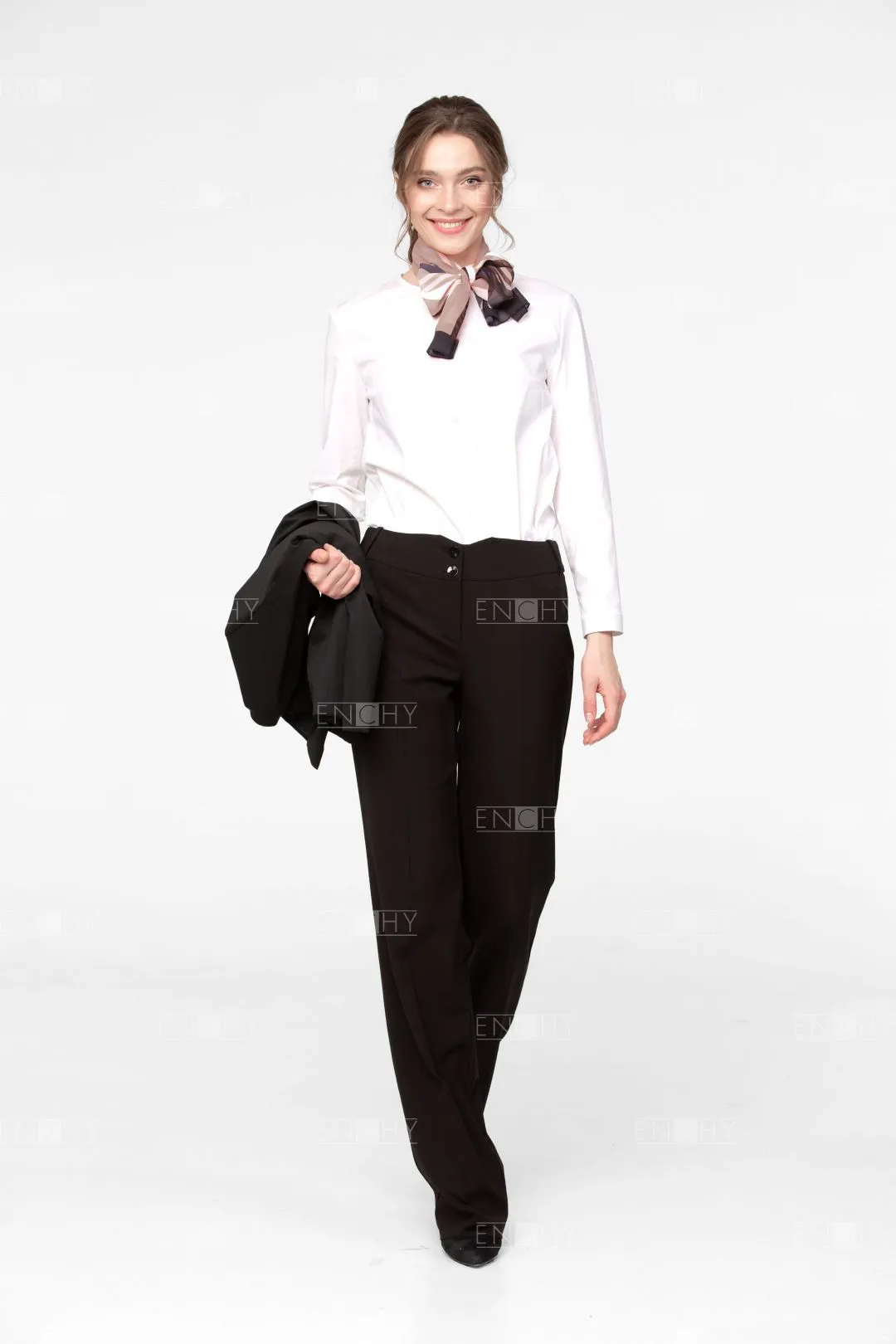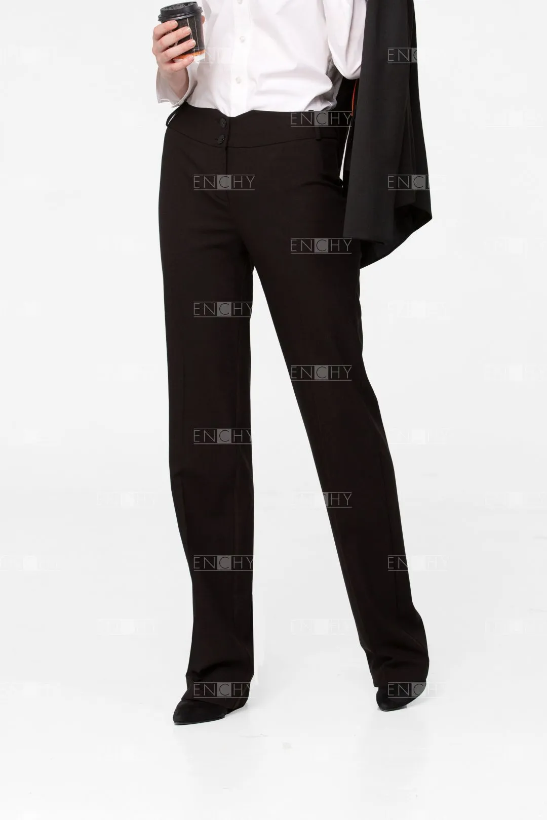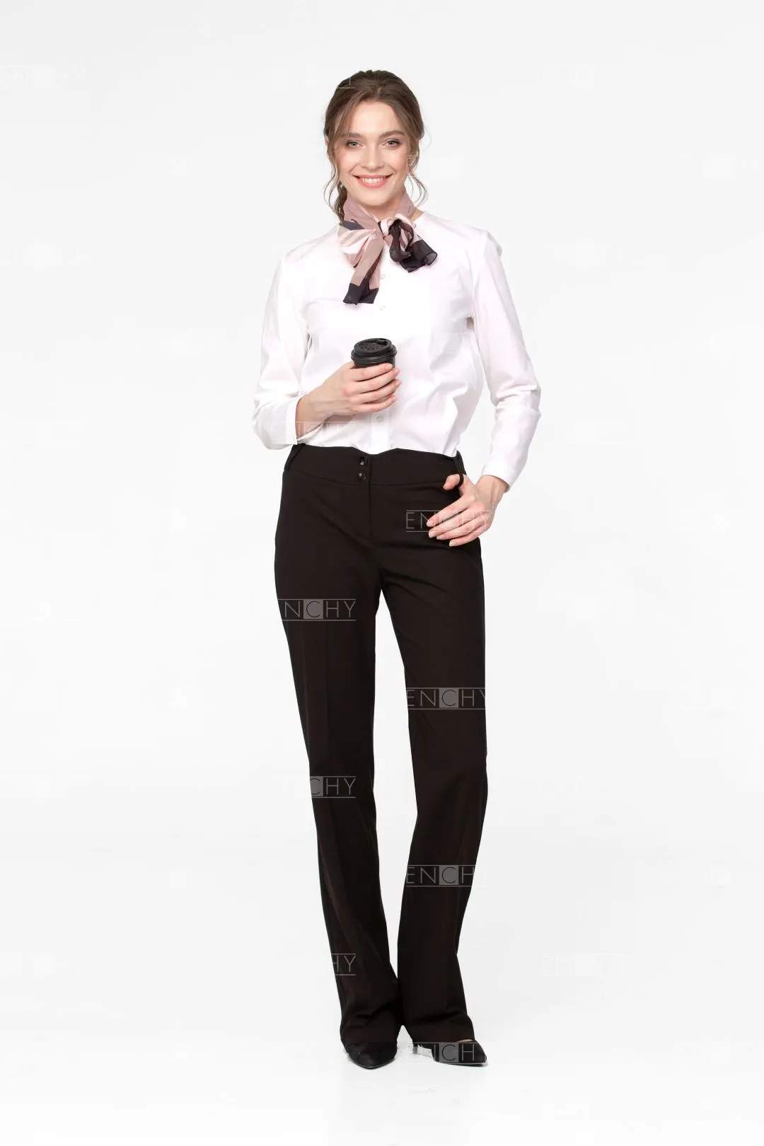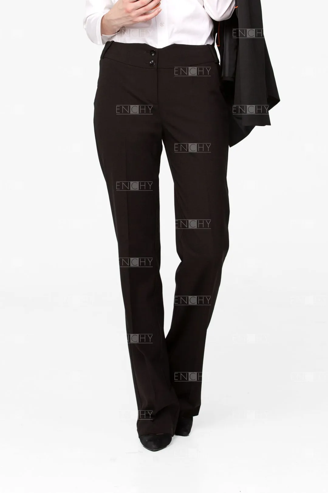 Новое звучание брюкам прямого покроя средней ширины придает широкий пояс с фигурной линией верха. Брюки женские со стрелками. Фигурный пояс застегивается на 2 пуговицы. Застежка брюк на гульфик и откосок. На поясе по переду располагаются 2 шлевки. Задняя половинка брюк с вытачками и 3 шлевками.