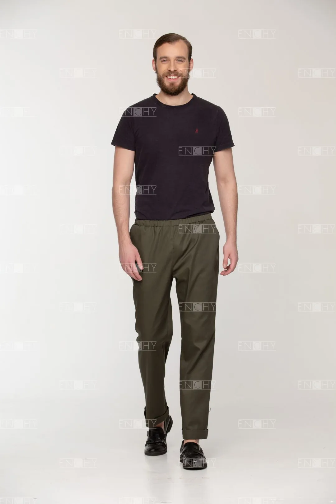Брюки рабочие мужские на отрезном поясе на резинке со шнуром внутри. Неширокие внизу с манжетами. Карманы в отрезных бочках.