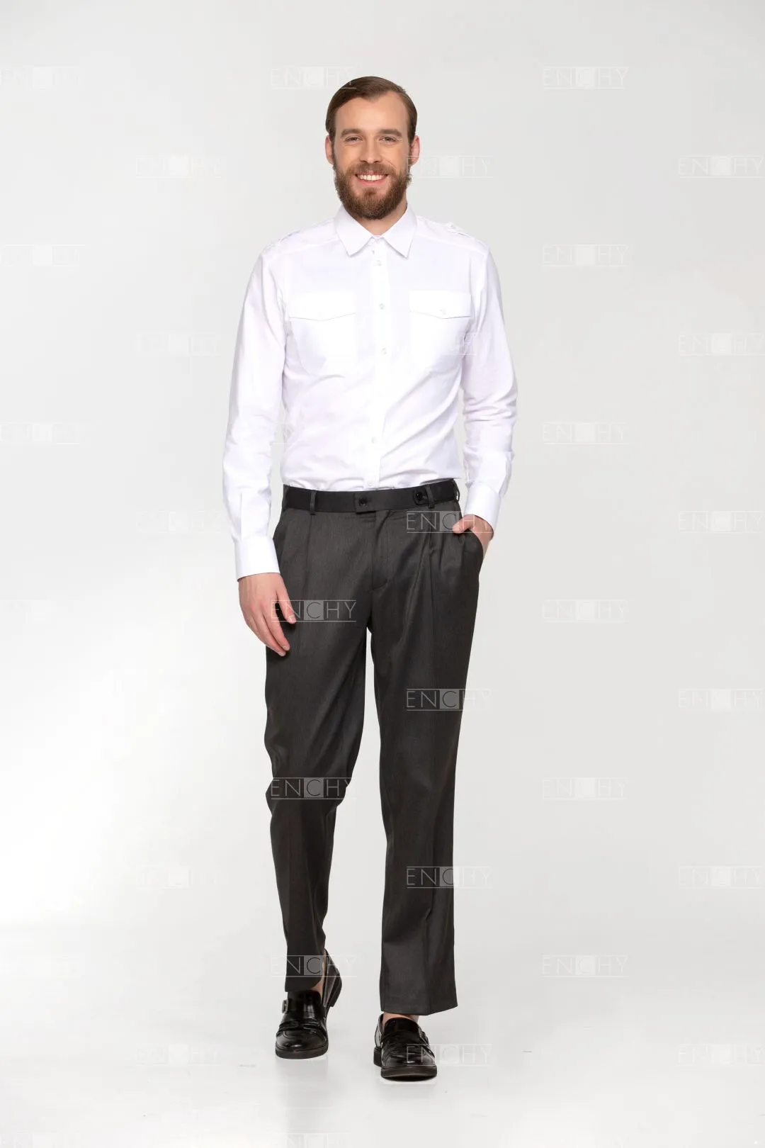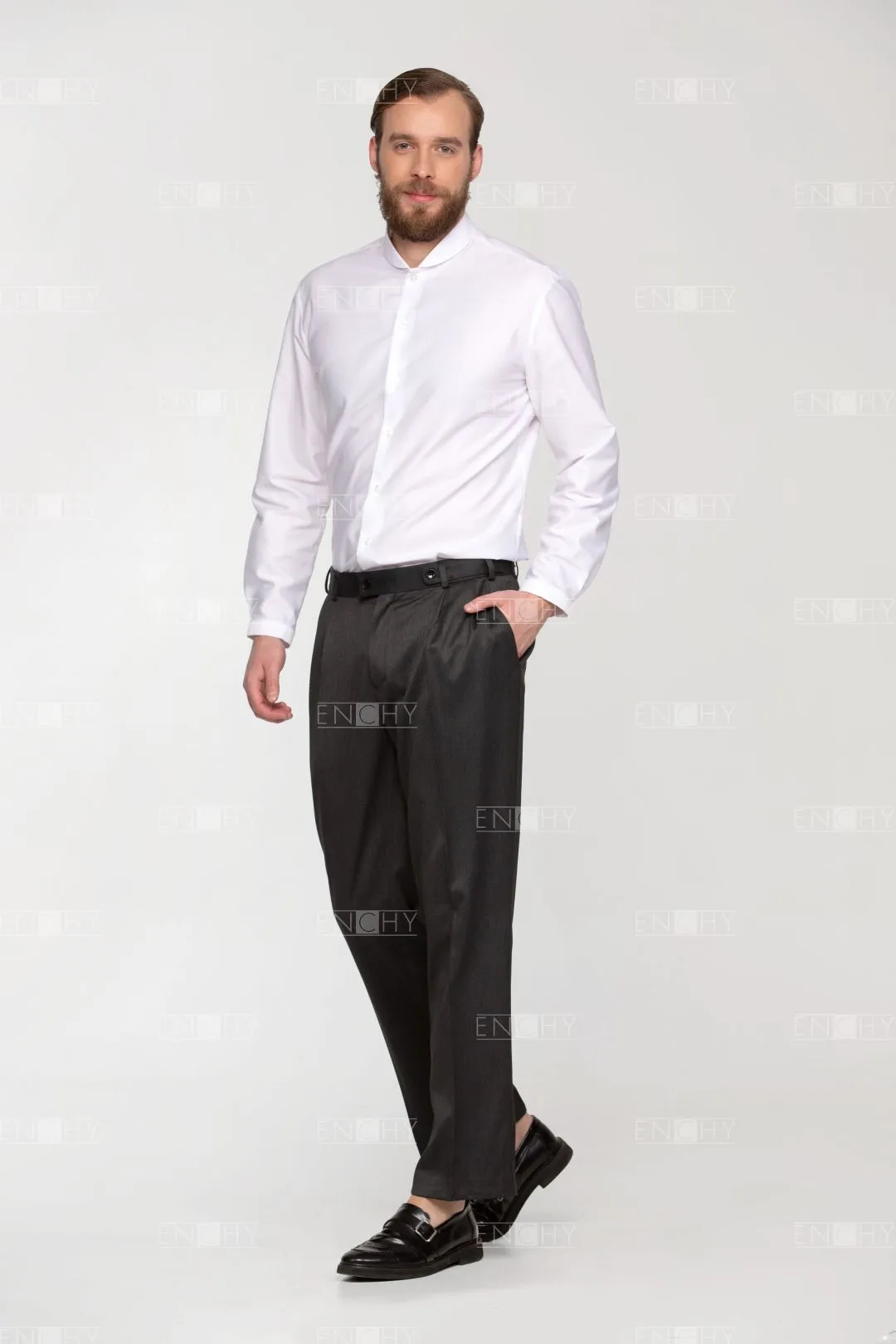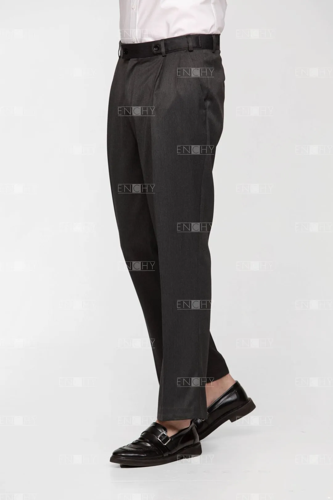 Мужские брюки актуальной модной формы по достоинству оценят сотрудники молодого коллектива. Брюки со складками возле пояса, слегка укорочены. Боковые карманы спереди, сзади один прорезной карман в рамку и застежкой на пуговицу. Пояс декорирован хлястиком с левой стороны.