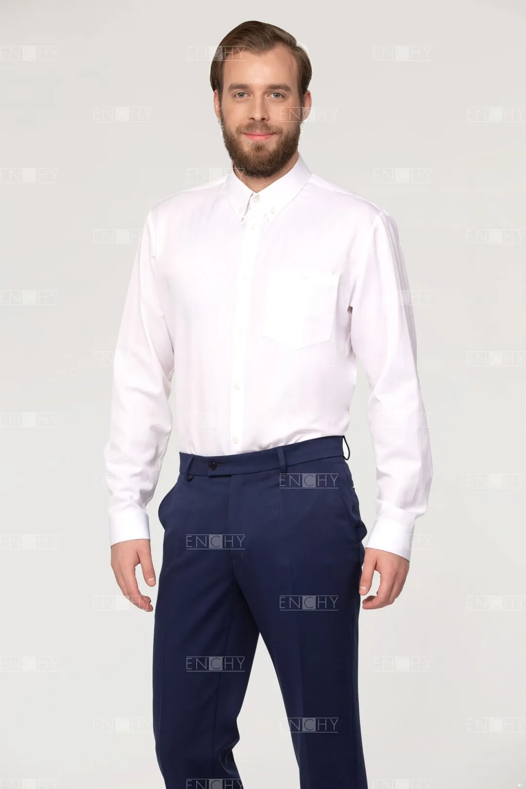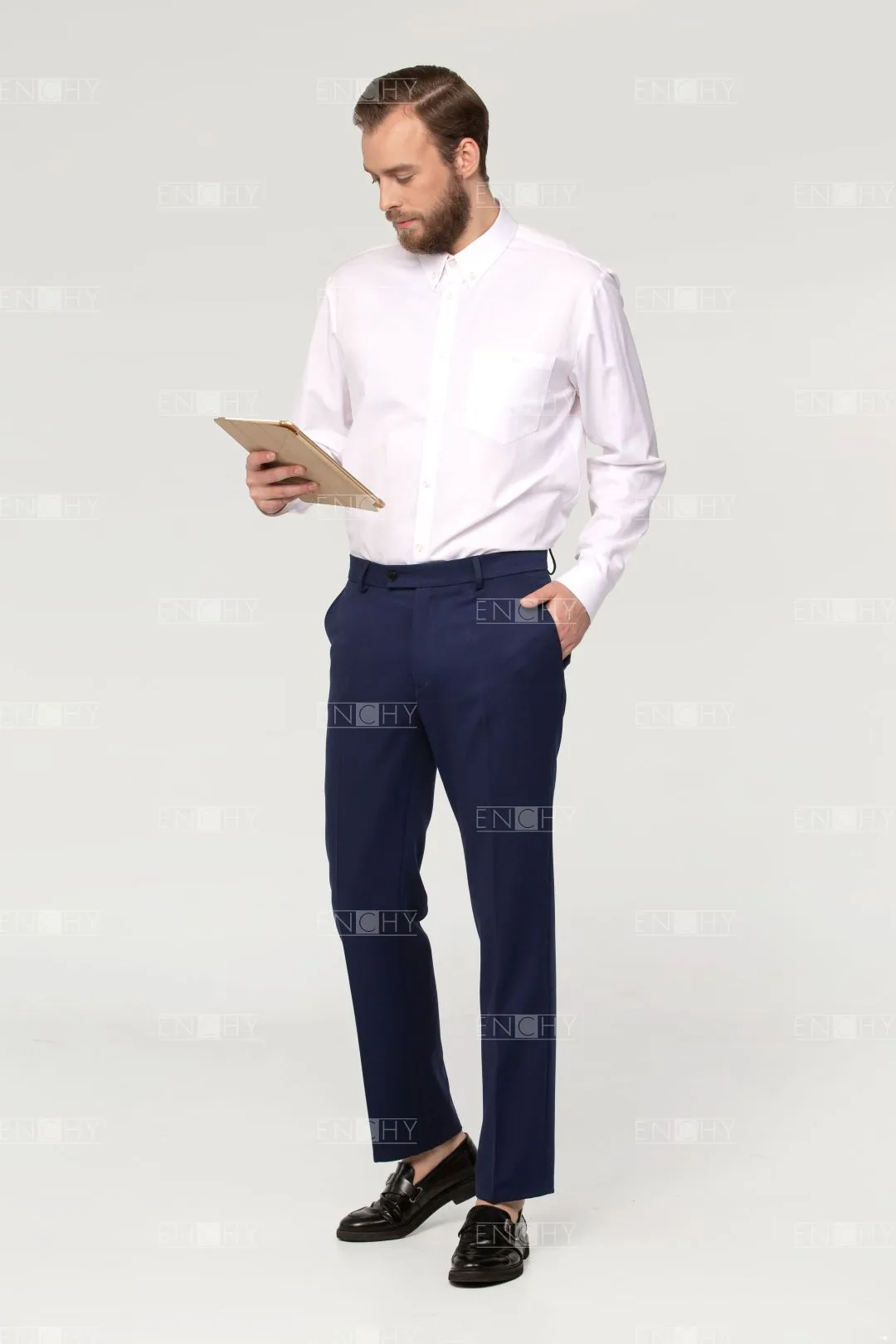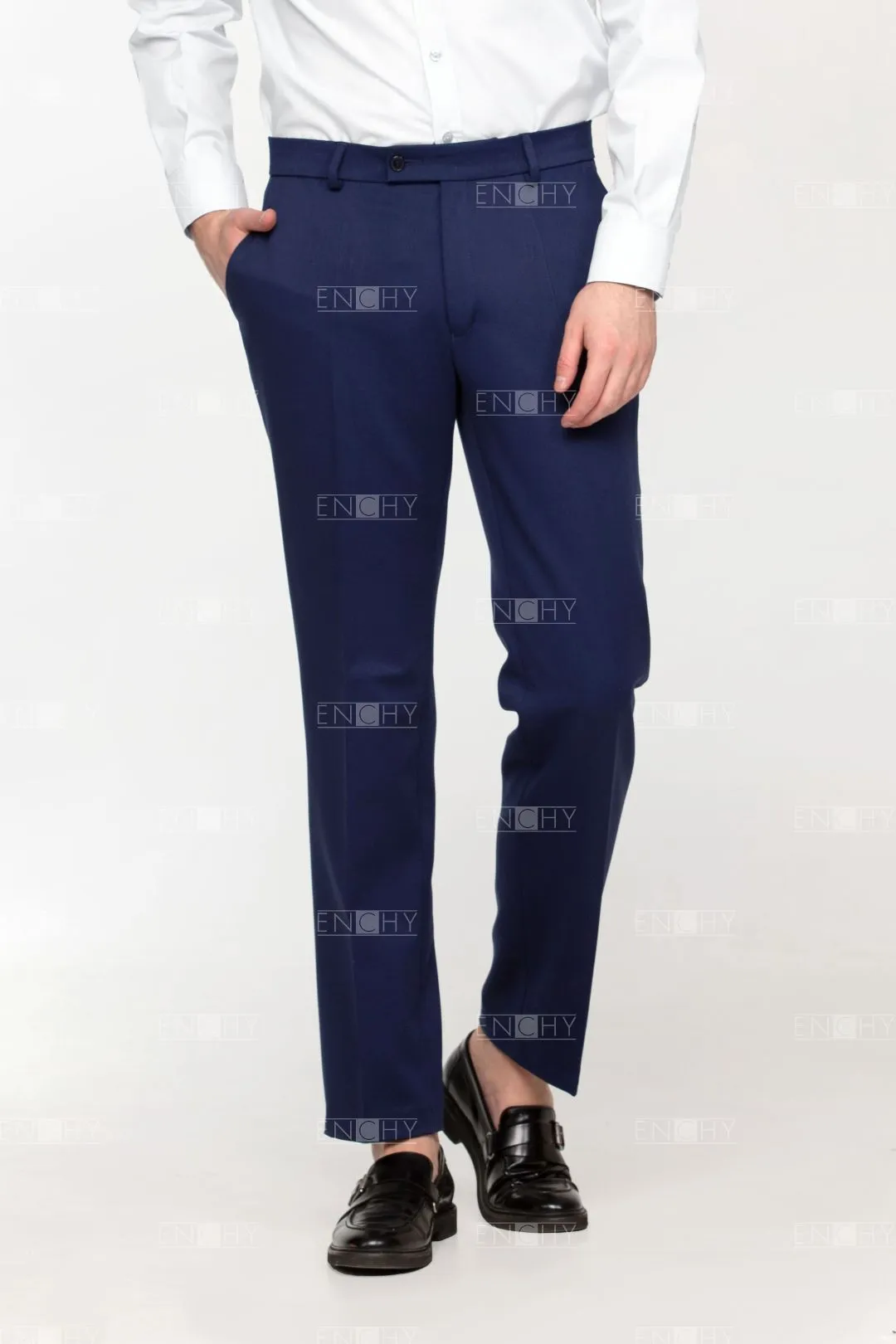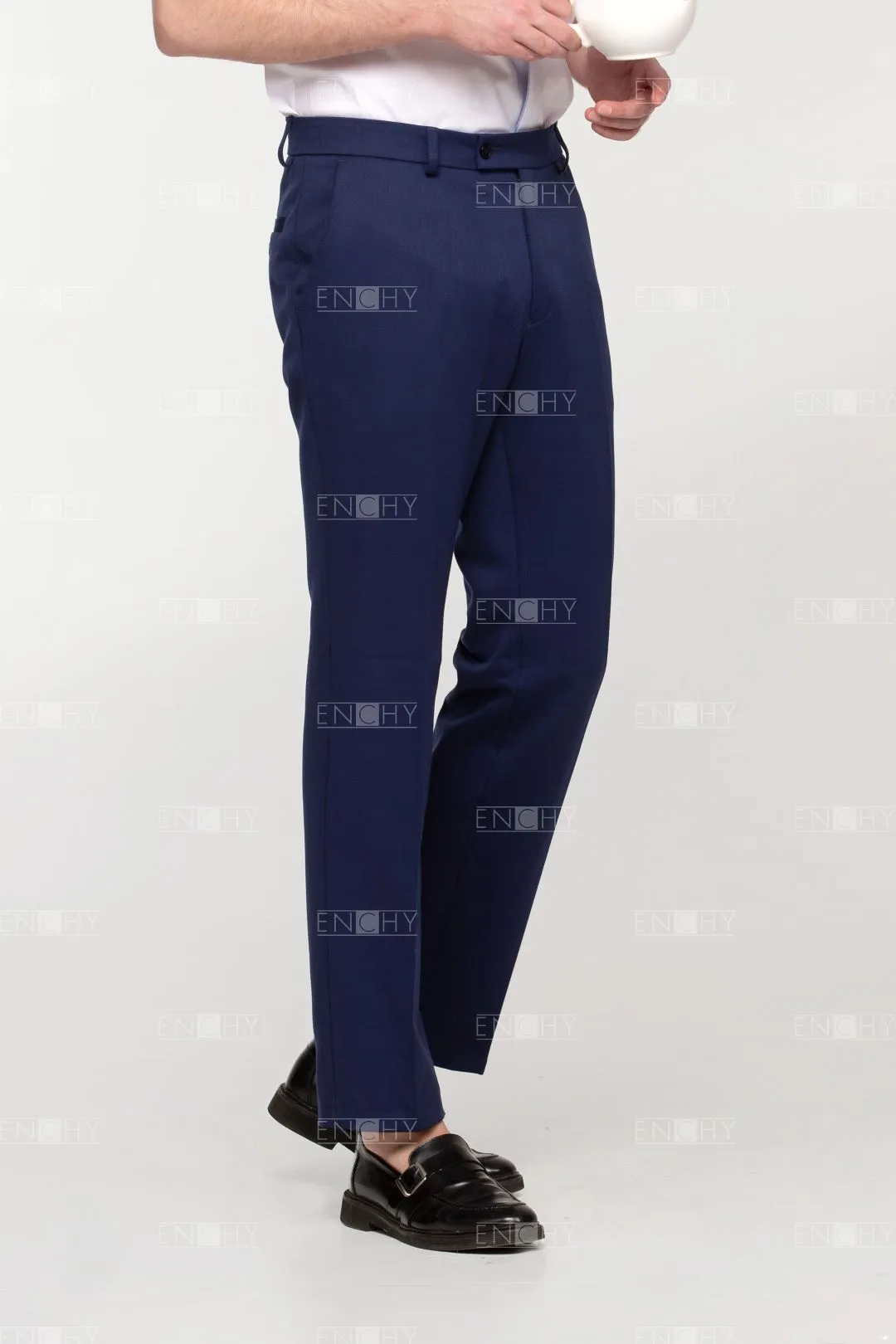 Мужские брюки актуальной модной формы по достоинству оценят сотрудники молодого коллектива. Брюки без складок возле пояса, внизу слегка заужены. Боковые карманы спереди, сзади - прорезные карманы с листочкой и застежкой на пуговицу, функциональные. Левая часть пояса чуть удлинена.