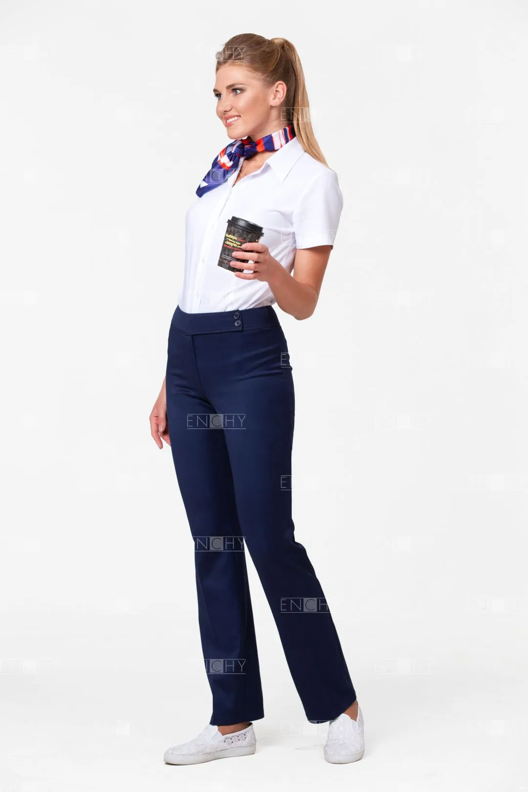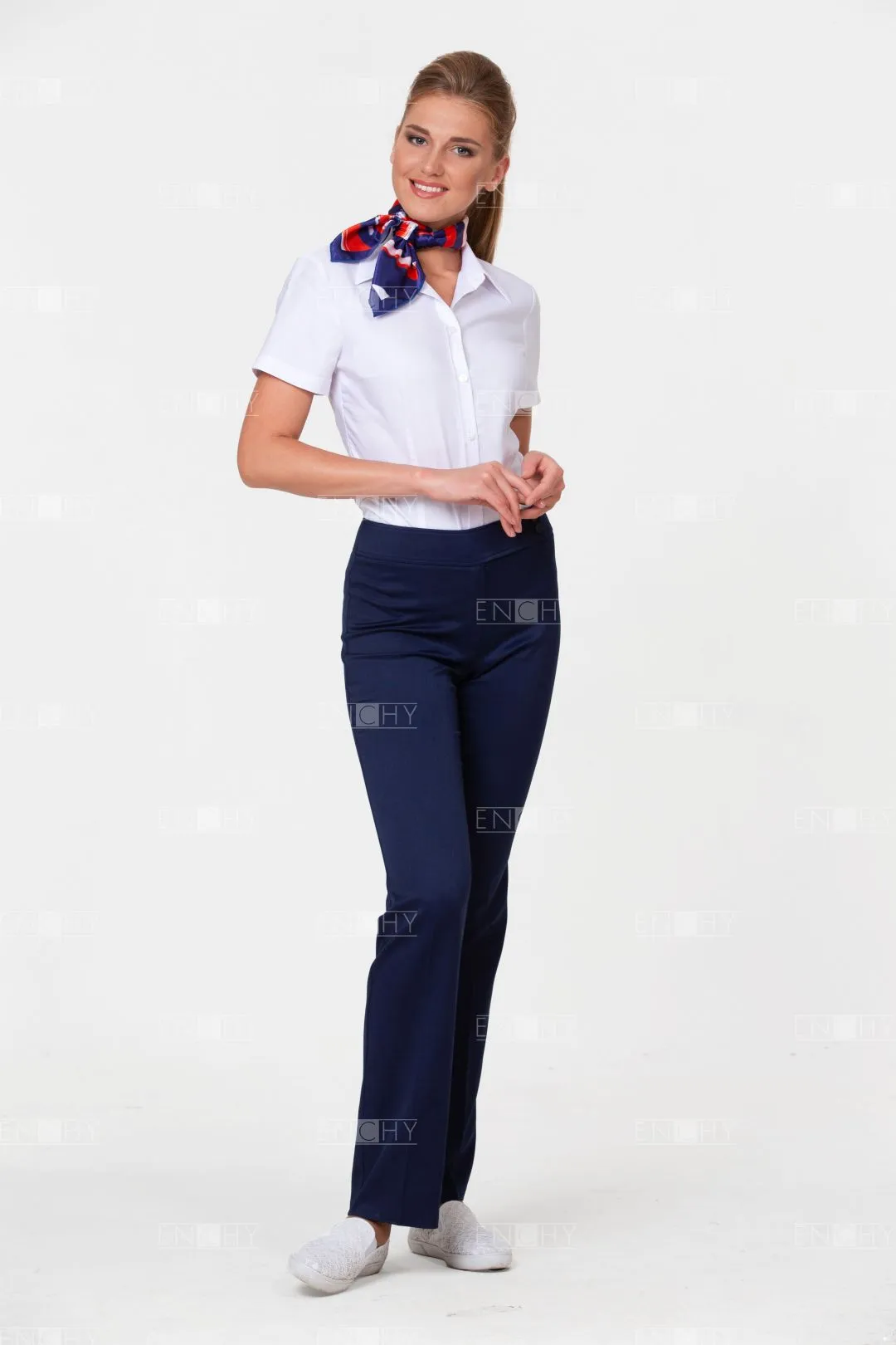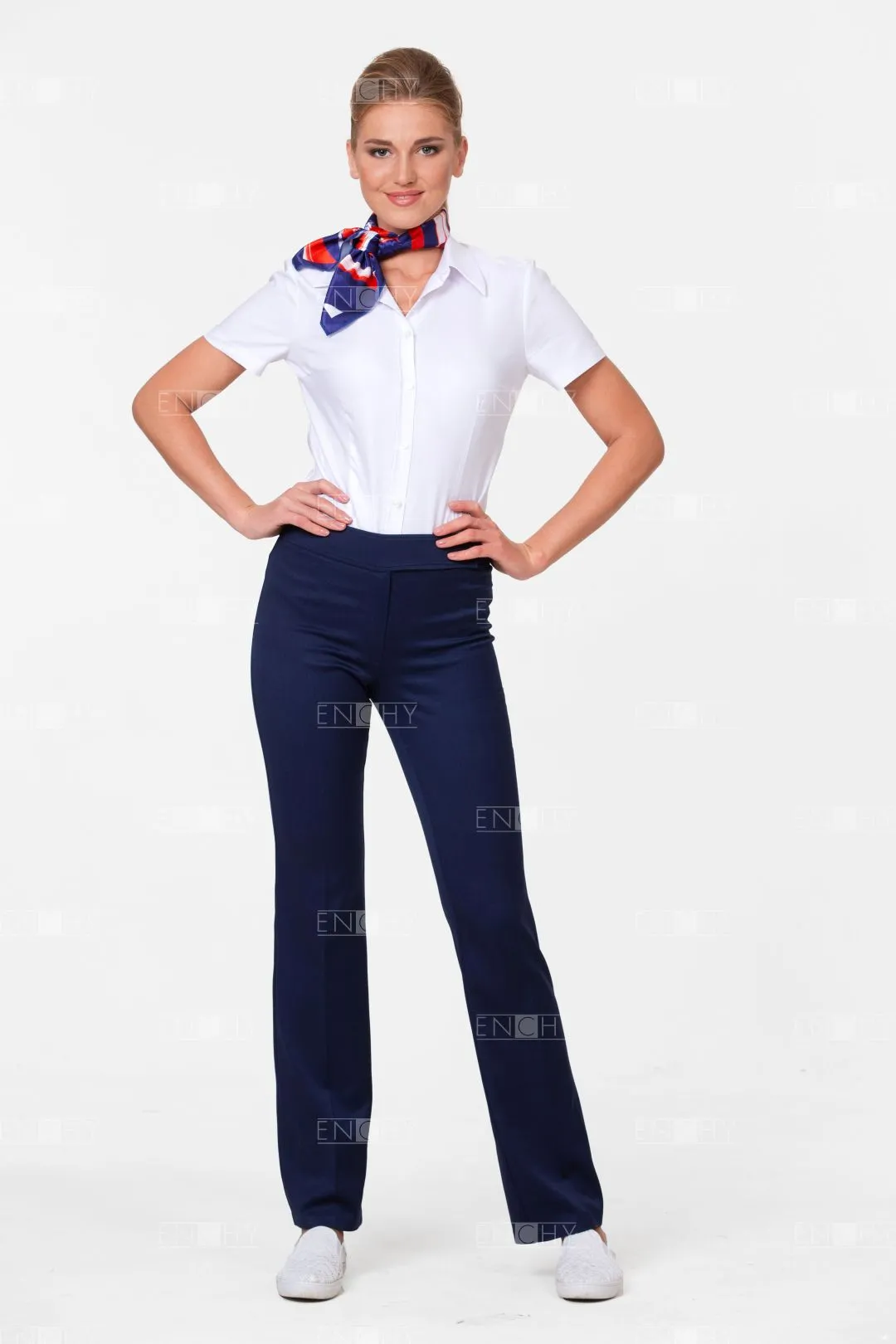 Брюки женские слегка зауженные, посадка чуть ниже талии. Ширина пояса 5,5 см. Правая часть пояса удлинена и застегивается на 2 пуговицы. По поясу с двух сторон отделочные строчки на 0,5 от края. Застежка брюк на гульфик и откосок на спиральной молнии. Дополнительная внутренняя пуговица- петля. Задняя половинка брюк с вытачками.