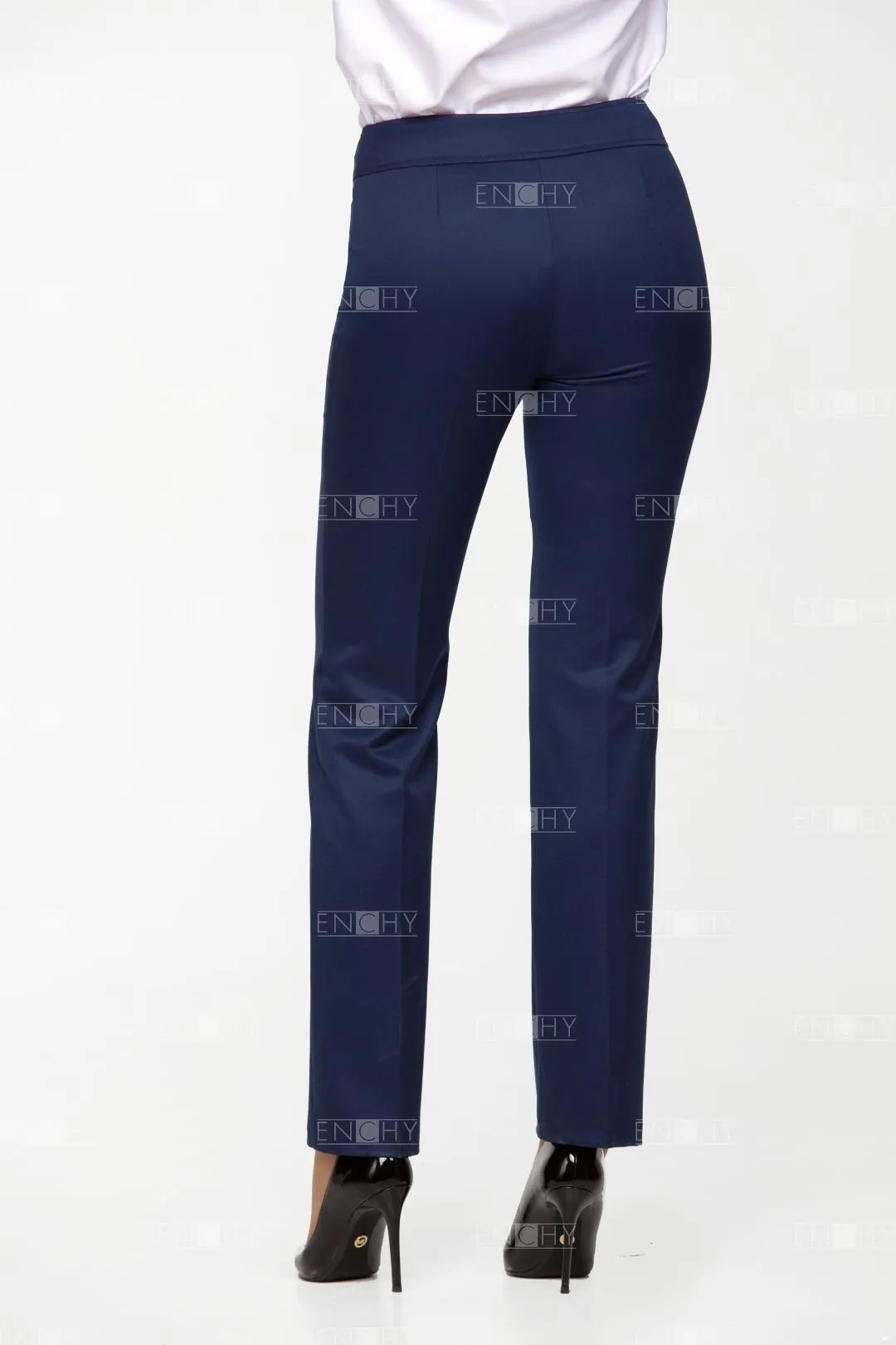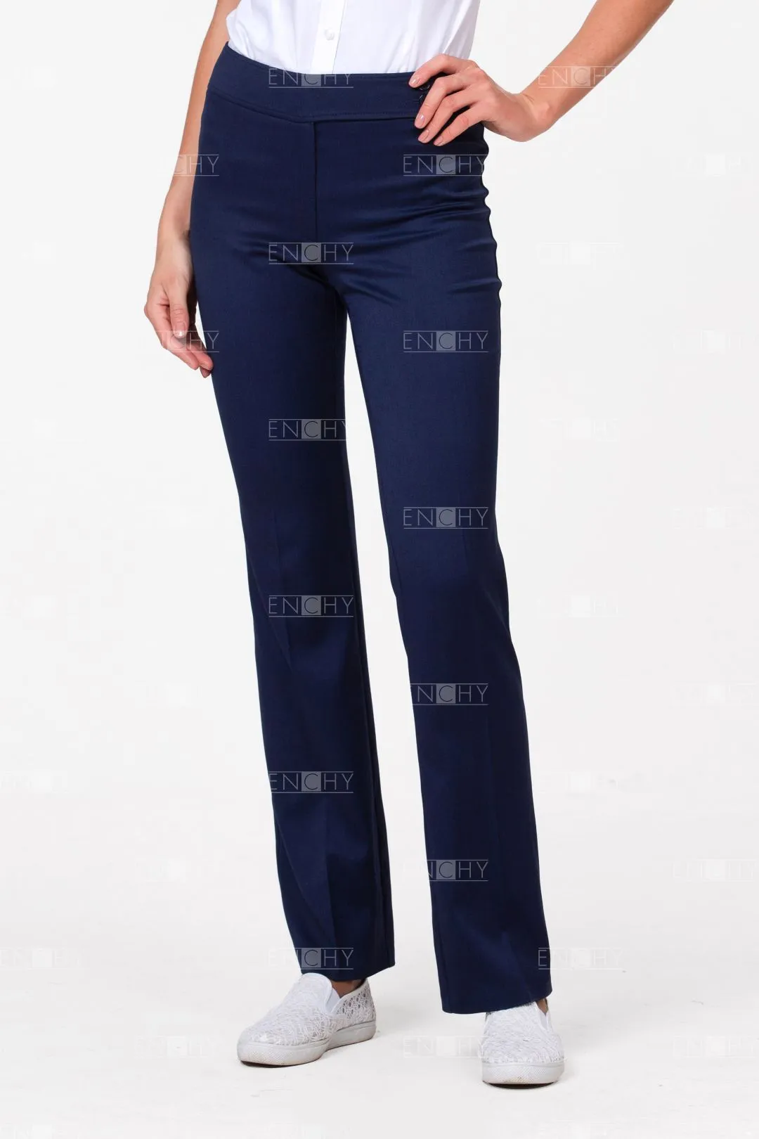 Универсальные брюки модной ширины очень удобные в носке: средняя посадка, широкий пояс, отсутствие карманов и заутюженные стрелки.