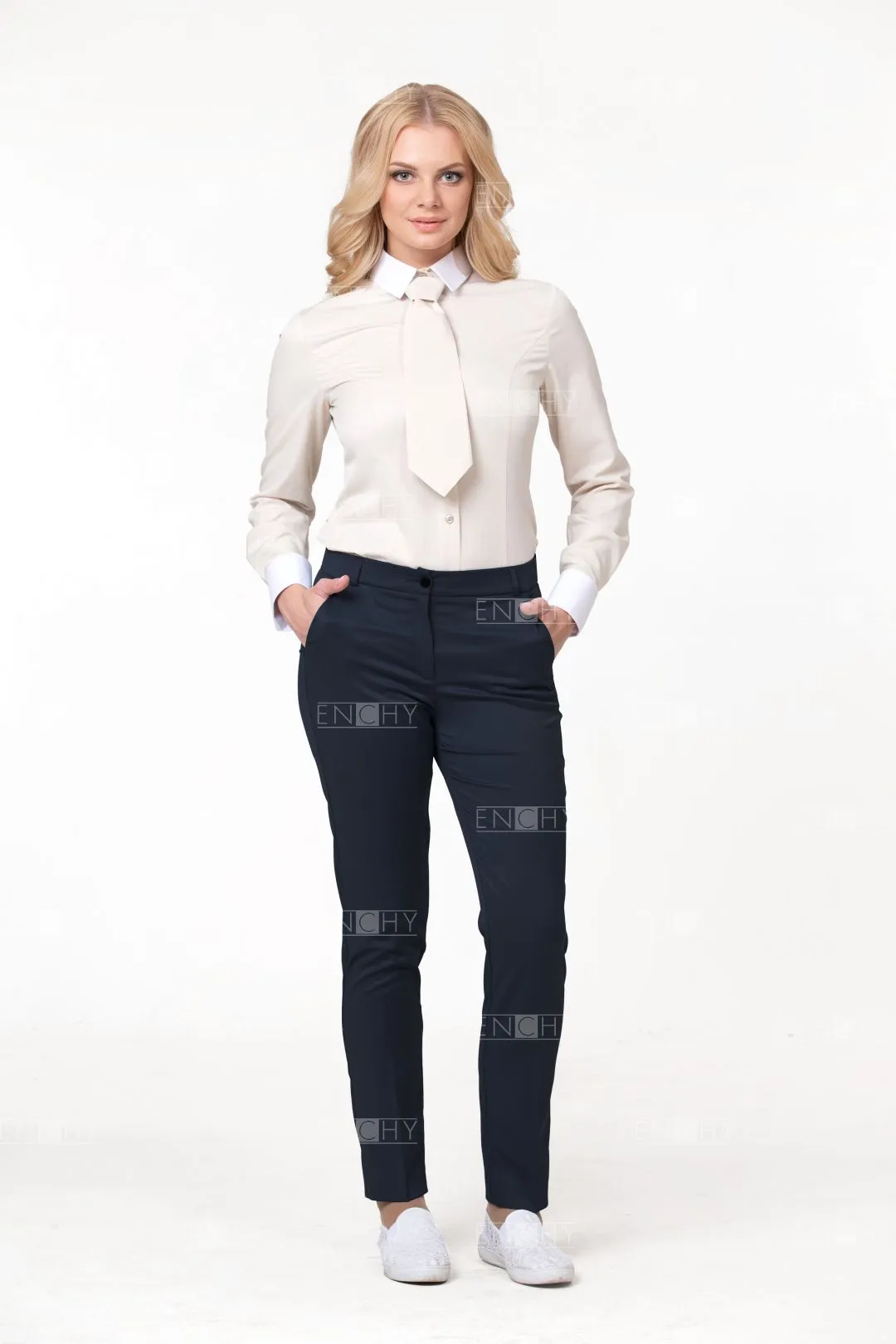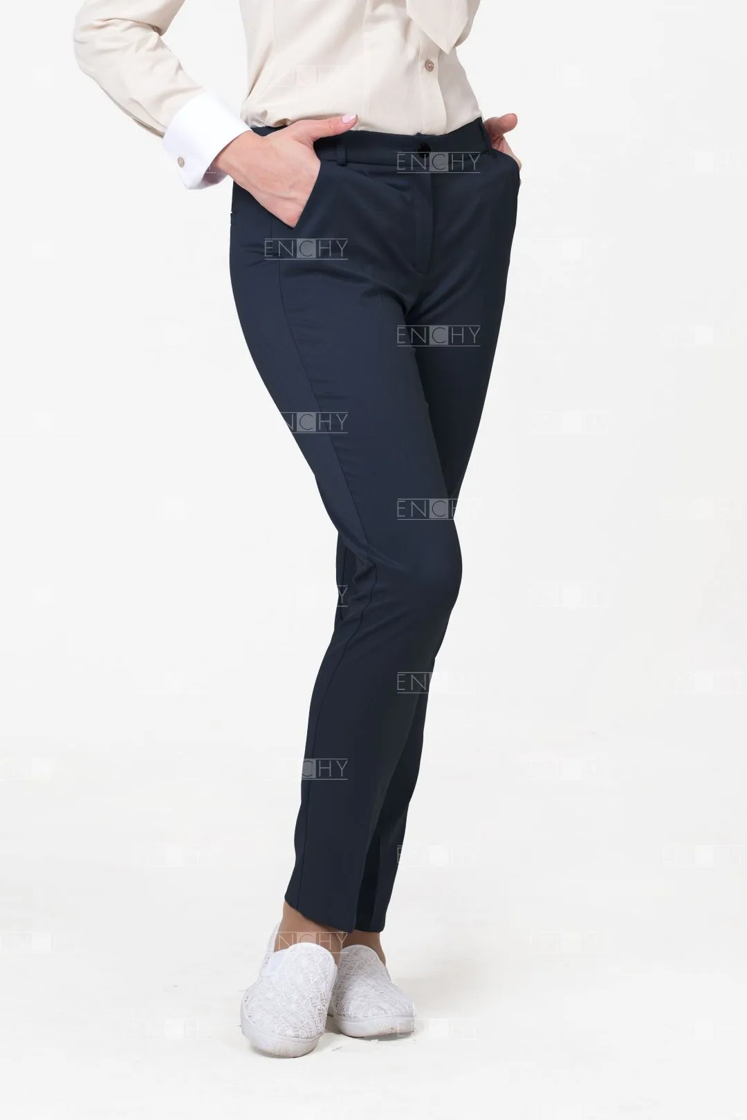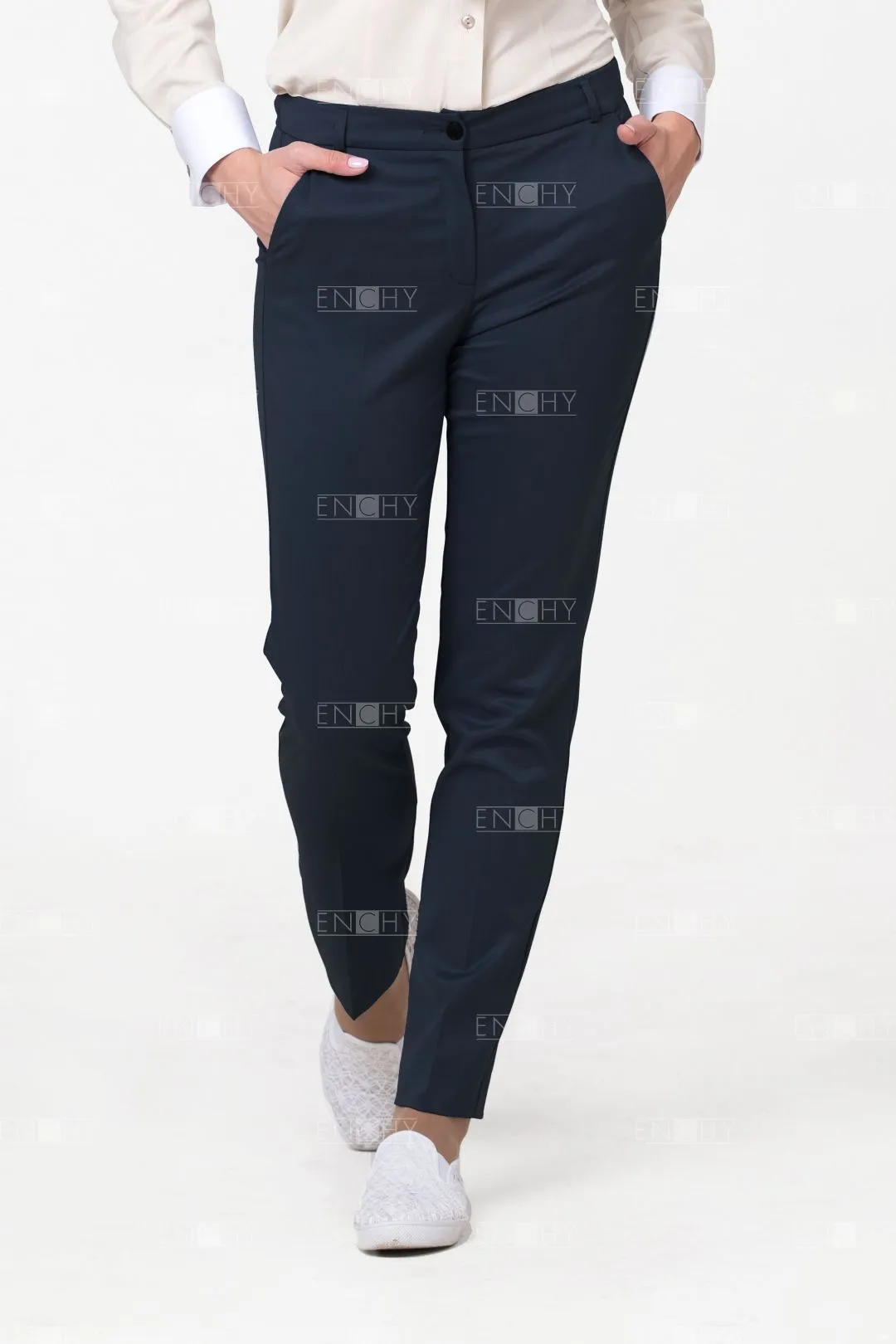 Брюки женские со средней посадкой на притачном нешироком поясе с одной пуговицей. Внизу брюки зауженные - дудочки. Длина брюк до щиколотки. На передних половинках брюк спроектированы карманы в отрезных бочках. Задние половинки брюк с талиевыми вытачками. Дизайн дополняют карманы - обманки с листочками. Брюки со стрелками.