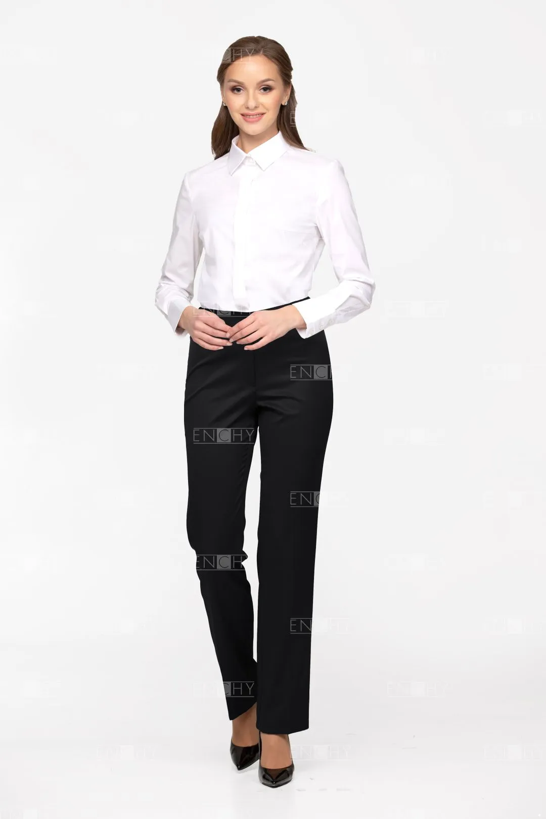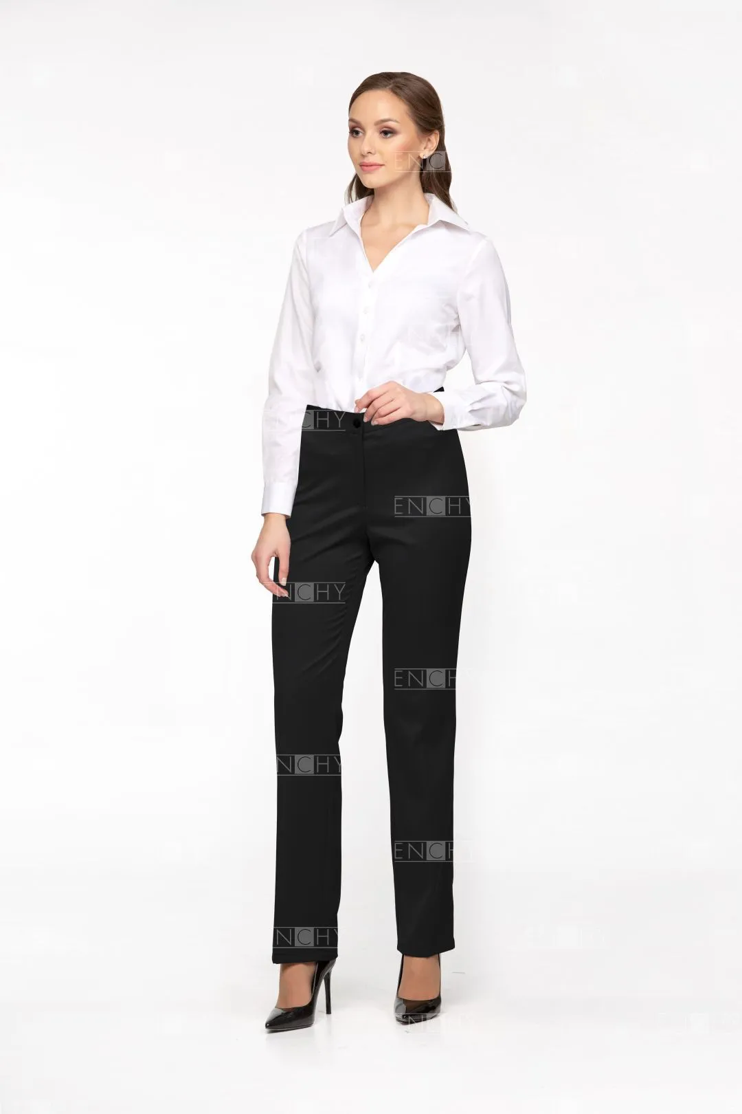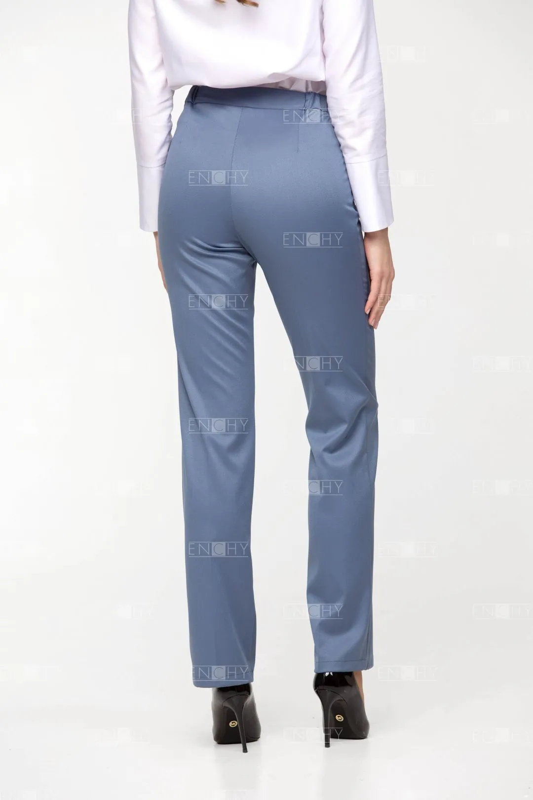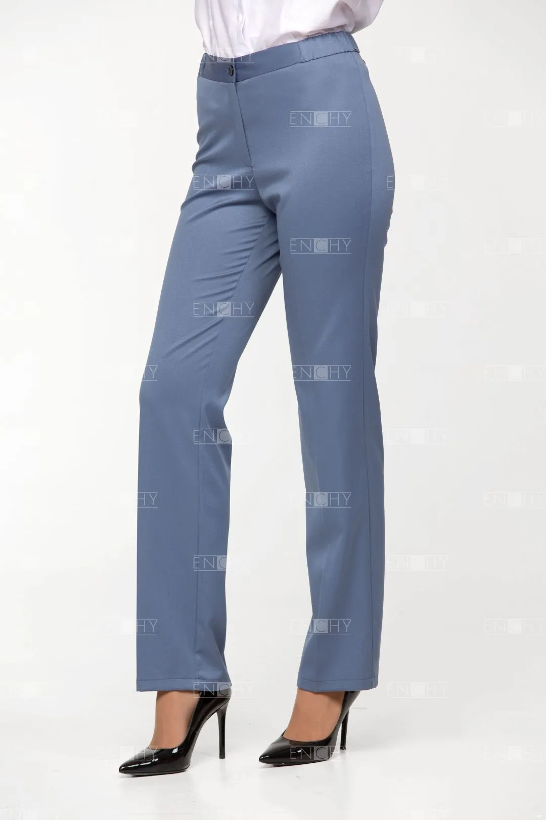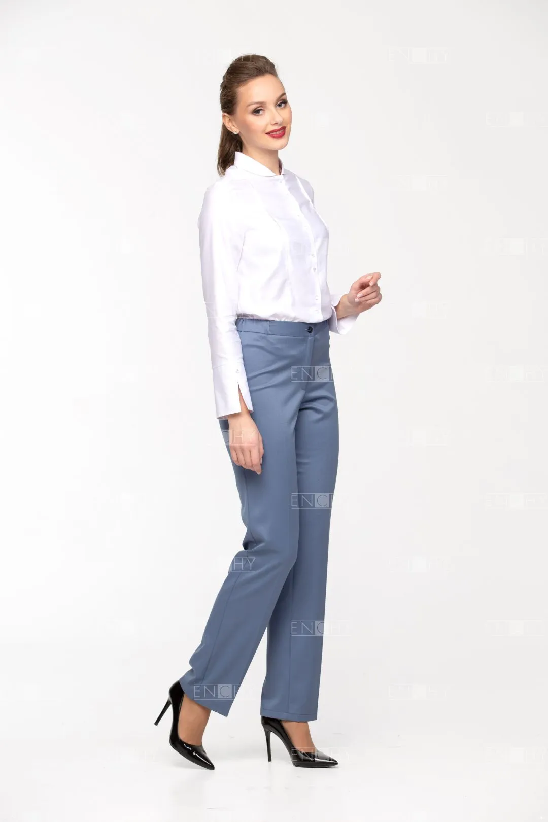 Брюки женские на притачном поясе. Длина брюк - закрывают щиколотку. Посадка брюк чуть ниже талии. В боковые части пояса вставлена резинка. Застежка брюк на гульфик и откосок на молнии, пояс на 1 пуговице. Передние и задние половинки брюк со стрелками. Задние половинки брюк с талиевыми вытачками. Низ брюк обработан двойной широкой подгибкой.