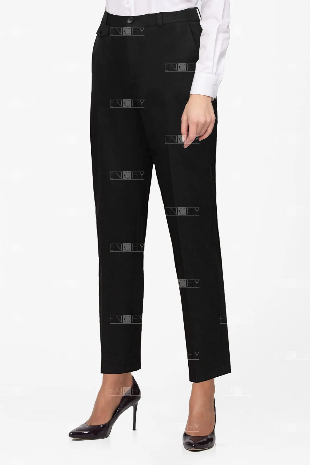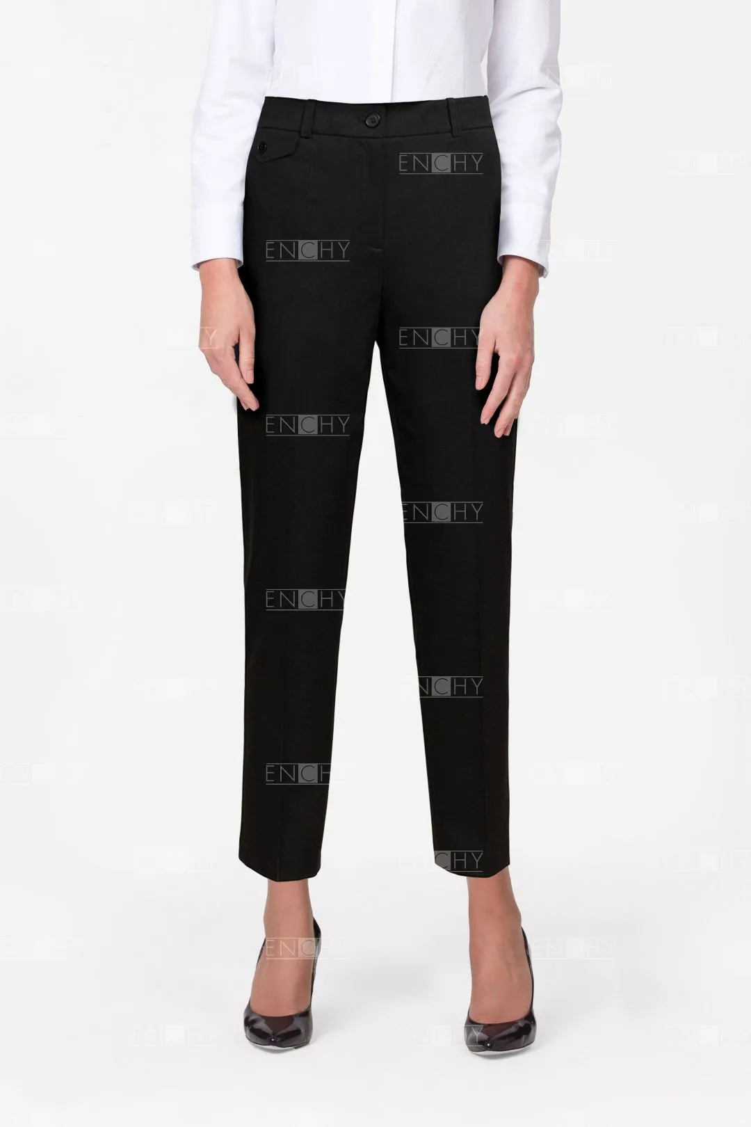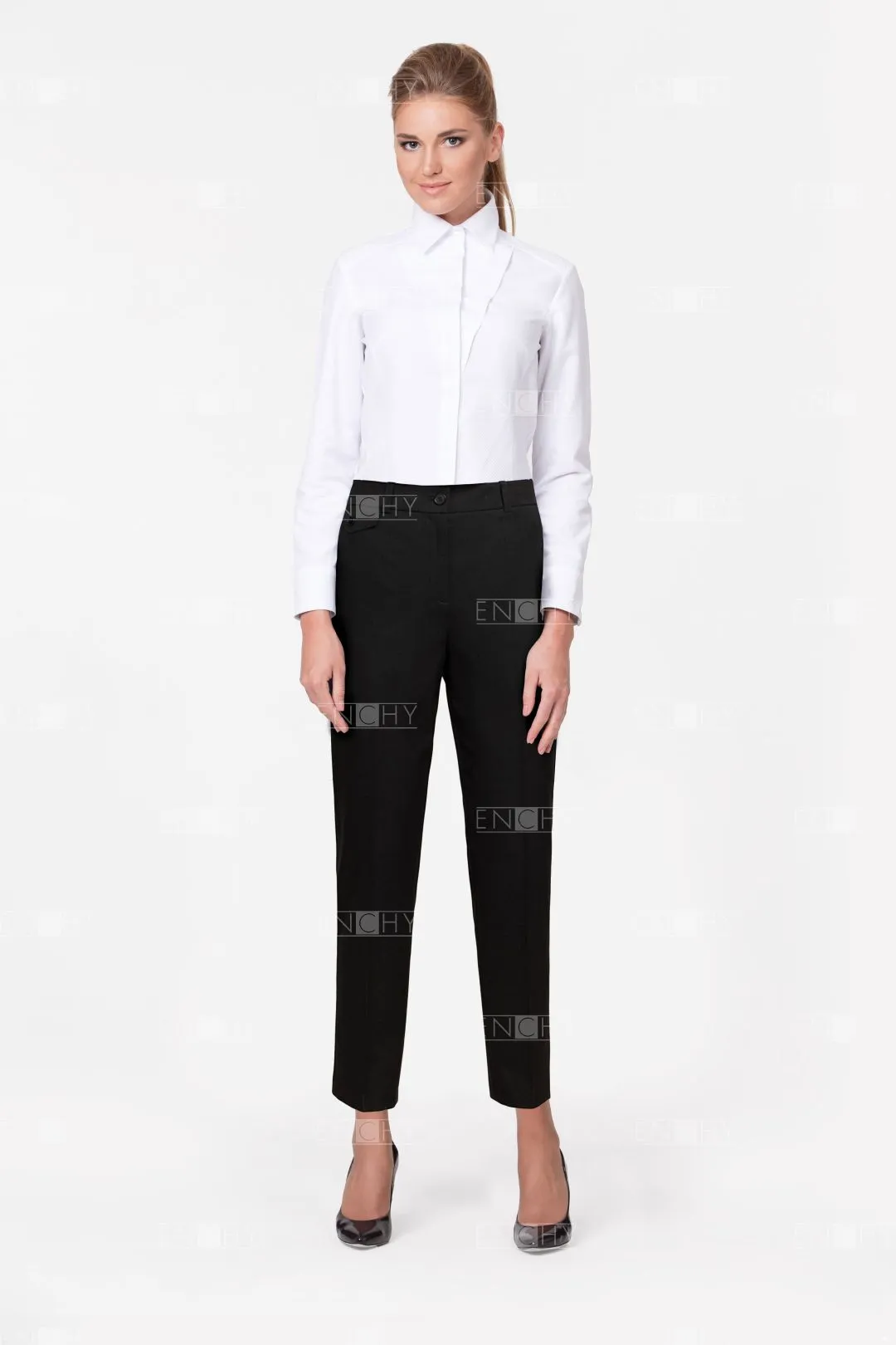 Прямые брюки "сигареты" на притачном поясе. Пояс застегивается на 1 пуговицу. На передних половинках брюк спроектированы карманы в отрезных бочках. Справа в шов притачивания пояса входит обтачной клапан с пуговицей. Брюки со стрелками. Эти стильные прямые брюки актуальной ширины подойдут для любой комплекции!