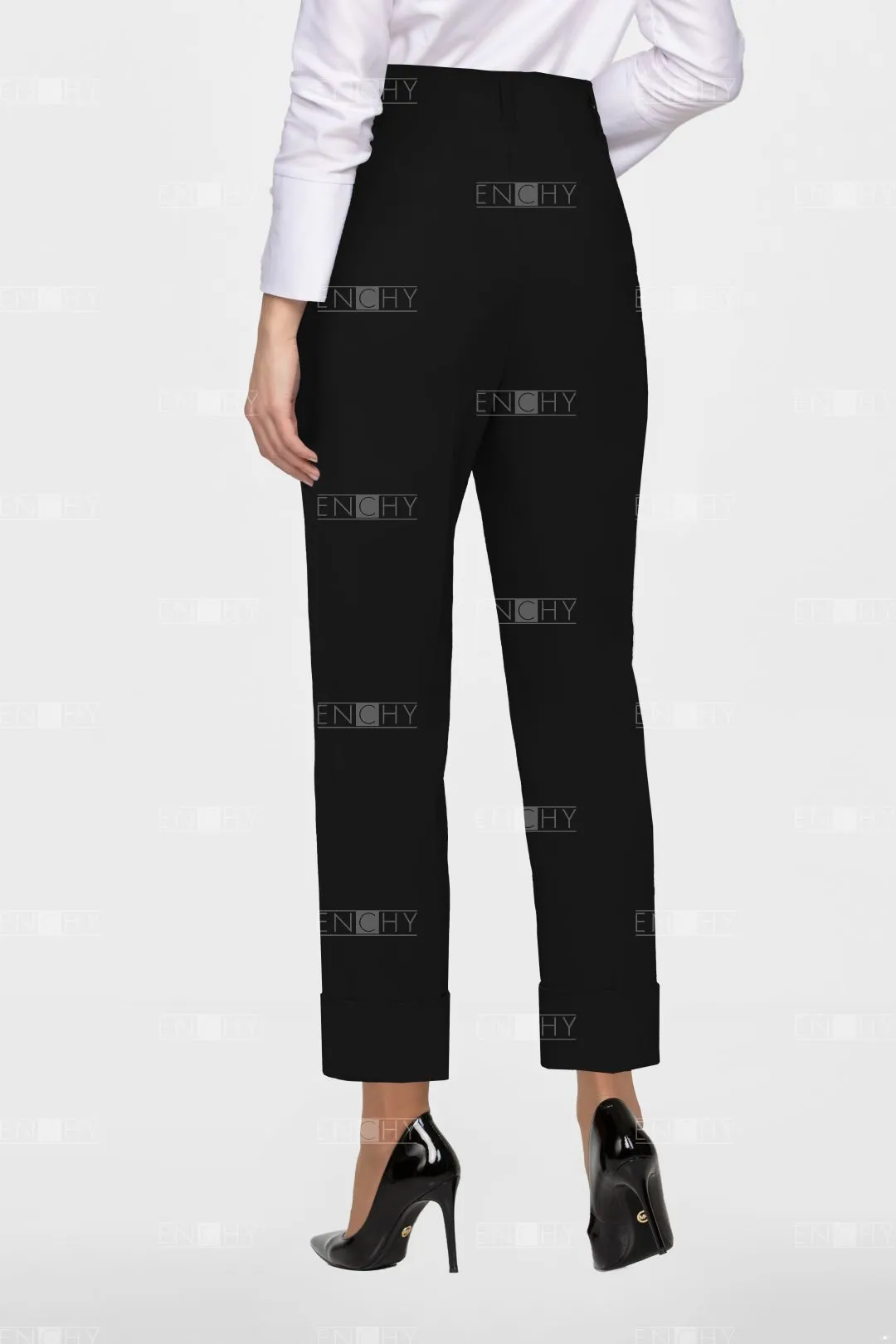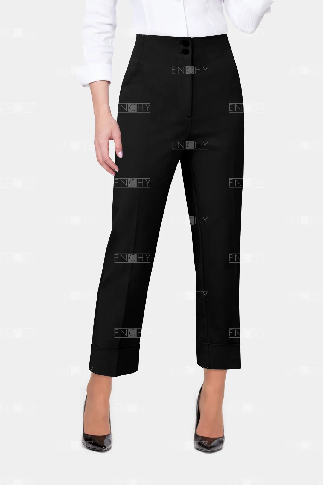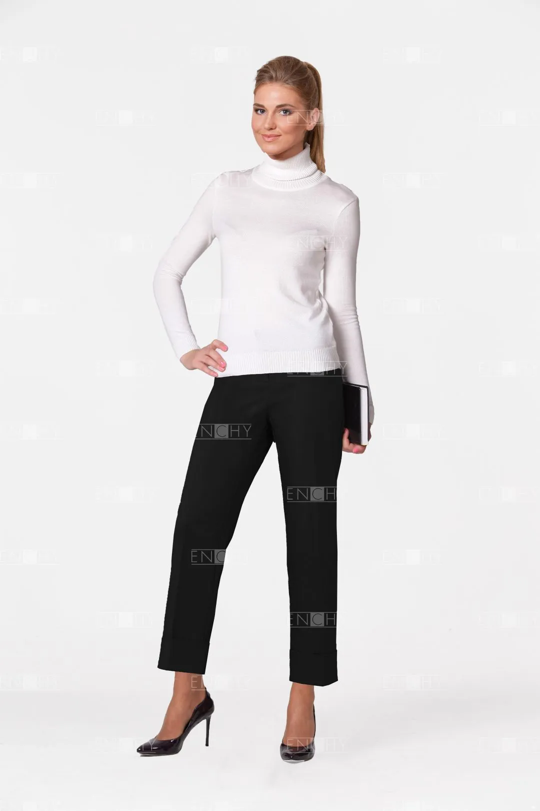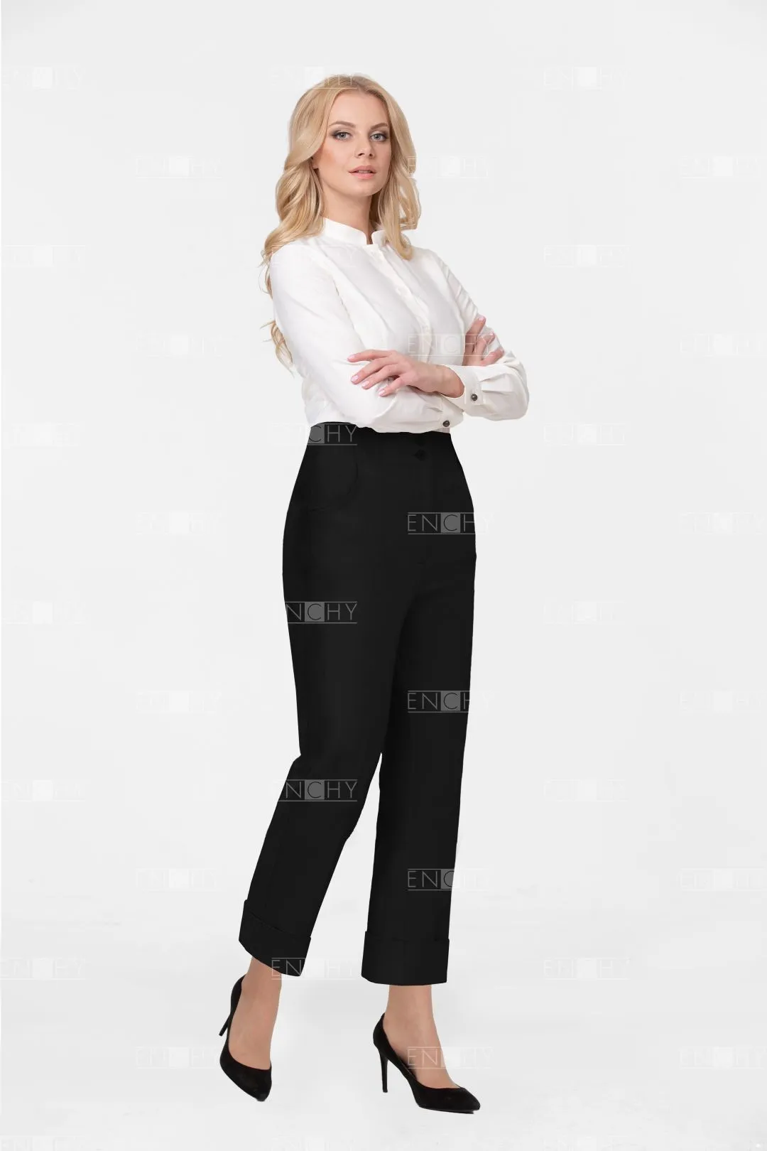 Стильные брюки с высокой посадкой, прямые, укороченные. По низу широкий манжет. Цельнокроенный пояс застегивается на 2 пуговицы, гульфик и откосок. Ультрамодная модель - идеальная для летнего лука.