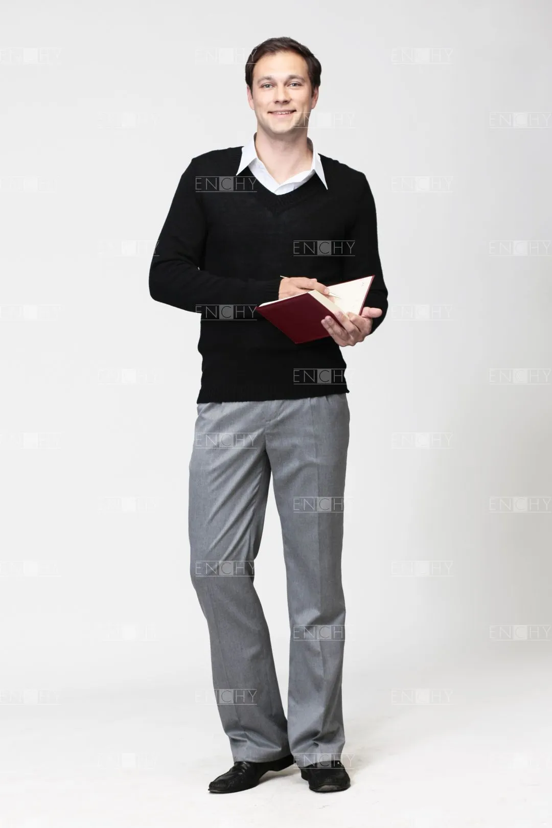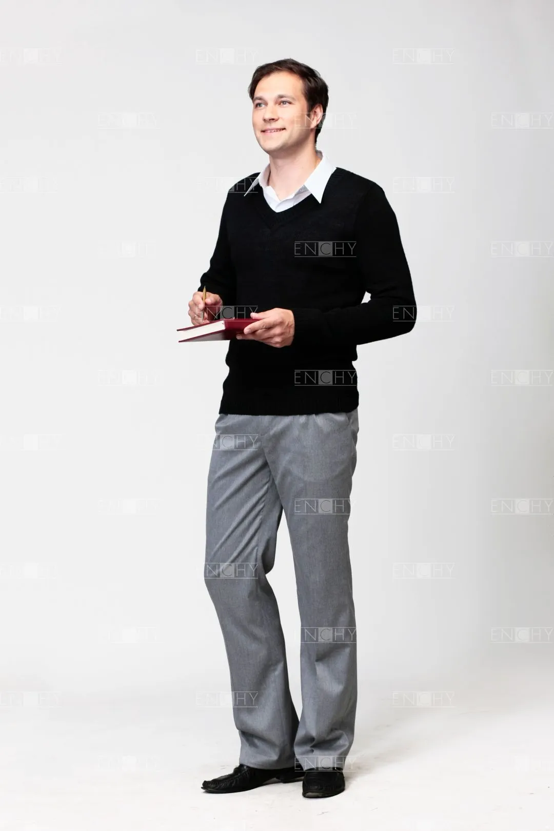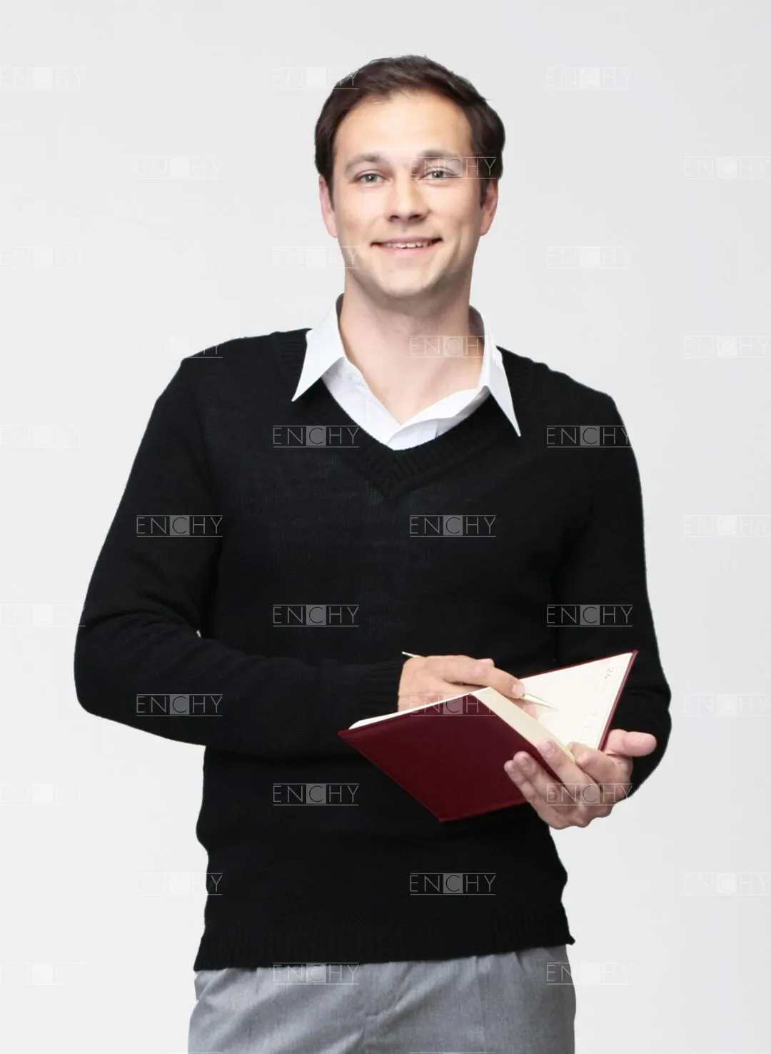 Вязаный джемпер с углубленным V-образным вырезом станет отличным дополнением к корпоративному мужскому комплекту.