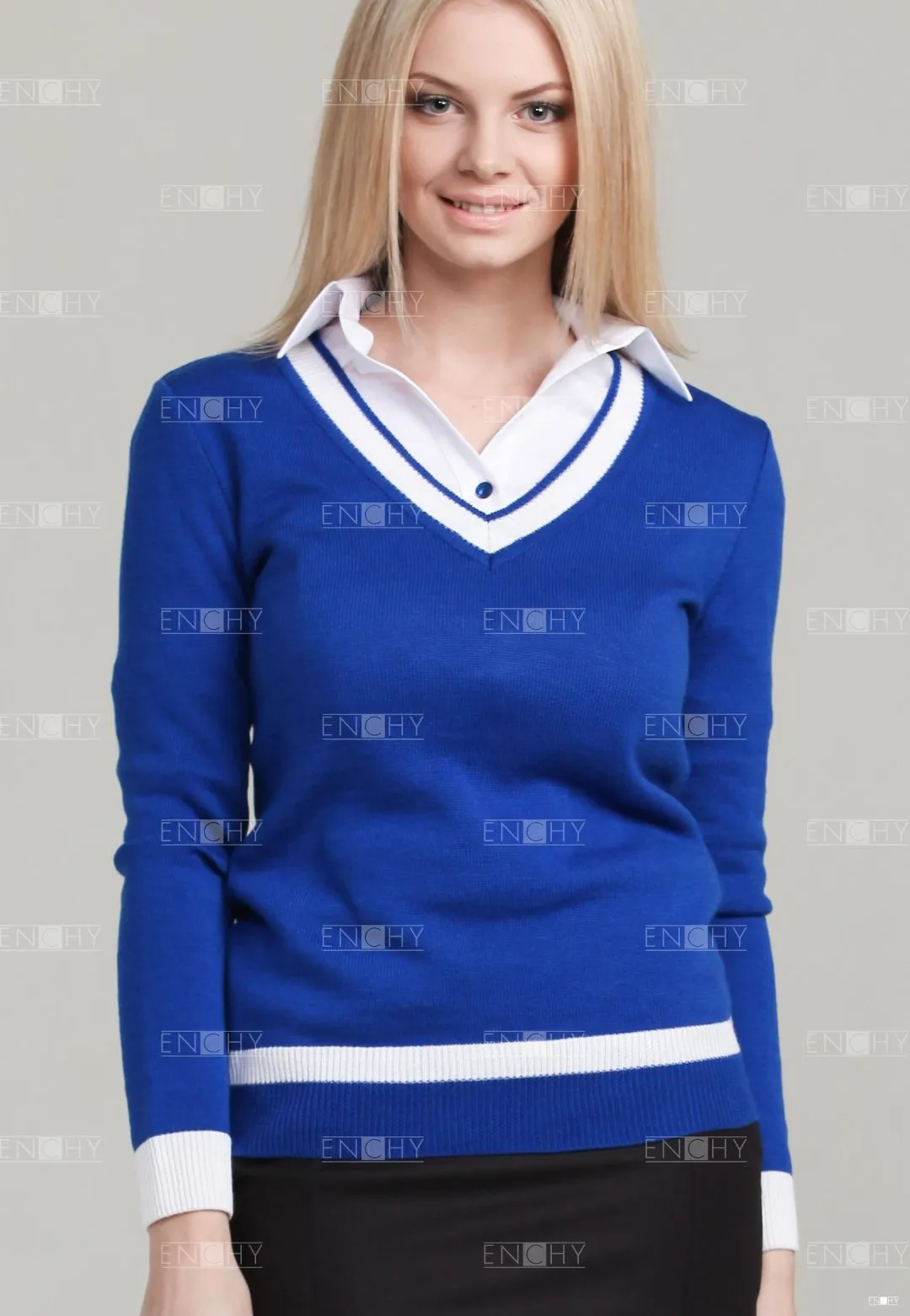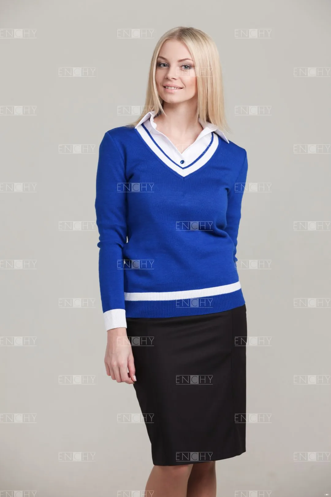 Непринужденный корпоративный стиль создает джемпер с V-образным вырезом. Джемпер украшают контрастные полоски и манжеты, которые могут быть выполнены в соответствии с вашим брендбуком (вязка 1/1). Незаменимая модель в зимнем форменном комплекте.