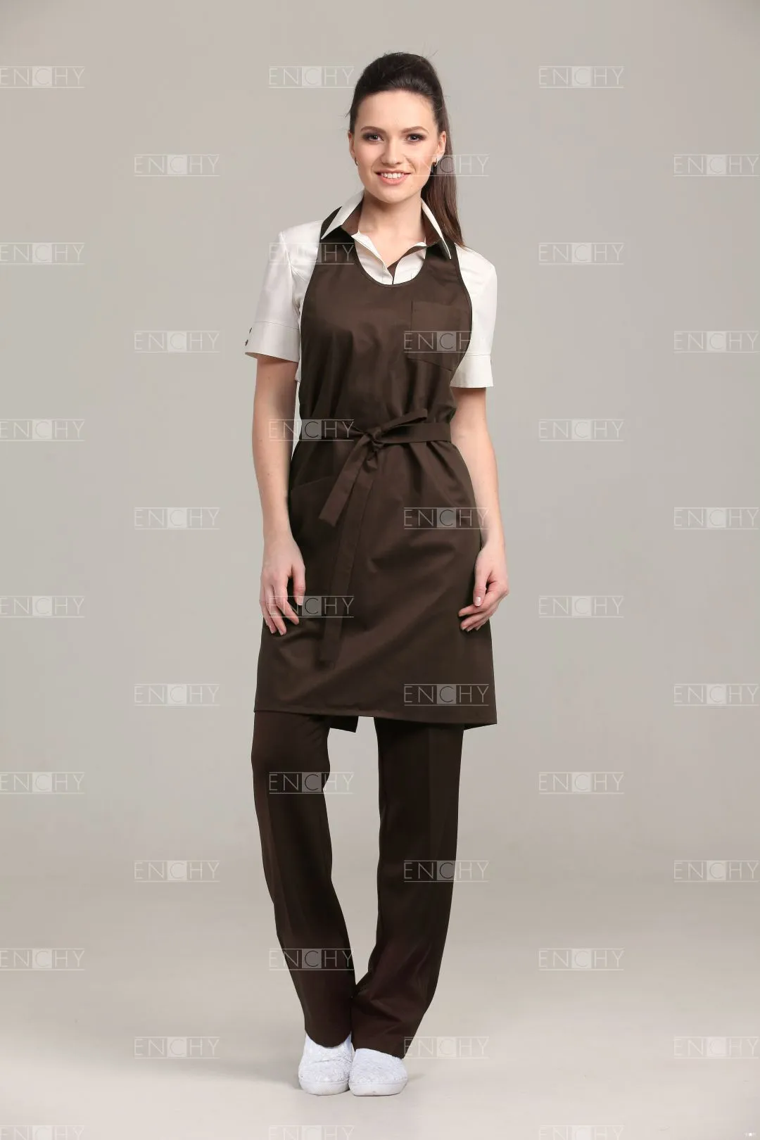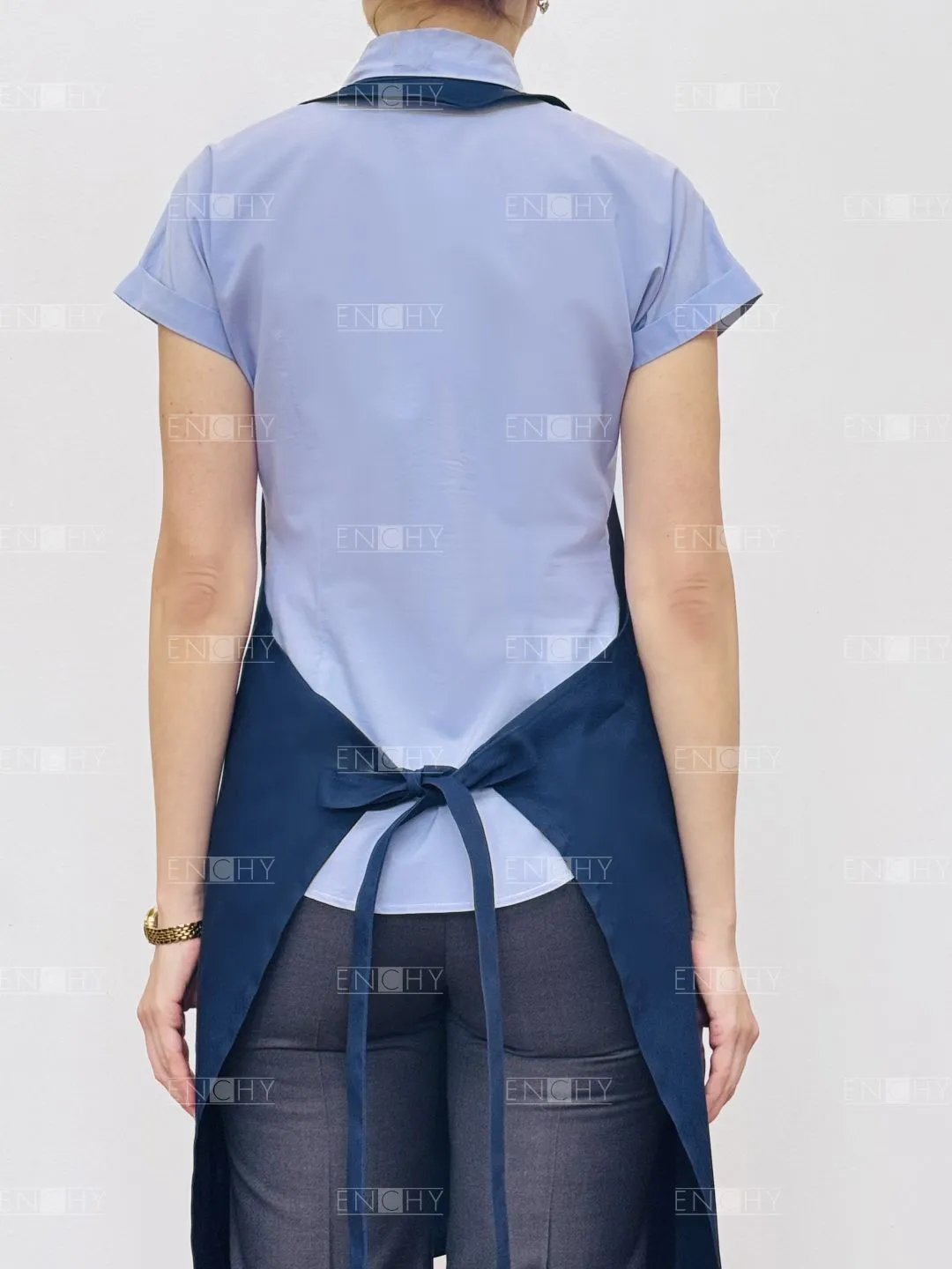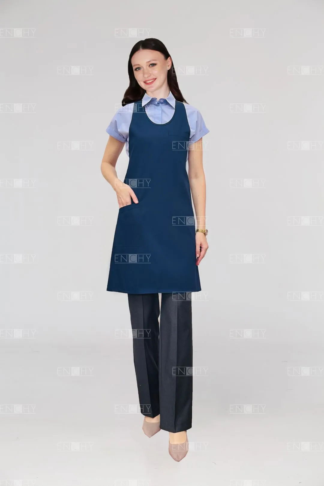 Фартук с цельнокроеной грудкой и широкой цельная лямкой вокруг шеи. Вырез фартука окантован, кант можно выполнить в контрастном цвете. Фартук с верхним нагрудным карманом и боковым карманом с наклонным входом. Фартук завязывается сзади или спереди.