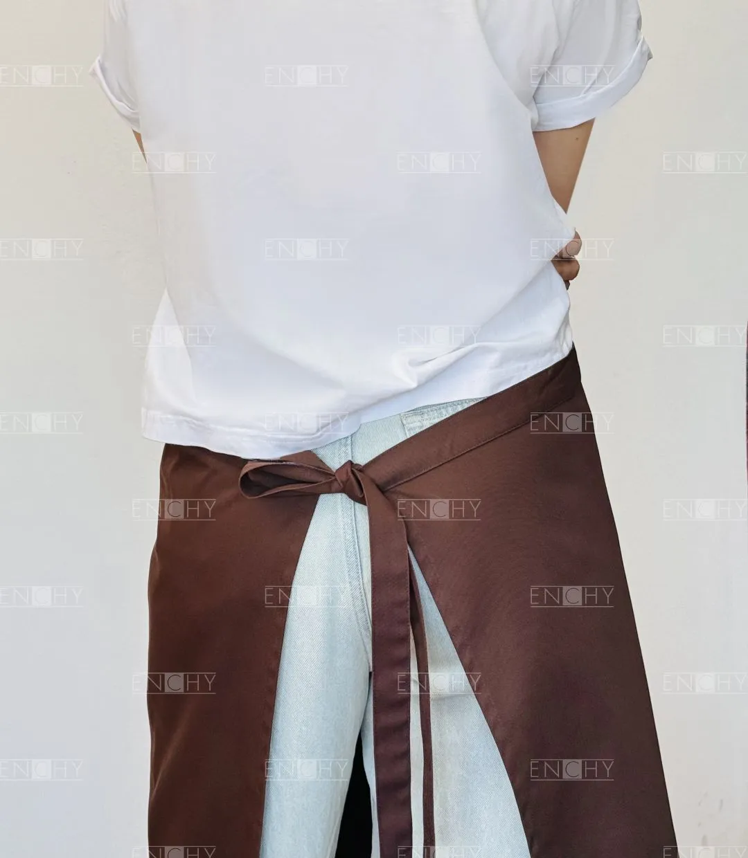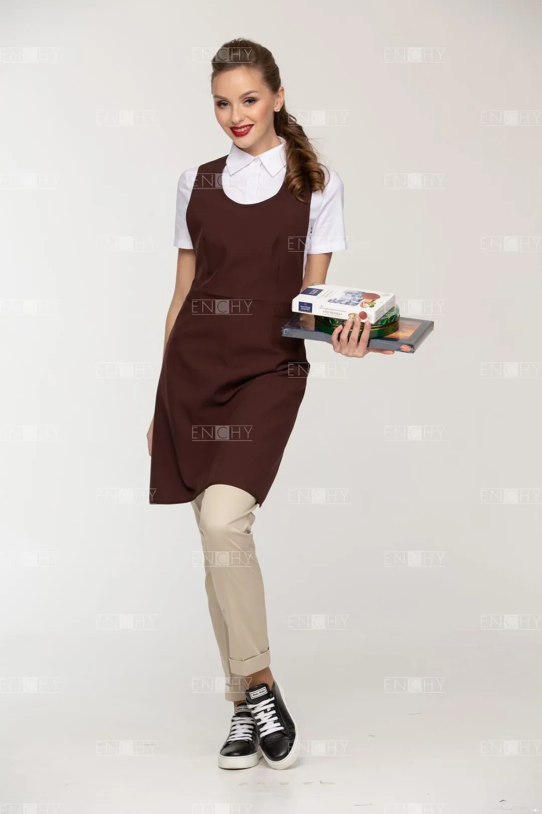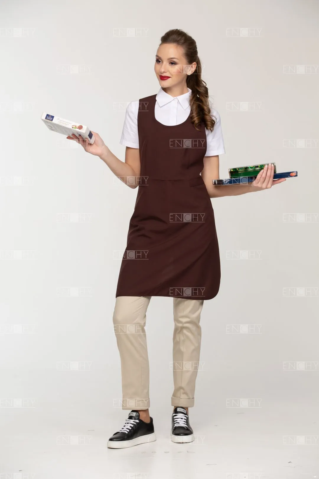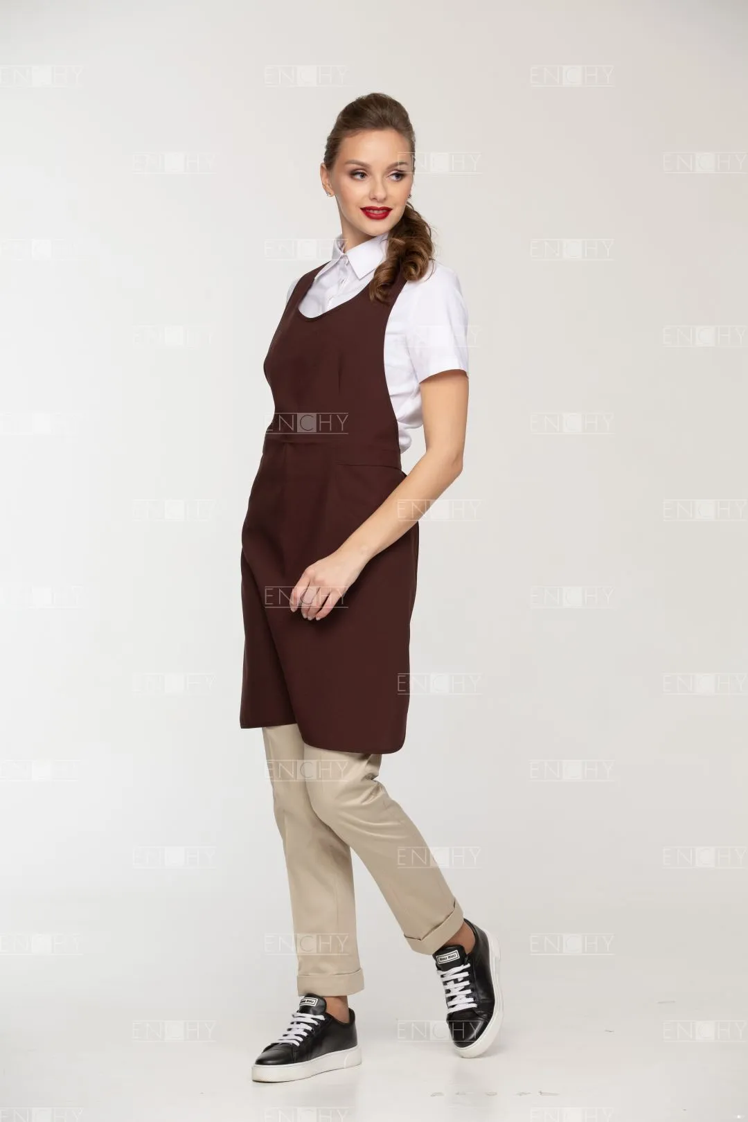 Удобный фартук с кокеткой-пелериной сзади, которая застегивается на 3 пуговицы. Фартук с декоративными рельефами и поясом, завязывающимся сзади. Окантовку и пояс можно выполнить в контрастном цвете.