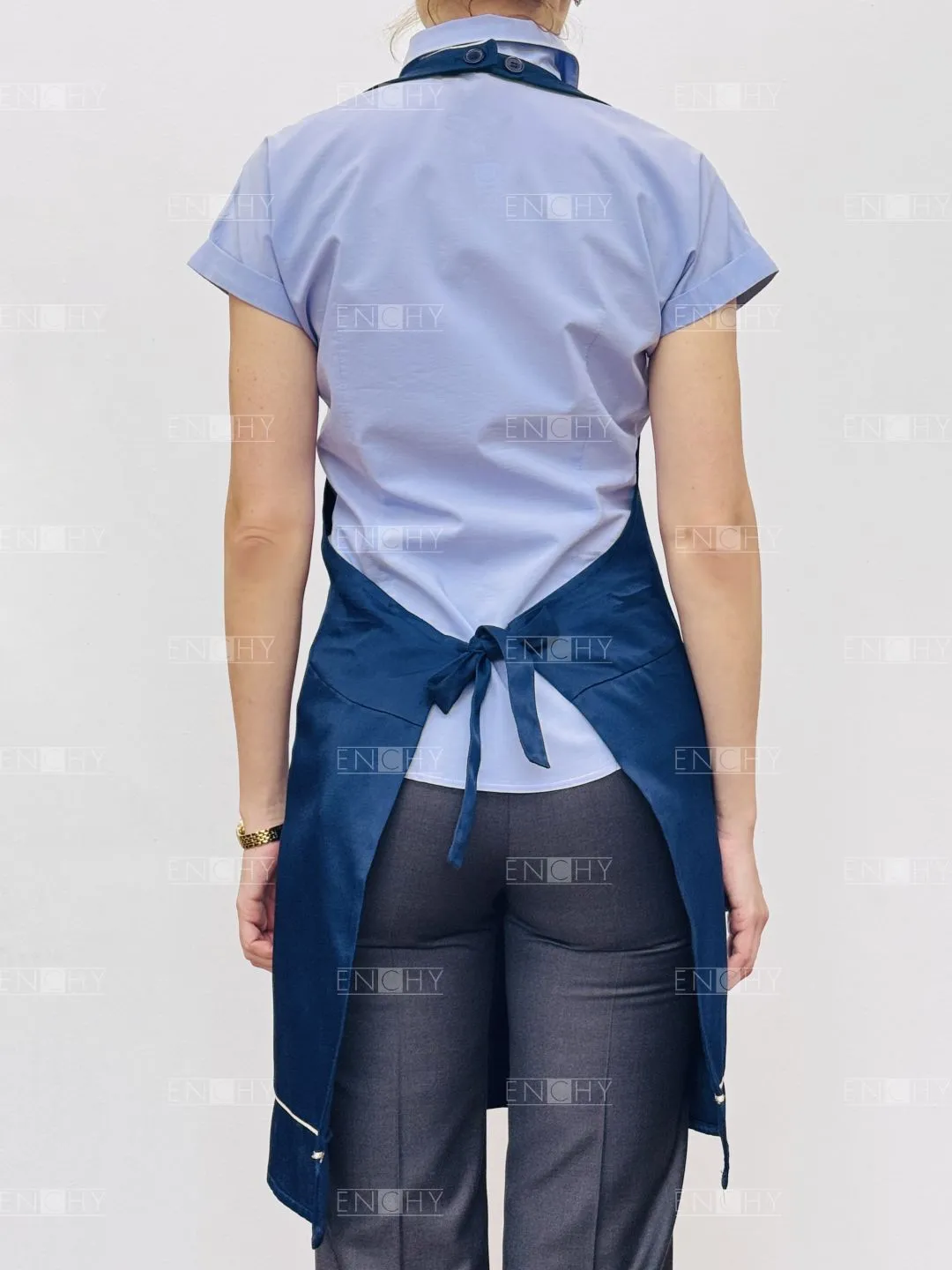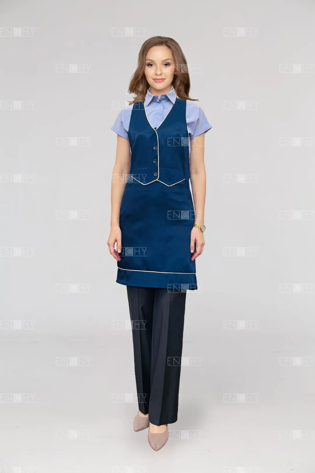 Стильный фартук с имитацией жилета - эффектный вариант для официантов. Фартук завязывается сзади, лямка через шею регулируется с помощью пуговиц. Контрастный кант подчеркнет оригинальность модели, а вышивка расскажет о вашей имиджевой составляющей.